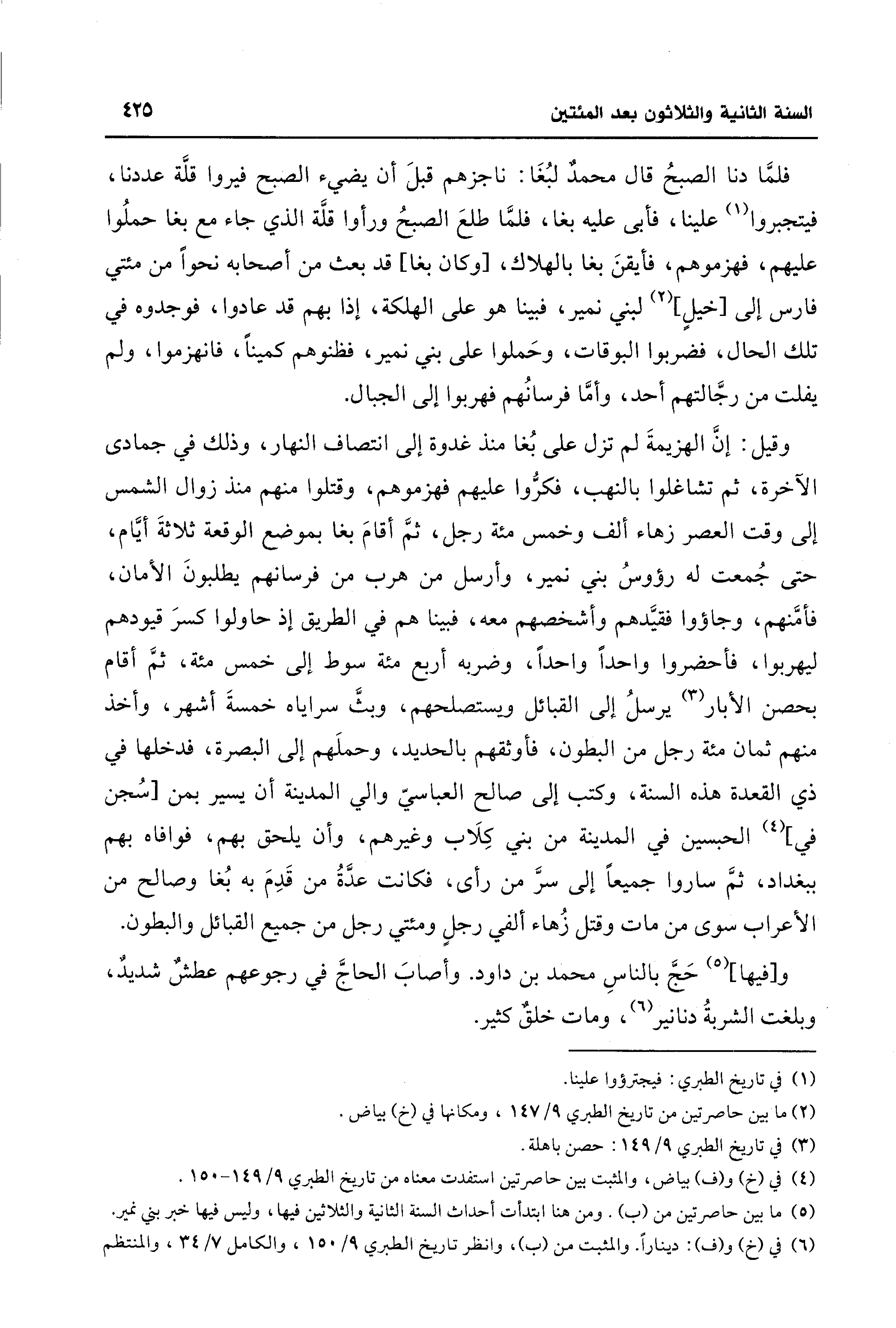 وقيل: إنَّ الهزيمةَ لم تزل على بُغا منذ غدوة إلى انتصاف النهار، وذلك في جمادى الآخرة، ثم تشاغلوا بالنهب، فكرُّوا عليهم فهزموهم، وقتلوا منهم منذ زوال الشمس إلى وقت العصر زهاء ألف وخمس مئة رجل، ثمَّ أقامَ بغا بموضع الوقعة ثلاثةَ أيَّام، حتَّى جُمعت له رؤوسُ بني نمير، وأرسل من هرب من فرسانهم يطلبونَ الآبيان، فأمَّنهم، وجاؤوا فقيَّدهم وأشخصهم معه، فبينا هم في الطريق إذ حاولوا كسرَ قيودهم ليهربوا، فأحضروا واحدًا واحدًا، وضربه أربع مئة سوط إلى خمس مئة، ثمَّ أقام بحصن الأبار (¬3) يرسلُ إلى القبائل ويستصلحهم، وبثَّ سراياه خمسةَ أشهر، وأخذ منهم ثمان مئة رجل من البطون، فأوثقهم بالحديد، وحملَهم إلى البصرة، فدخلها في ذي القعدة هذه السنة، وكتب إلى صالح العباسيّ والي المدينة أن يسير بمن [سُجن في] (¬4) الحبسين في المدينة من بني كِلَاب وغيرهم، وأن يلحق بهم، فوافاه بهم ببغداد، ثمَّ ساروا جميعًا إلى سرَّ من رأى، فكانت عدَّةُ من قَدِمَ به بُغا وصالح من الأعراب سوى من مات وقتل زُهاء ألفي رجلٍ ومئتي رجل من جميع القبائل والبطون.