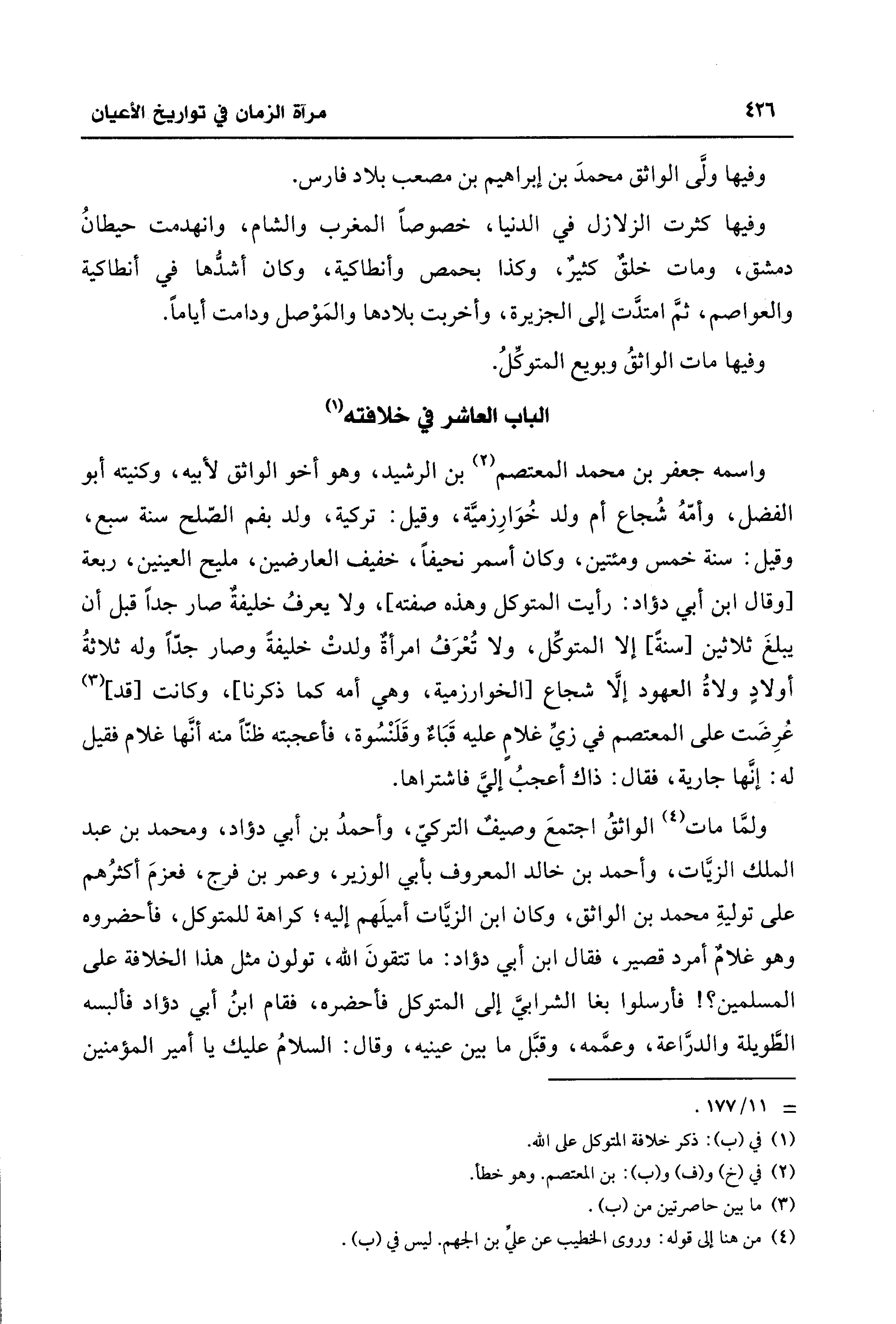 ولمَّا مات (¬4) الواثقُ اجتمعَ وصيفٌ التركيّ، وأحمدُ بن أبي دؤاد، ومحمد بن عبد الملك الزيَّات، وأحمد بن خالد المعروف بأبي الوزير، وعمر بن فرج، فعزمَ أكثرُهم على توليةِ محمد بن الواثق، وكان ابن الزيَّات أميلَهم إليه؛ كراهة للمتوكل، فأحضروه وهو غلامٌ أمرد قصير، فقال ابن أبي دؤاد: ما تتقونَ الله، تولون مثل هذا الخلافة على المسلمين؟ ! فأرسلوا بغا الشرابيَّ إلى المتوكل فأحضره، فقام ابنُ أبي دؤاد فألبسه الطَّويلة والدرَّاعة، وعمَّمه، وقبَّل ما بين عينيه، وقال: السلامُ عليك يا أمير المؤمنين