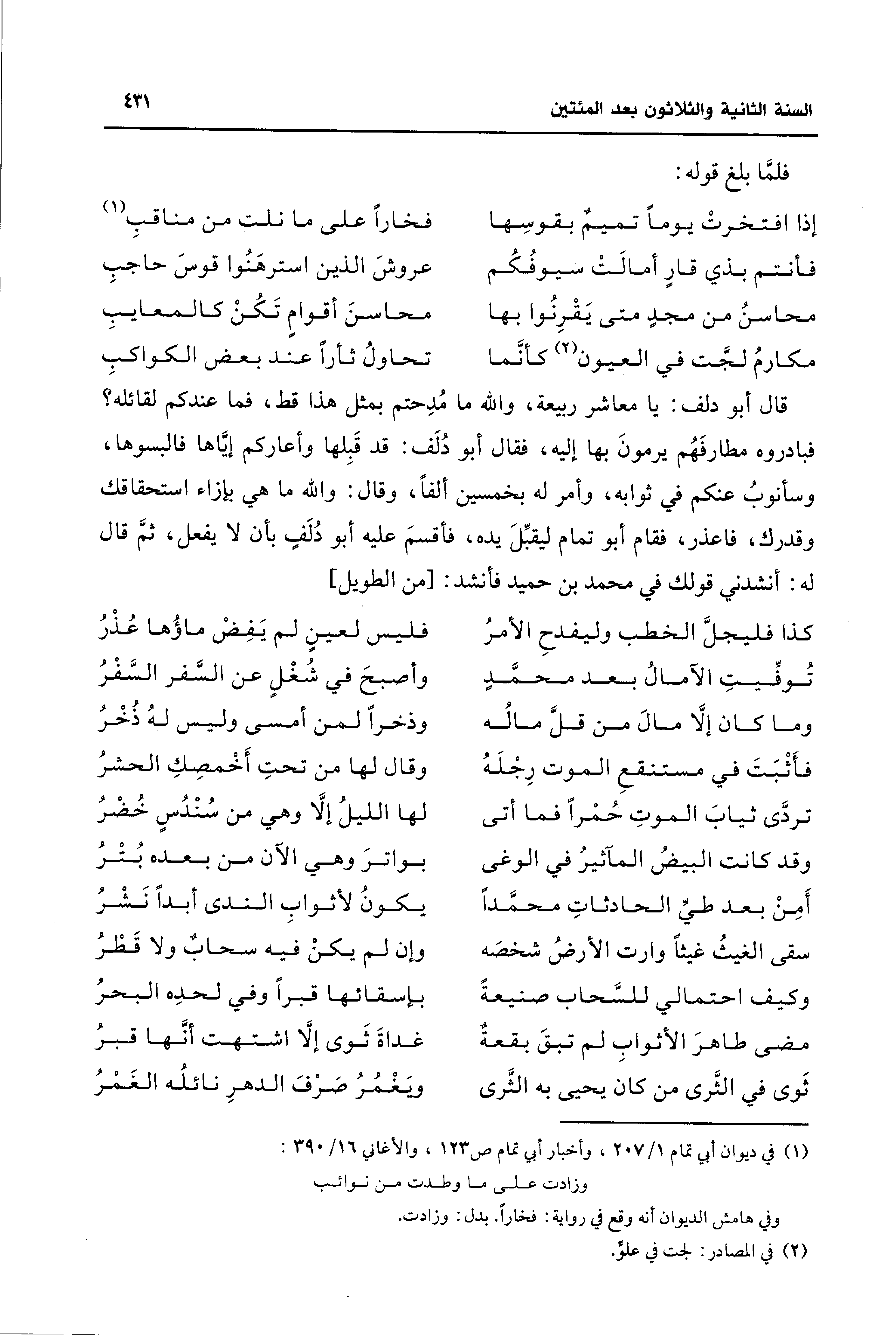 قال أبو دلف: يا معاشر ربيعة، والله ما مُدِحتم بمثل هذا قط، فما عندكم لقائله؟ فبادروه مطارفَهُم يرمونَ بها إليه، فقال أبو دُلَف: قد قَبِلها وأعاركم إيَّاها فالبسوها، وسأنوبُ عنكم في ثوابه، وأمر له بخمسين ألفًا، وقال: والله ما هي بإزاء استحقاقك وقدرك، فاعذر، فقام أبو تمام ليقبِّلَ يده، فأقسمَ عليه أبو دُلَفٍ بأن لا يفعل، ثمَّ قال له: أنشدني قولك في محمد بن حميد فأنشد: [من الطويل]