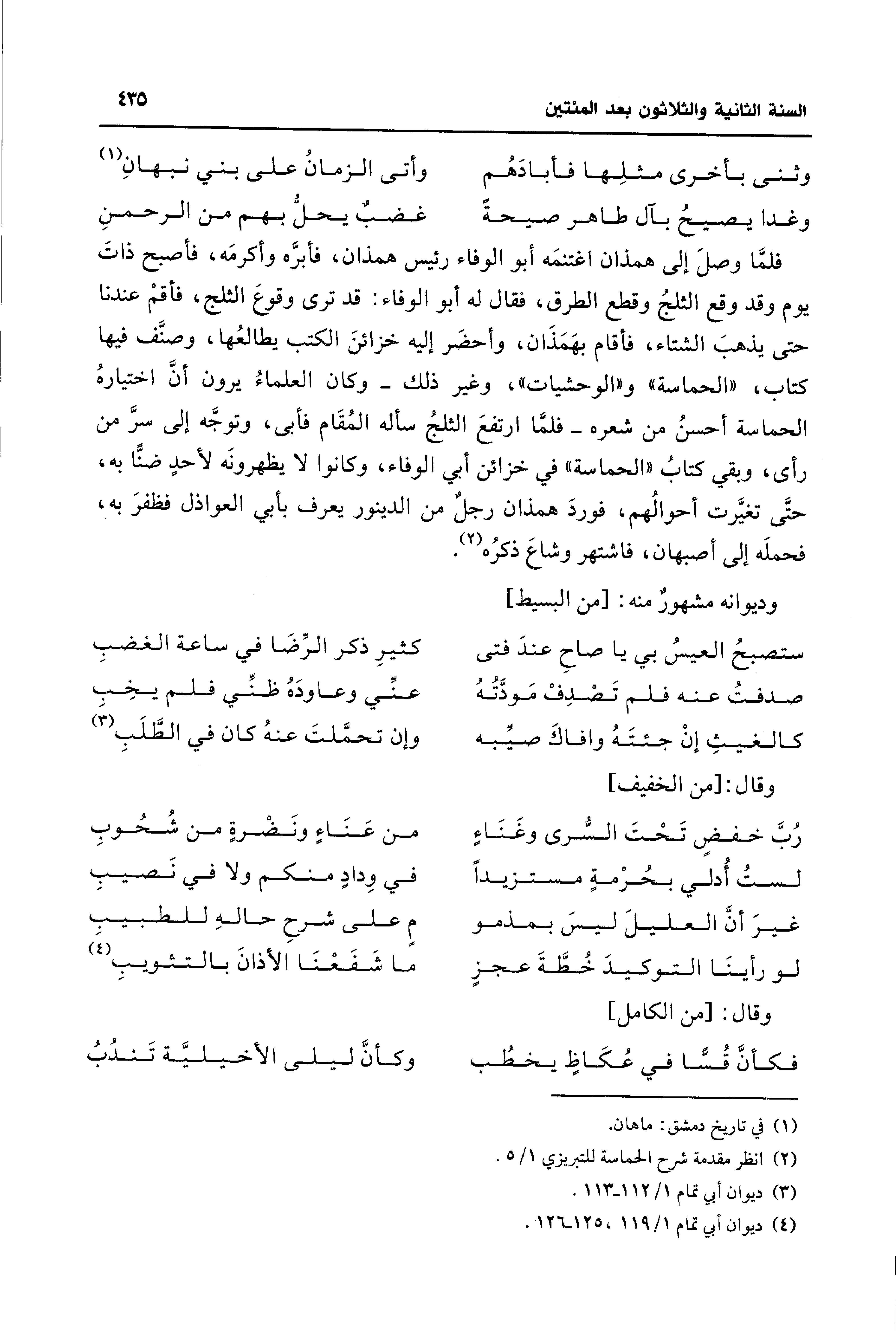 فلمَّا وصلَ إلى همذان اغتنمَه أبو الوفاء رئيس همذان، فأبرَّه وأكرمَه، فأصبح ذاتَ يوم وقد وقع الثلجُ وقطع الطرق، فقال له أبو الوفاء: قد ترى وقوعَ الثلج، فأقمْ عندنا حتَّى يذهبَ الشتاء، فأقام بهَمَذَان، وأحضر إليه خزائنَ الكتب يطالعُها، وصنَّف فيها كتاب، "الحماسة" و"الوحشيات"، وغير ذلك -وكان العلماءُ يرون أنَّ اختيارهُ الحماسة أحسنُ من شعره- فلمَّا ارتفعَ الثلجُ سأله المُقَام فأبى، وتوجَّه إلى سرَّ من رأى، وبقي كتابُ "الحماسة" في خزائن أبي الوفاء، وكانوا لا يظهرونَه لأحدٍ ضنًّا به، حتَّى تغيَّرت أحوالُهم، فوردَ همذان رجلٌ من الدينور يعرف بأبي العواذل فظفرَ به، فحملَه إلى أصبهان، فاشتهر وشاعَ ذكرُه (¬2).