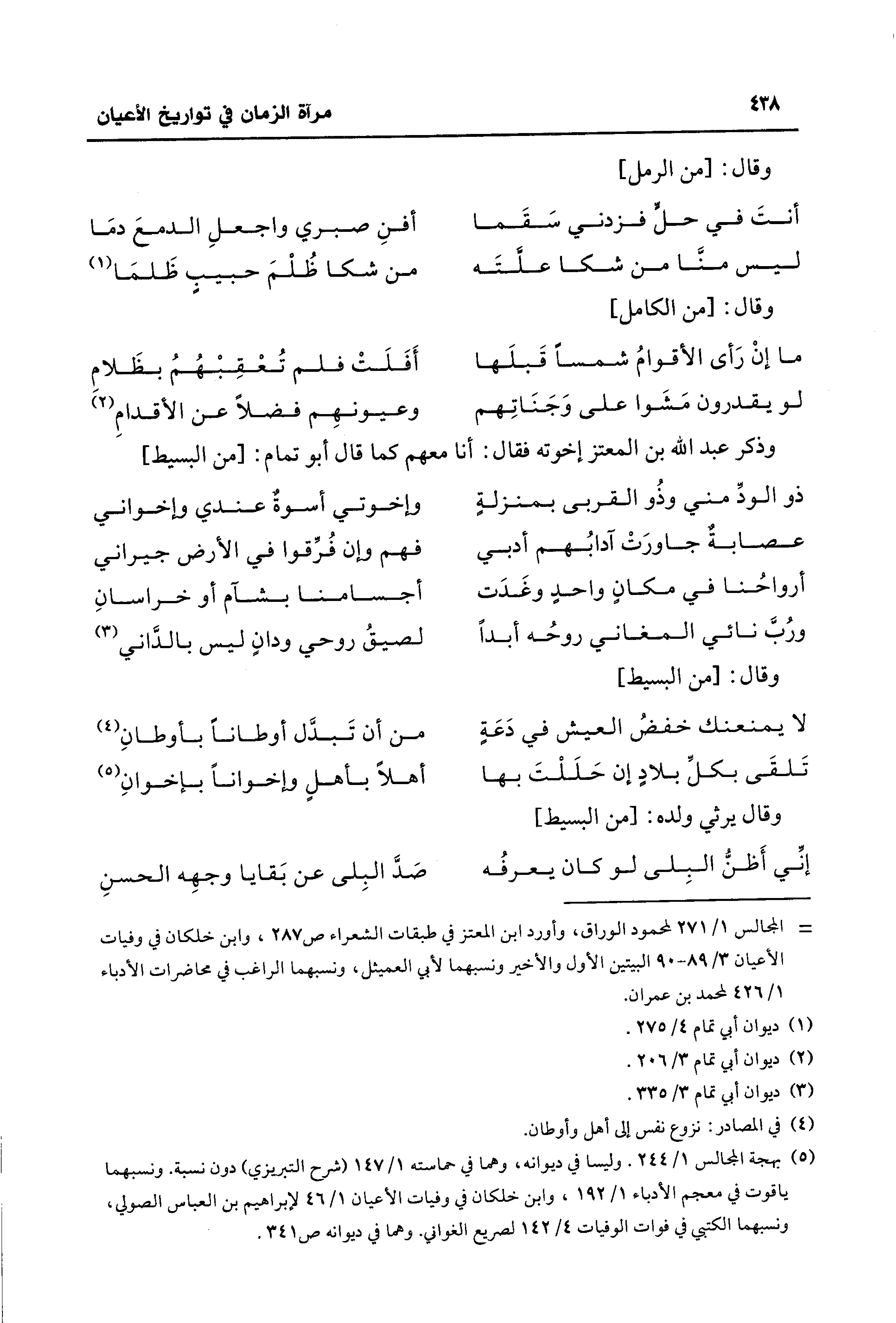 = المجالس 1/ 271 لمحمود الوراق، وأورد ابن المعتز في طبقات الشعراء ص 287، وابن خلكان في وفيات الأعيان 3/ 89 - 90 البيتين الأول والأخير ونسبهما لأبي العميثل، ونسبهما الراغب في محاضرات الأدباء 1/ 426 لمحمد بن عمران.