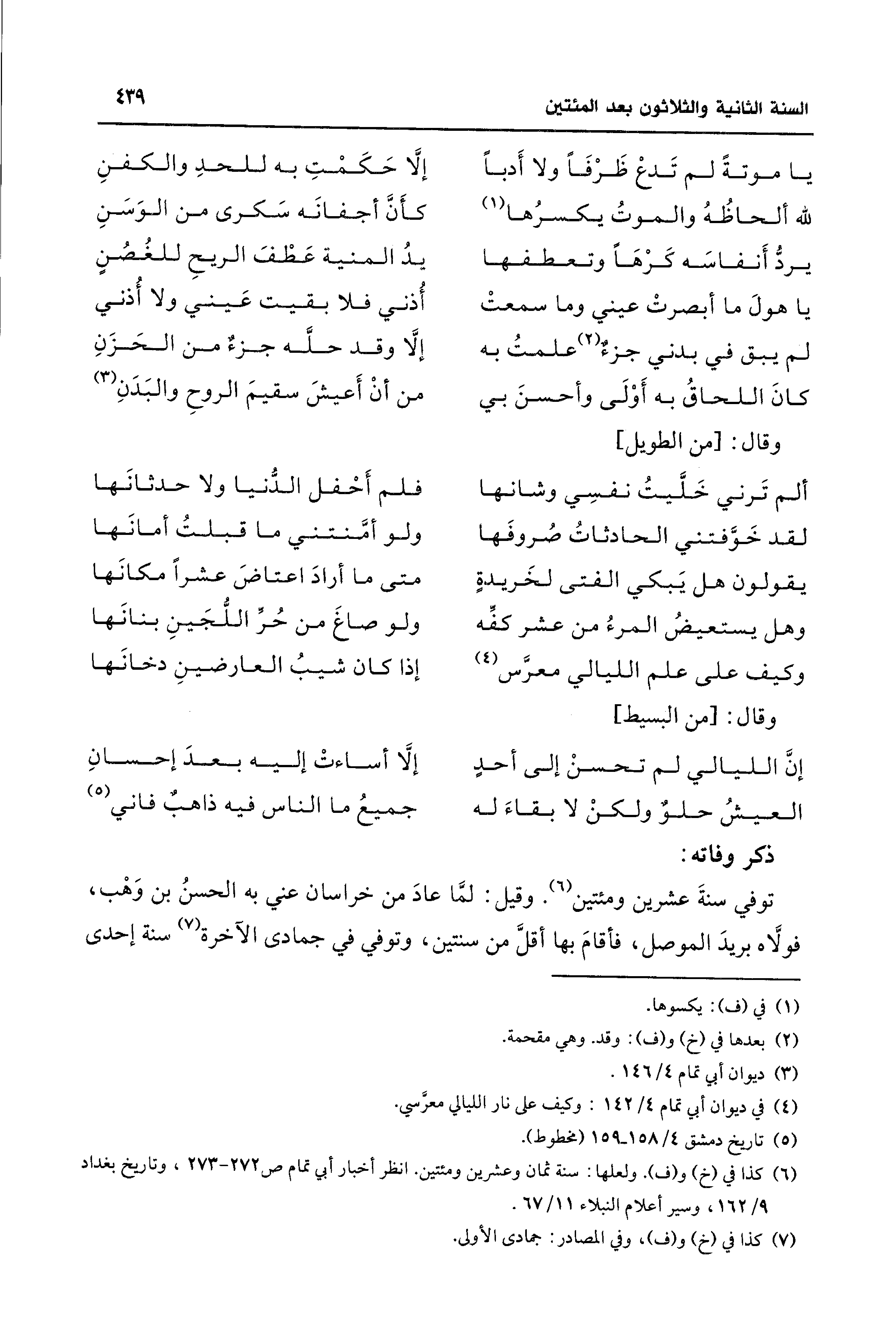 (¬6) كذا في (خ) و (ف). ولعلها: سنة ثمان وعشرين ومئتين. انظر أخبار أبي تمام ص 272 - 273، وتاريخ بغداد 9/ 162، وسير أعلام النبلاء 11/ 67.