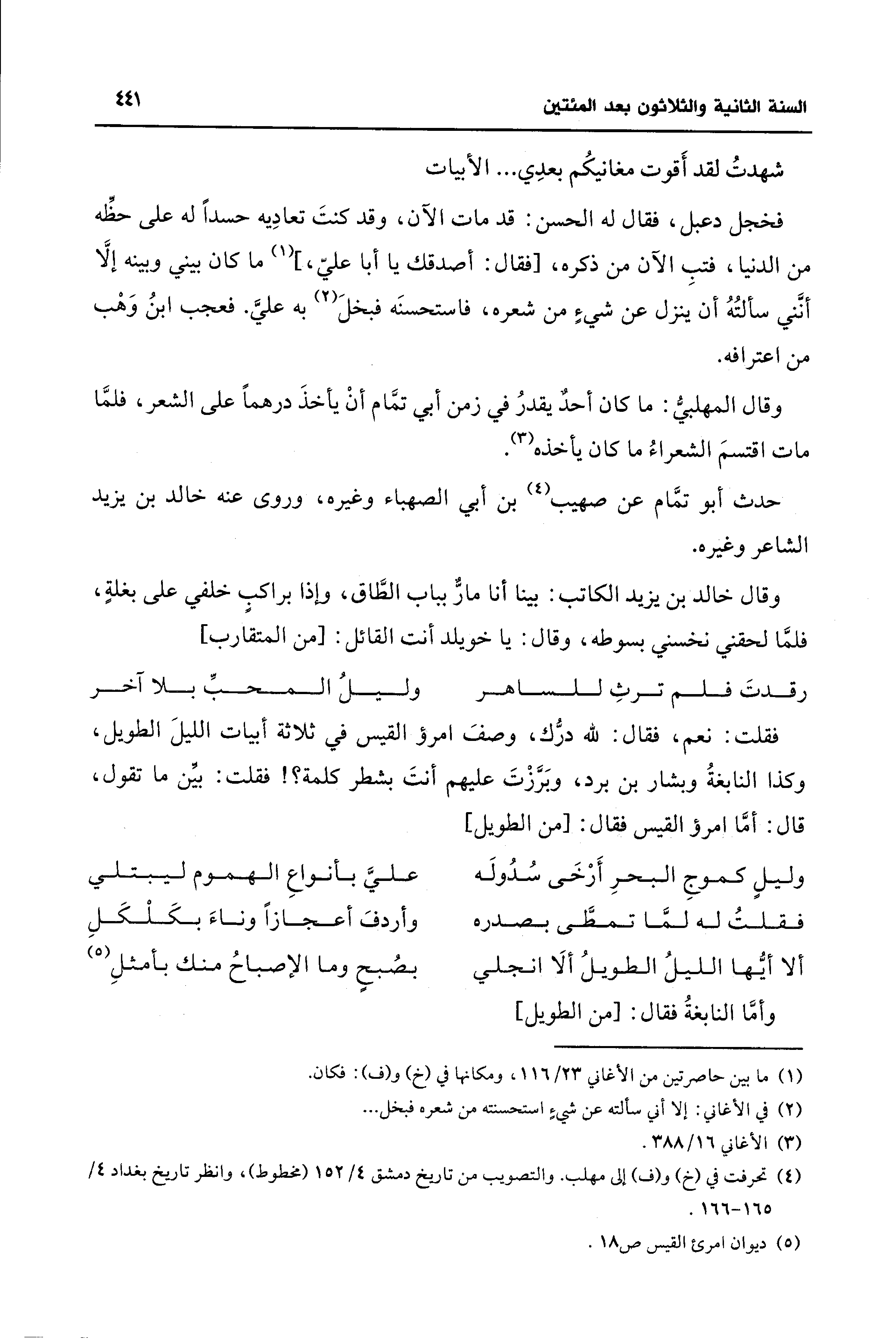 فخجل دعبل، فقال له الحسن: قد مات الآن، وقد كنتَ تعادِيه حسدًا له على حظِّه من الدنيا، فتبِ الآن من ذكره، [فقال: أصدقك يا أبا عليّ، ] (¬1) ما كان بيني وبينه إلَّا أنَّني سألتُهُ أن ينزل عن شيءٍ من شعره، فاستحسنَه فبخلَ (¬2) به عليَّ. فعجب ابنُ وَهْب من اعترافه.