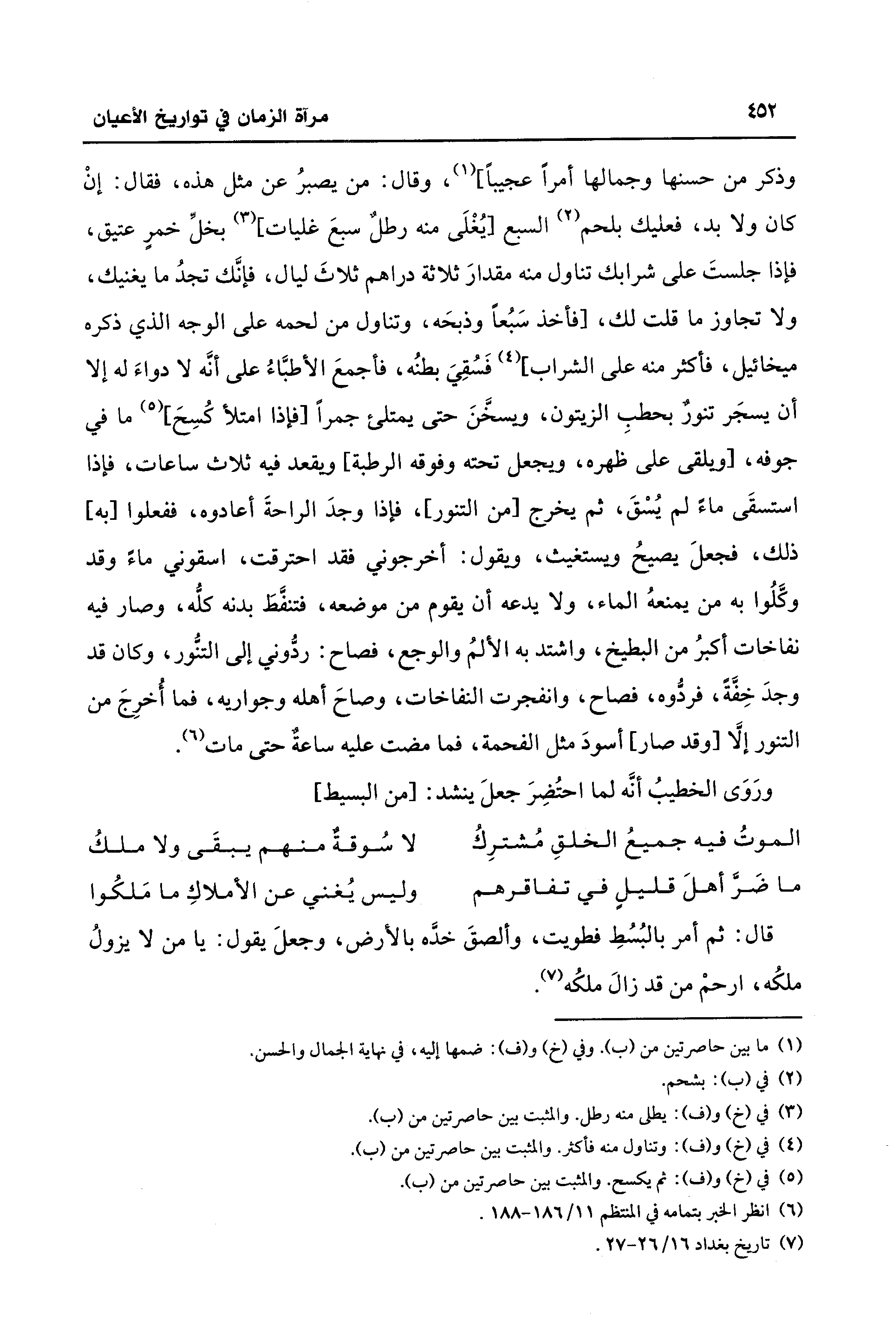 وذكر من حسنها وجمالها أمرًا عجيبًا]، (¬1)، وقال: من يصبرُ عن مثل هذه، فقال: إنْ كان ولا بد، فعليك بلحم (¬2) السبع [يُغْلَى منه رطلٌ سبعَ غليات] (¬3) بخلِّ خمرٍ عتيق، فإذا جلستَ على شرابك تناول منه مقدارَ ثلاثة دراهم ثلاثَ ليال، فإنَّك تجدُ ما يغنيك، ولا تجاوز ما قلت لك، [فأخذ سَبُعًا وذبحَه، وتناول من لحمه على الوجه الذي ذكره ميخائيل، فأكثر منه على الشراب] (¬4) فَسُقِيَ بطنُه، فأجمعَ الأطبَّاءُ على أنَّه لا دواءَ له إلا أن يسجَر تنورٌ بحطبِ الزيتون، ويسخَّنَ حتى يمتلئ جمرًا [فإذا امتلأ كُسِحَ] (¬5) ما في جوفه، [ويلقى على ظهره، ويجعل تحته وفوقه الرطبة] ويقعد فيه ثلاث ساعات، فإذا استسقَى ماءً لم يُسْقَ، ثم يخرج [من التنور]، فإذا وجدَ الراحةَ أعادوه، ففعلوا [به] ذلك، فجعلَ يصيحُ ويستغيث، ويقول: أخرجوني فقد احترقت، اسقوني ماءً وقد وكَّلُوا به من يمنعهُ الماء، ولا يدعه أن يقوم من موضعه، فتنفَّطَ بدنه كلُّه، وصار فيه نفاخات أكبرُ من البطيخ، واشتد به الألمُ والوجع، فصاح: ردُّوني إلى التنُّور، وكان قد وجدَ خِفَّةً، فردُّوه، فصاح، وانفجرت النفاخات، وصاحَ أهله وجواريه، فما أُخرِجَ من التنور إلَّا [وقد صار] أسودَ مثل الفحمة، فما مضت عليه ساعةٌ حتى مات (¬6).
