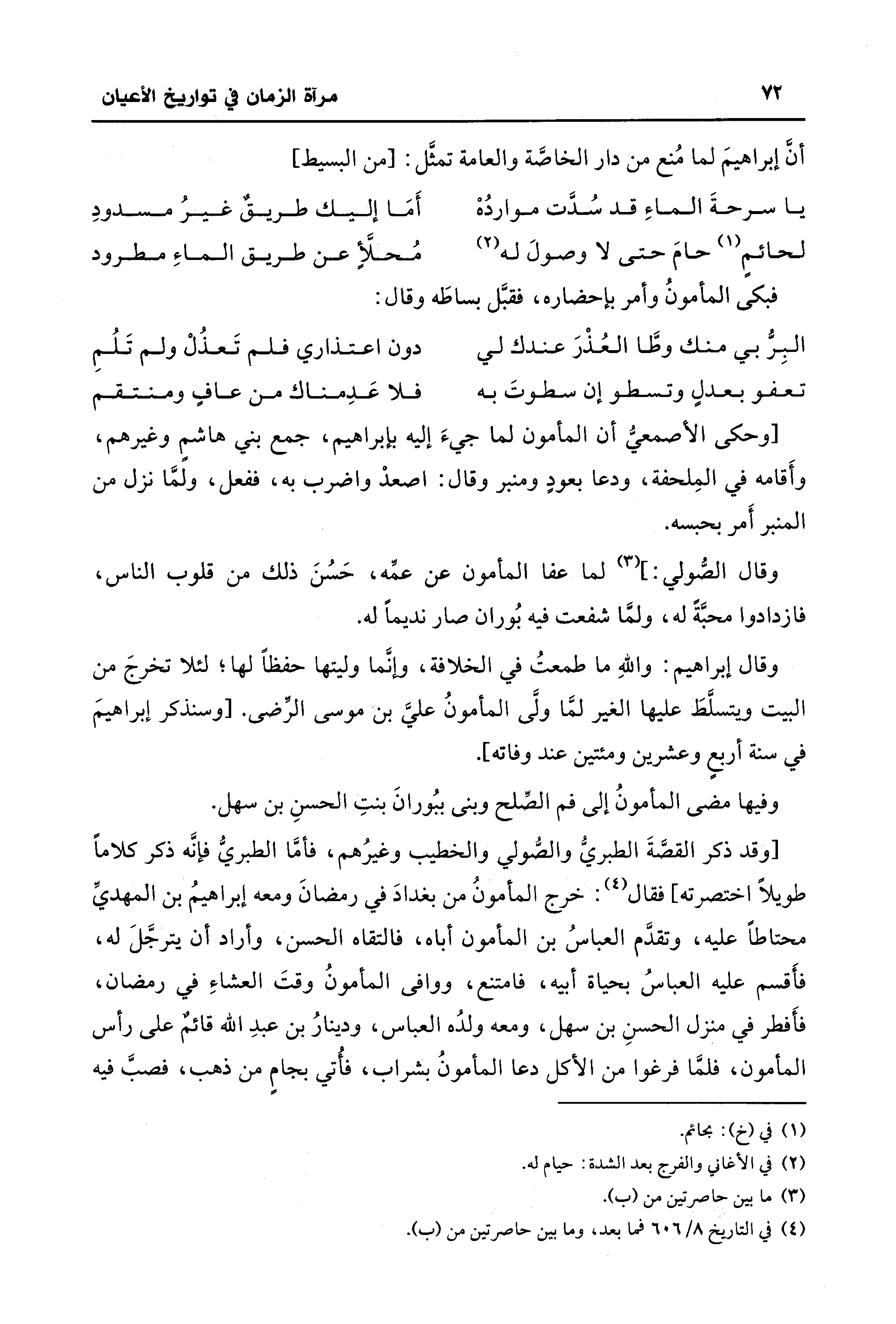 وقال إبراهيم: واللهِ ما طمعتُ في الخلافة، وإنَّما وليتها حفظًا لها؛ لئلا تخرجَ من البيت ويتسلَّطَ عليها الغير لمَّا ولَّى المأمونُ علي بن موسى الرِّضى. [وسنذكر إبراهيمَ في سنة أربعٍ وعشرين ومئتين عند وفاته].