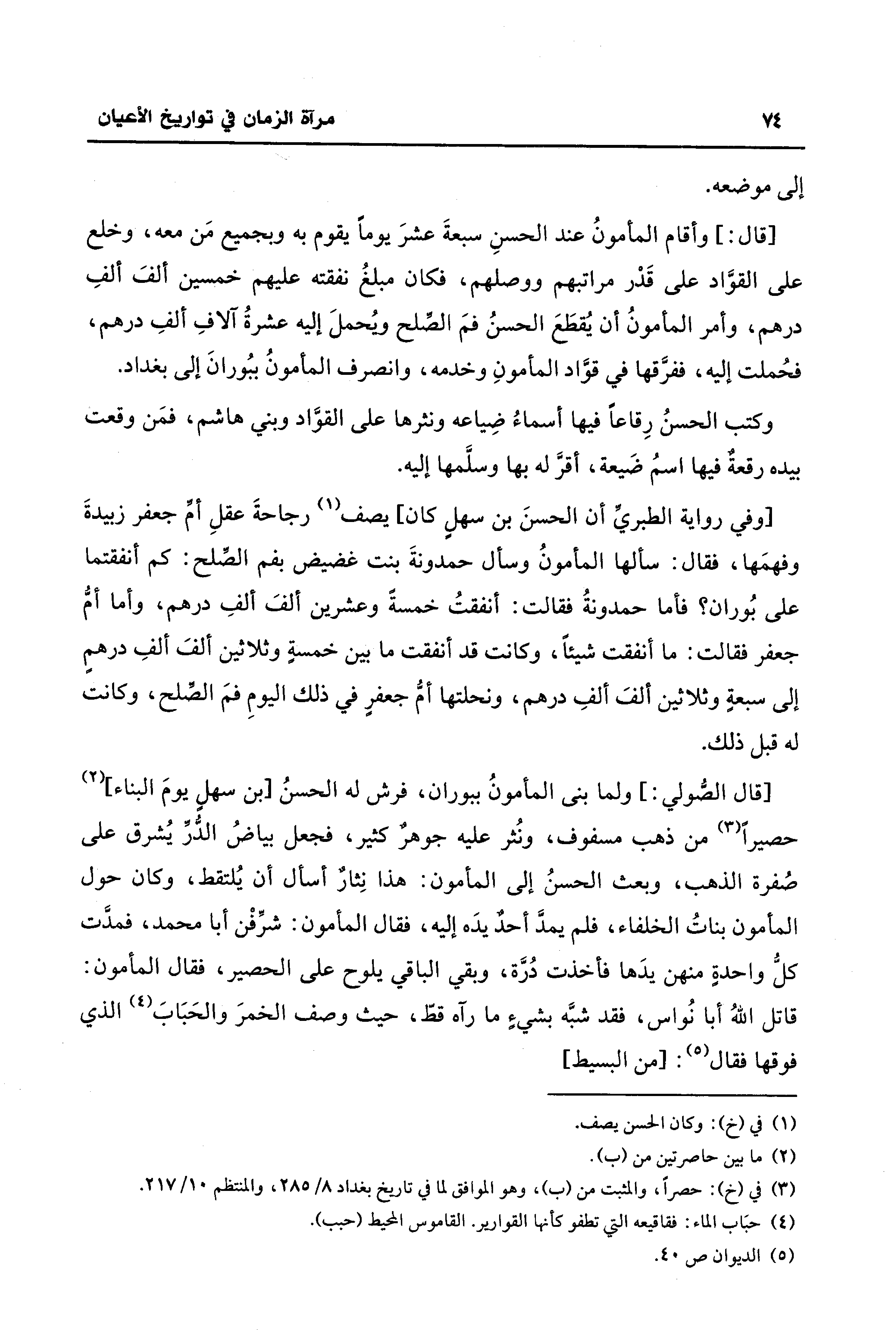 [وفي رواية الطَّبريِّ أن الحسنَ بن سهلٍ كان] يصف (¬1) رجاحةَ عقلِ أم جعفر زبيدةَ وفهمَها، فقال: سألها المأمونُ وسأل حمدونةَ بنت غضيض بفم الصِّلح: كم أنفقتما على بُوران؟ فأما حمدونةُ فقالت: أنفقتُ خمسة وعشرين ألفَ ألفِ درهم، وأما أمُّ جعفر فقالت: ما أنفقت شيئًا، وكانت قد أنفقت ما بين خمسةٍ وثلاثين ألفَ ألفِ درهمٍ إلى سبعةٍ وثلاثين ألفَ ألفِ درهم، ونحلتها أمُّ جعفرٍ في ذلك اليومِ فمَ الصِّلح، وكانت له قبل ذلك.