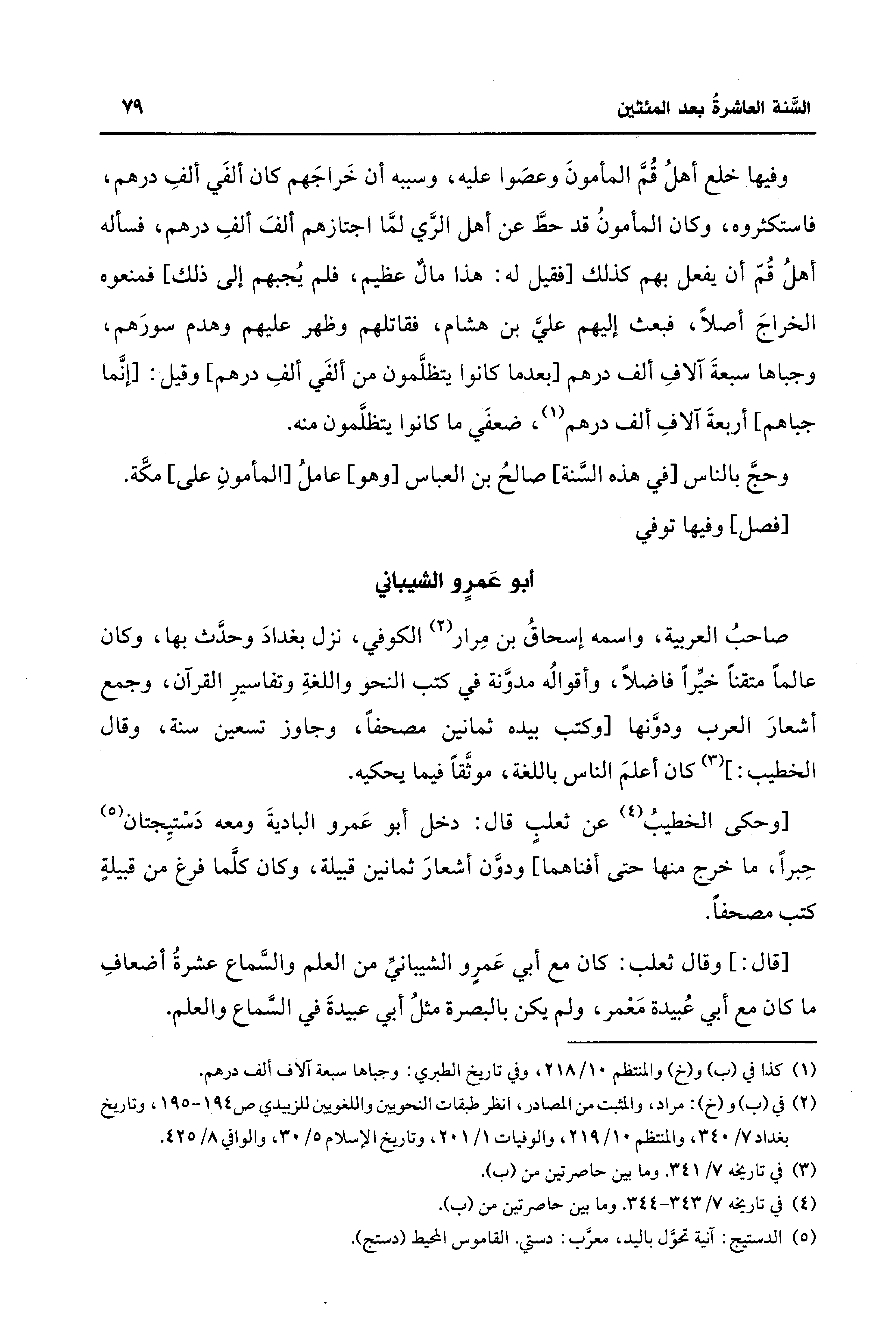 صاحبُ العربية، واسمه إسحاقُ بن مِرار (¬2) الكُوفيّ، نزل بغدادَ وحدَّث بها، وكان عالمًا متقنًا خيِّرًا فاضلًا، وأقوالُه مدوَّنة في كتب النحو واللغةِ وتفاسيرِ القرآن، وجمع أشعارَ العرب ودوَّنها [وكتب بيده ثمانين مصحفًا، وجاوز تسعين سنة، وقال الخَطيب: ] (¬3) كان أعلمَ النَّاس باللغة، موثَّقًا فيما يحكيه.