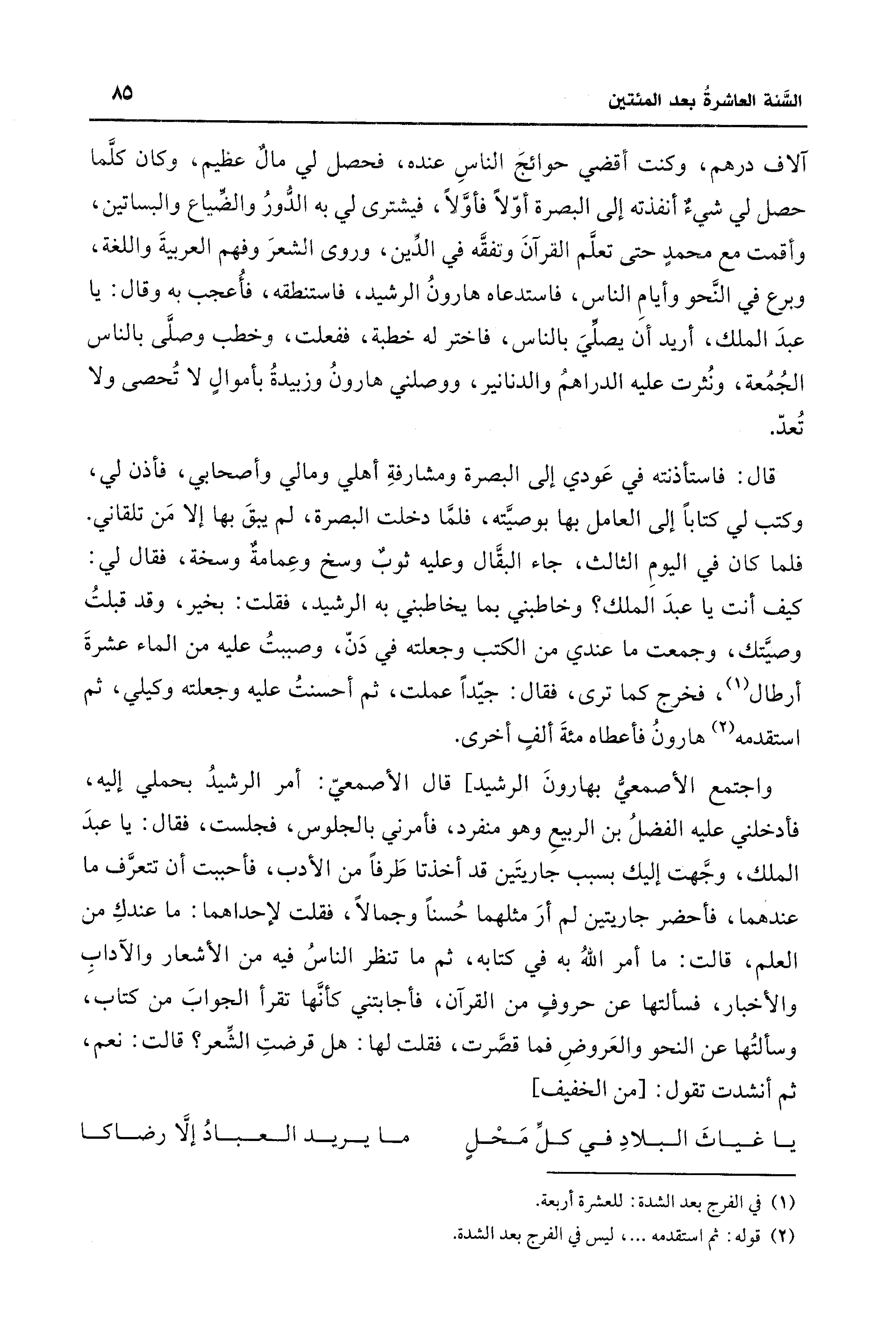 واجتمع الأصمعيُّ بهارونَ الرشيد] قال الأصمعيّ: أمر الرشيدُ بحملي إليه، فأدخلني عليه الفضلُ بن الربيعِ وهو منفرد، فأمرني بالجلوس، فجلست، فقال: يَا عبدَ الملك، وجَّهت إليك بسبب جاريتَين قد أخذتا طَرفًا من الأدب، فأحببت أن تتعرَّف ما عندهما، فأحضر جاريتين لم أرَ مثلهما حُسنًا وجمالًا، فقلت لإحداهما: ما عندكِ من العلم، قالت: ما أمر اللهُ به في كتابه، ثم ما تنظر النَّاسُ فيه من الأشعار والآدابِ والأخبار، فسألتها عن حروفٍ من القرآن، فأجابتني كأنَّها تقرأ الجواب من كتاب، وسألتُها عن النحو والعَروضِ فما قصَّرت، فقلت لها: هل قرضتِ الشِّعر؟ قالت: نعم، ثم أنشدت تقول: [من الخفيف]