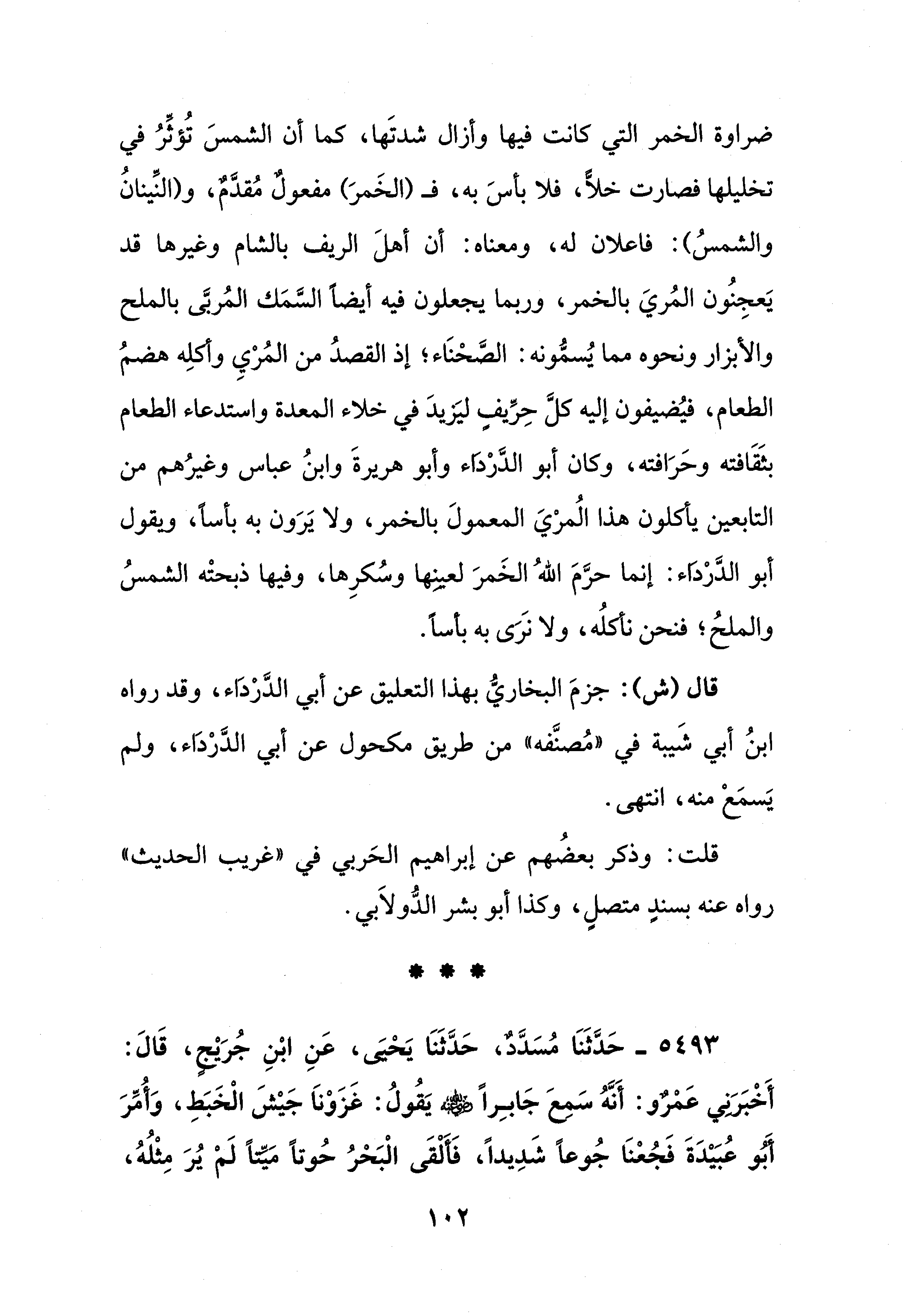 ضراوة الخمر التي كانت فيها وأزال شدتَها، كما أن الشمسَ تُؤثِّرُ في تخليلها فصارت خلًّا، فلا بأسَ به، فـ (الخَمرَ) مفعولٌ مُقدَّمٌ، و (النِّينانُ والشمسُ): فاعلان له، ومعناه: أن أهلَ الريف بالشام وغيرها قد يَعجِنُون المُريَ بالخمر، وربما يجعلون فيه أيضًا السَّمَك المُربَّى بالملح والأبزار ونحوه مما يُسمُّونه: الصَّحْنَاء؛ إذ القصدُ من المُرْيِ وأكلِه هضمُ الطعام، فيُضيفون إليه كلَّ حِرِّيفٍ ليَزيدَ في خلاء المعدة واستدعاء الطعام بثَقَافته وحَرَافته، وكان أبو الدَّرْدَاء وأبو هريرةَ وابنُ عباس وغيرُهم من التابعين يأكلون هذا المُرْيَ المعمولَ بالخمر، ولا يَرَون به بأسًا، ويقول أبو الدَّرْدَاء: إنما حرَّمَ اللهُ الخَمرَ لعينِها وسُكرِها، وفيها ذبحتْه الشمسُ والملحُ؛ فنحن نأكلُه، ولا نَرَى به بأسًا.