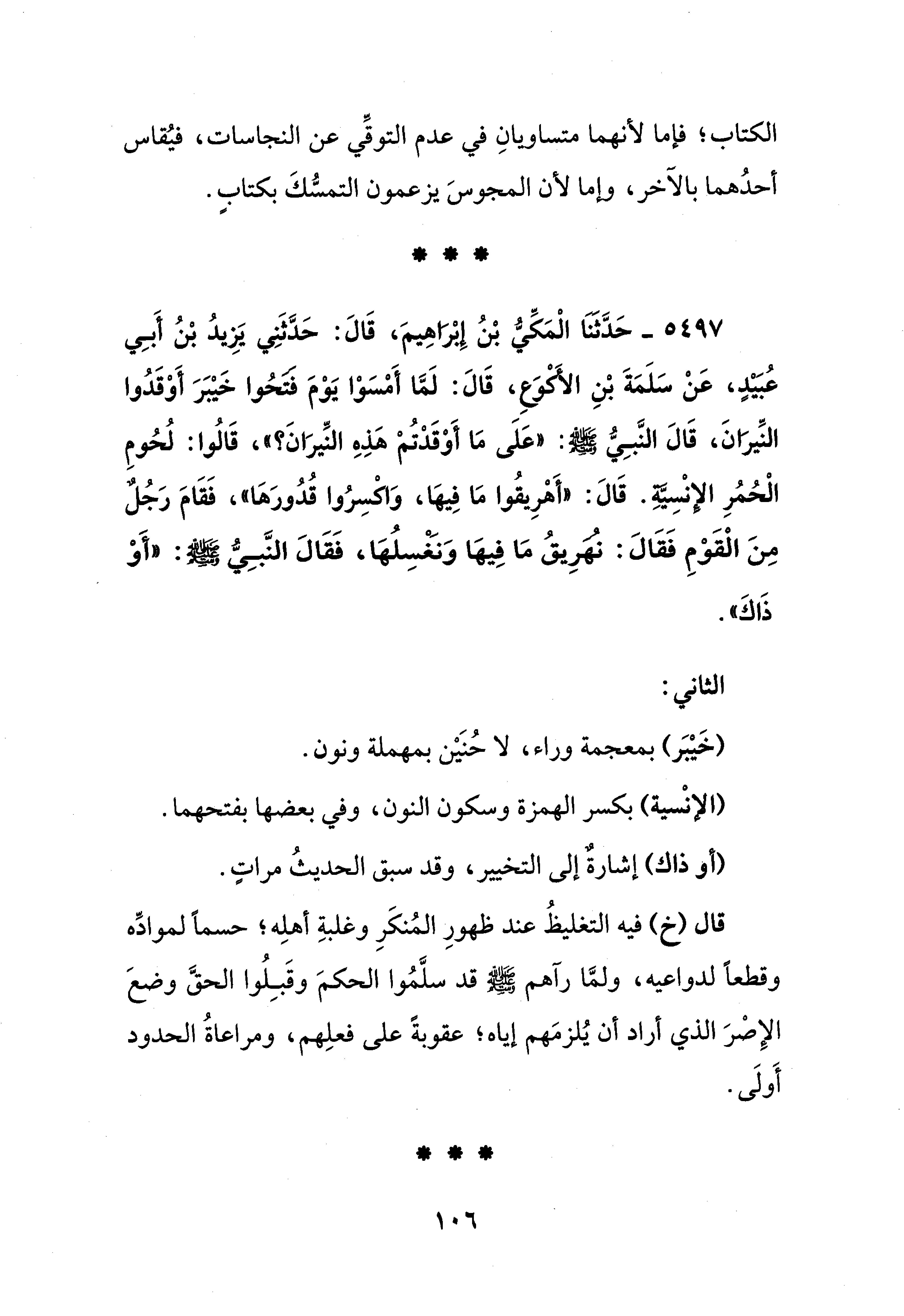 5497 - حَدَّثَنَا الْمَكِّيُّ بْنُ إِبْرَاهِيمَ، قَالَ: حَدَّثَنِي يَزِيدُ بْنُ أَبِي عُبَيْدٍ، عَنْ سَلَمَةَ بْنِ الَأكْوَعِ، قَالَ: لَمَّا أَمْسَوْا يَوْمَ فتحُوا خَيْبَرَ أَوْقَدُوا النِّيرَانَ، قَالَ النَّبِيُّ - صلى الله عليه وسلم -: "عَلَى مَا أَوْقَدْتُمْ هَذ النِّيرَانَ؟ "، قَالُوا: لُحُومِ الْحُمُرِ الإنْسِيَّةِ. قَالَ: "أَهْرِيقُوا مَا فِيهَا، وَاكْسِرُوا قُدُورَهَا"، فَقَامَ رَجُلٌ مِنَ الْقَوْمِ فَقَالَ: نُهَرِيقُ مَا فِيهَا وَنَغْسِلُهَا، فَقَالَ النَّبِيُّ - صلى الله عليه وسلم -: "أَوْ ذَاكَ".