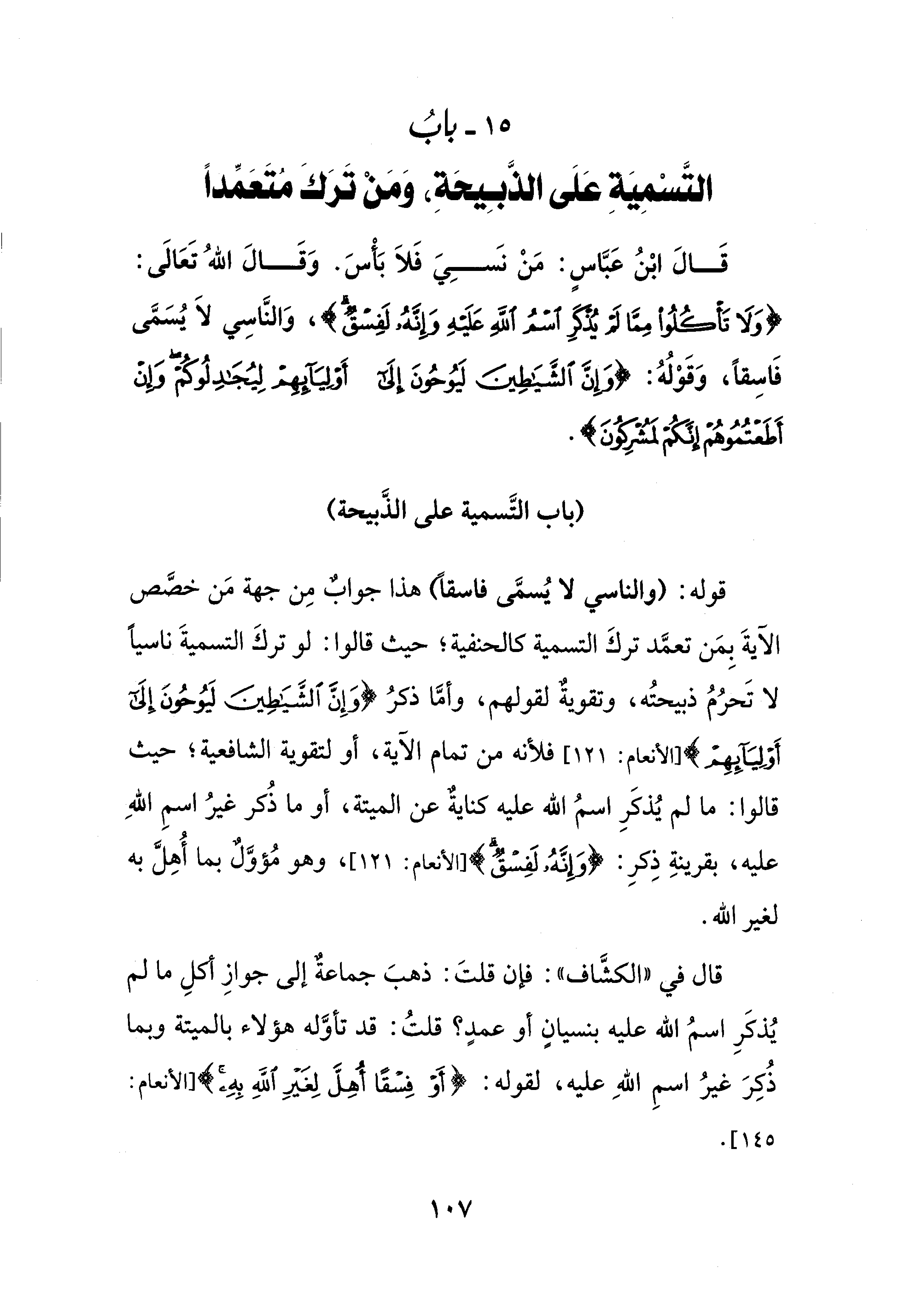 قوله: (والناسي لا يُسمَّى فاسقًا) هذا جوابٌ مِن جهة مَن خصَّص الاَيةَ بِمَن تعمَّد تركَ التسمية كالحنفية؛ حيث قالوا: لو تركَ التسميةَ ناسيًا لا تَحرُمُ ذبيحتُه، وتقويةٌ لقولهم، وأمَّا ذكرُ {وَإِنَّ الشَّيَاطِينَ لَيُوحُونَ إِلَى أَوْلِيَائِهِمْ} [الأنعام: 121] فلأنه من تمام الآية، أو لتقوية الشافعية؛ حيث قالوا: ما لم يُذكَرِ اسمُ الله عليه كنايةٌ عن الميتة، أو ما ذُكر غيرُ اسمِ اللهِ عليه، بقرينةِ ذِكرِ: {وَإِنَّهُ لَفِسْقٌ} [الأنعام: 121]، وهو مُؤوَّلٌ بما أُهِلَّ به لغير الله.