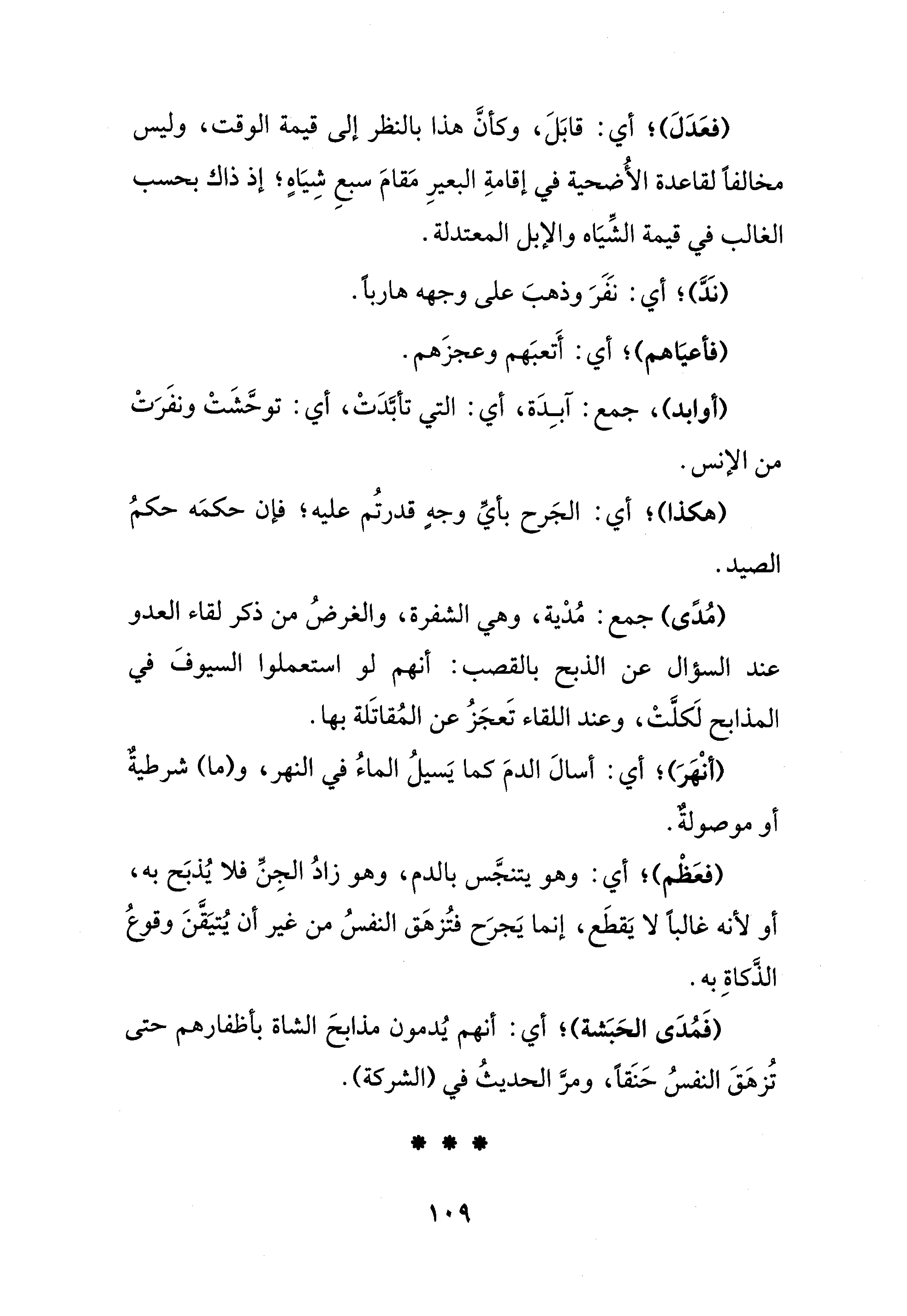 (مُدًى) جمع: مُدْية، وهي الشفرة، والغرضُ من ذكر لقاء العدو عند السؤال عن الذبح بالقصب: أنهم لو استعملوا السيوفَ في المذابح لَكلَّتْ، وعند اللقاء تَعجَزُ عن المُقاتَلة بها.