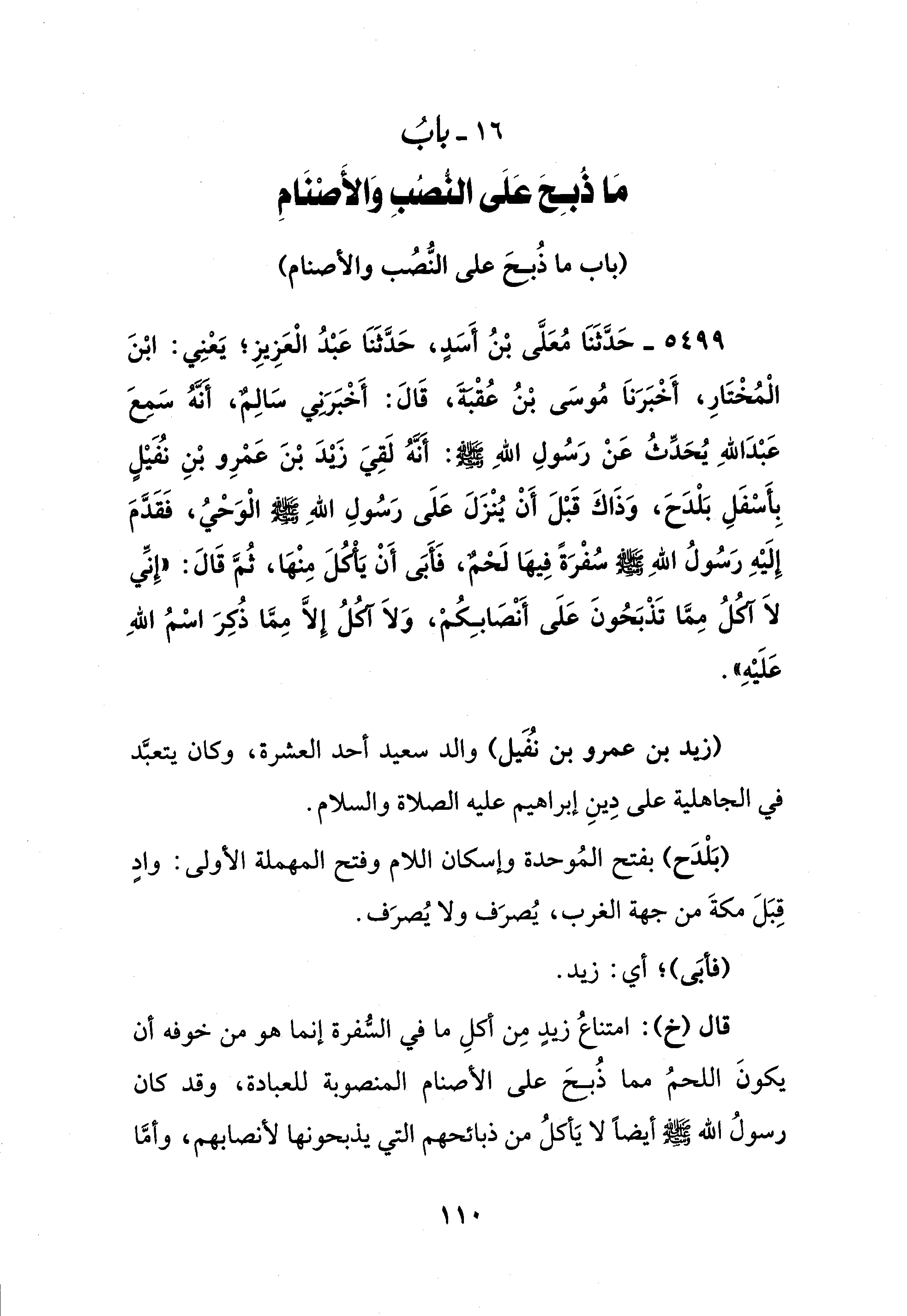 5499 - حَدَّثَنَا مُعَلَّى بْنُ أَسَدٍ، حَدَّثَنَا عَبْدُ الْعَزِيزِ؛ يَعْنِي: ابْنَ الْمُخْتَارِ، أَخْبَرَنَا مُوسَى بْنُ عُقْبَةَ، قَالَ: أَخْبَرَنِي سَالِمٌ، أَنَّهُ سَمِعَ عَبْدَ اللهِ يُحَدِّثُ عَنْ رَسُولِ اللهِ - صلى الله عليه وسلم -: أَنَّهُ لَقِيَ زيْدَ بْنَ عَمْرِو بْنِ نُفَيْل بِأَسْفَلِ بَلْدَحَ، وَذَاكَ فَبْلَ أَنْ يُنْزَلَ عَلَى رَسُولِ اللهِ - صلى الله عليه وسلم - الْوَحْيُ، فَقَدَّمَ إِلَيْهِ رَسُولُ اللهِ - صلى الله عليه وسلم - سُفْرَة فِيهَا لَحْمٌ، فَأَبَى أَنْ يَأْكُلَ مِنْهَا، ثُمَّ قَالَ: "إِنِّي لَا آكُلُ مِمَّا تَذْبَحُونَ عَلَى أَنْصَابِكُمْ، وَلَا آكُلُ إِلَّا مِمَّا ذُكِرَ اسْمُ اللهِ عَلَيْهِ".