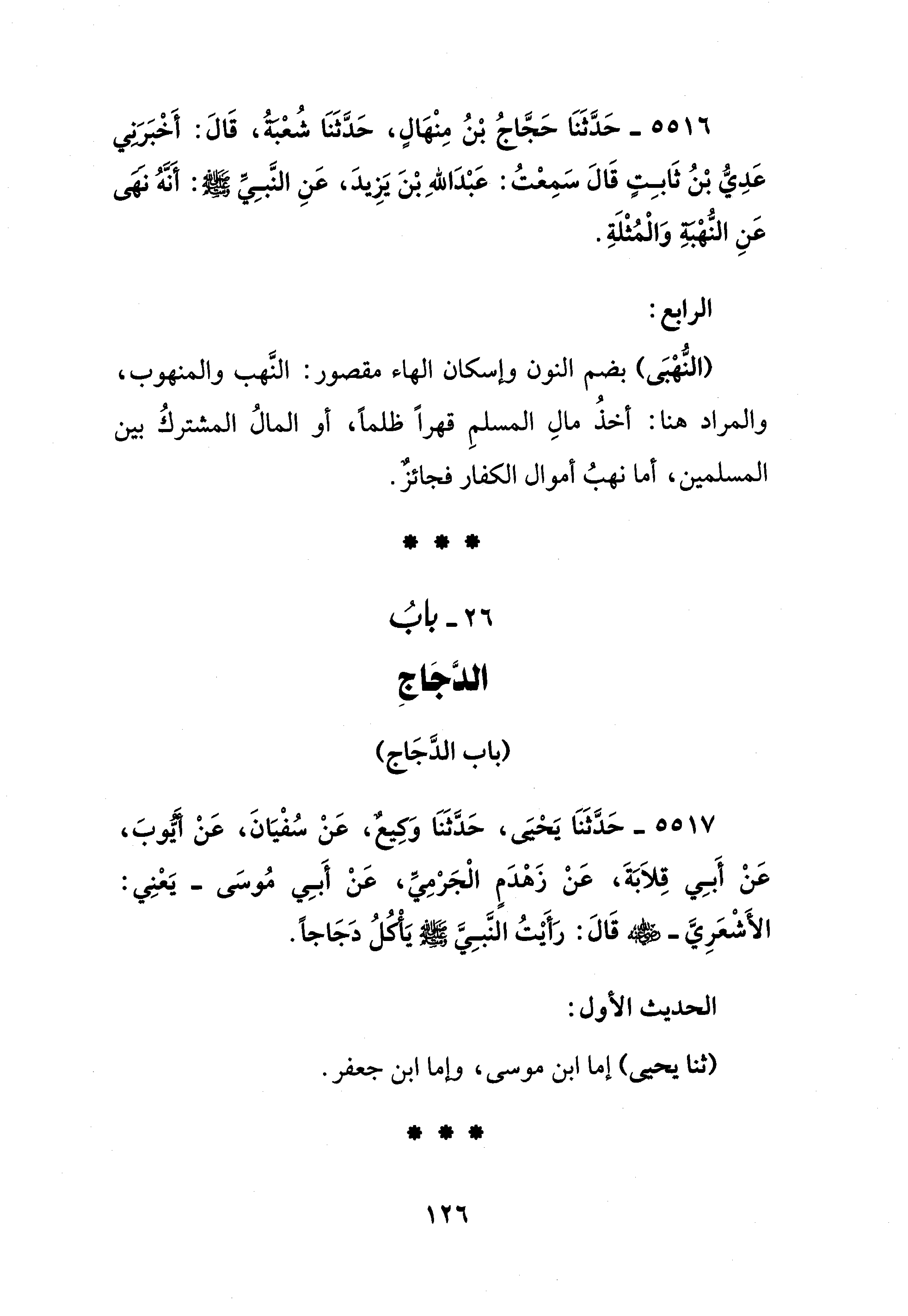 5516 - حَدَّثَنَا حَجَّاجُ بْنُ مِنْهَالٍ، حَدَّثَنَا شُعْبَةُ، قَالَ: أَخْبَرَنِي عَدِيُّ بْنُ ثَابِتٍ قَالَ سَمِعْتُ: عَبْدَ اللهِ بْنَ يَزِيدَ، عَنِ النَّبِيِّ - صلى الله عليه وسلم -: أَنَّهُ نهى عَنِ النُّهْبة وَالْمُثْلَةِ.