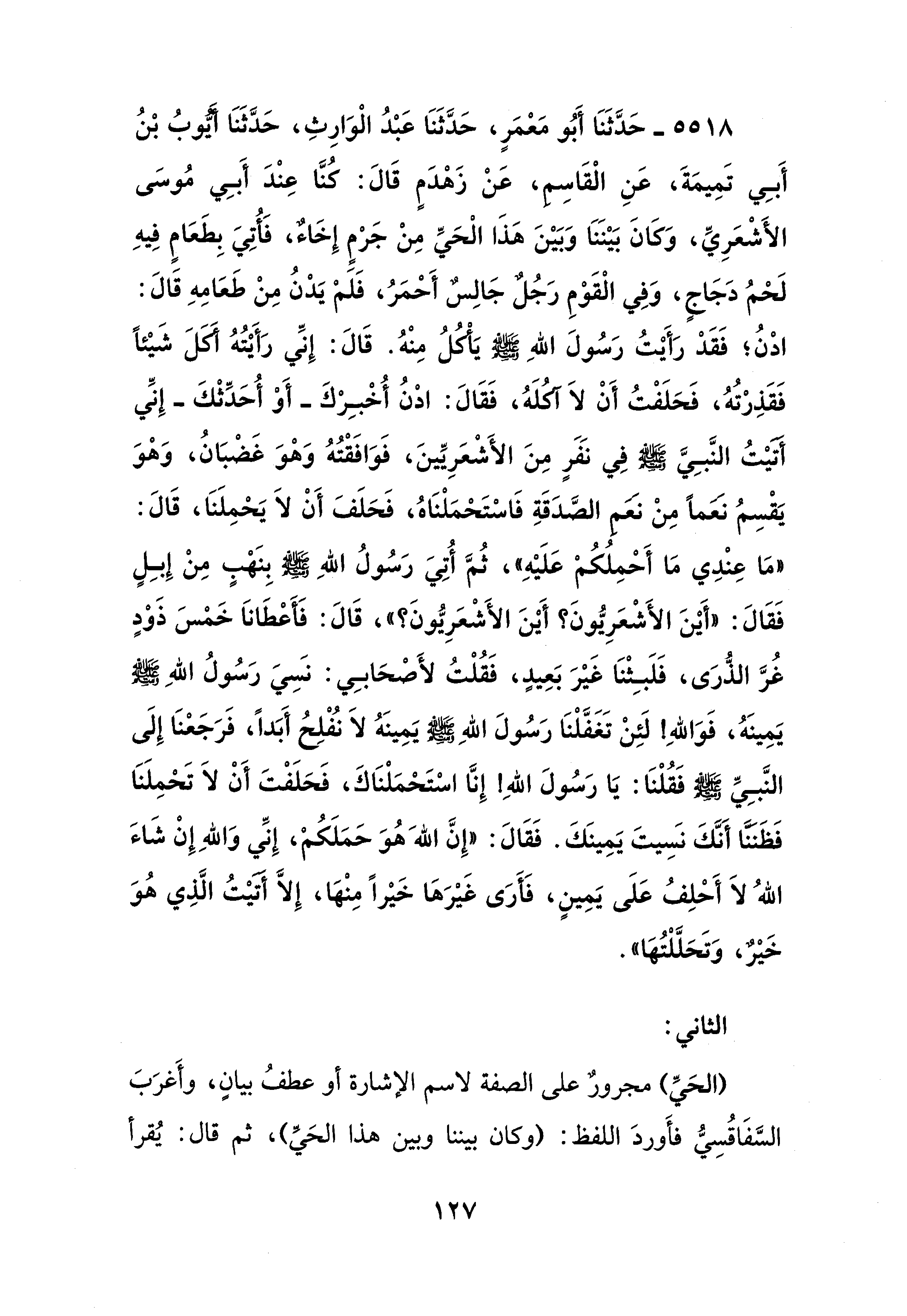 5518 - حَدَّثَنَا أَبُو مَعْمَرٍ، حَدَّثَنَا عَبْدُ الْوَارِثِ، حَدَّثَنَا أَيُّوبُ بْنُ أَبِي تَمِيمَةَ، عَنِ الْقَاسِم، عَنْ زَهْدَمٍ قَالَ: كُنَّا عِنْدَ أَبِي مُوسَى الأَشْعَرِيِّ، وَكَانَ بَيْنَنَا وَبَيْنَ هَذَا الْحَيِّ مِنْ جَرْمٍ إِخَاءٌ؛ فَأُتِيَ بِطَعَامٍ فِيهِ لَحْمُ دَجَاجٍ، وَفِي الْقَوْمِ رَجُلٌ جَالِسٌ أَحْمَرُ، فَلمْ يَدْنُ مِنْ طَعَامِهِ قَالَ: ادْنُ؛ فَقَدْ رَأَيْتُ رَسُولَ اللهِ - صلى الله عليه وسلم - يَأْكُلُ مِنْهُ. قَالَ: إِنِّي رَأَيْتُهُ أَكَلَ شَيْئًا فَقَذِرْتُهُ، فَحَلَفْتُ أَنْ لا آكُلَهُ، فَقَالَ: ادْنُ أُخْبِرْكَ -أَوْ أُحَدِّثْكَ- إِنِّي أَتَيْتُ النَّبِيَّ - صلى الله عليه وسلم - فِي نَفَرٍ مِنَ الأَشْعَرِيِّينَ، فَوَافَقْتُهُ وَهْوَ غَضْبَانُ، وَهْوَ يَقْسِمُ نَعَمًا مِنْ نَعَمِ الصَّدَقَةِ فَاسْتَحْمَلْنَاهُ، فَحَلَفَ أَنْ لَا يَحْمِلَنَا، قَالَ: "مَا عِنْدِي مَا أَحْمِلُكُمْ عَلَيْهِ"، ثُمَّ أُتِيَ رَسُولُ اللهِ - صلى الله عليه وسلم - بِنَهْبٍ مِنْ إِبِلٍ فَقَالَ: "أَيْنَ الأَشْعَرِيُّونَ؟ أَيْنَ الأَشْعَرِيُّونَ؟ "، قَالَ: فَأَعْطَانَا خَمْسَ ذَوْدٍ غُرَّ الذُّرَى، فَلَبِثْنَا غَيْرَ بَعِيدٍ، فَقُلْتُ لأَصْحَابِي: نَسِيَ رَسُولُ اللهِ - صلى الله عليه وسلم - يَمِينَهُ، فَوَاللهِ! لَئِنْ تَغَفَّلْنَا رَسُولَ اللهِ - صلى الله عليه وسلم - يَمِينَهُ لَا نُفْلِحُ أَبَدًا، فَرَجَعْنَا إِلَى النَّبِيِّ - صلى الله عليه وسلم - فَقُلْنَا: يَا رَسُولَ اللهِ! إِنَّا اسْتَحْمَلْنَاكَ، فَحَلَفْتَ أَنْ لَا تَحْمِلَنَا فَظَننَّا أنَّكَ نَسِيتَ يَمِينَكَ. فَقَالَ: "إِنَّ اللهَ هُوَ حَمَلَكُمْ، إِنِّي وَاللهِ إِنْ شَاءَ اللهُ لَا أَحْلِفُ عَلَى يَمِينٍ، فَأَرَى غَيْرَهَا خَيْرًا مِنْهَا، إِلَّا أَتَيْتُ الَّذِي هُوَ خَيْرٌ، وَتَحَلَّلْتُهَا".