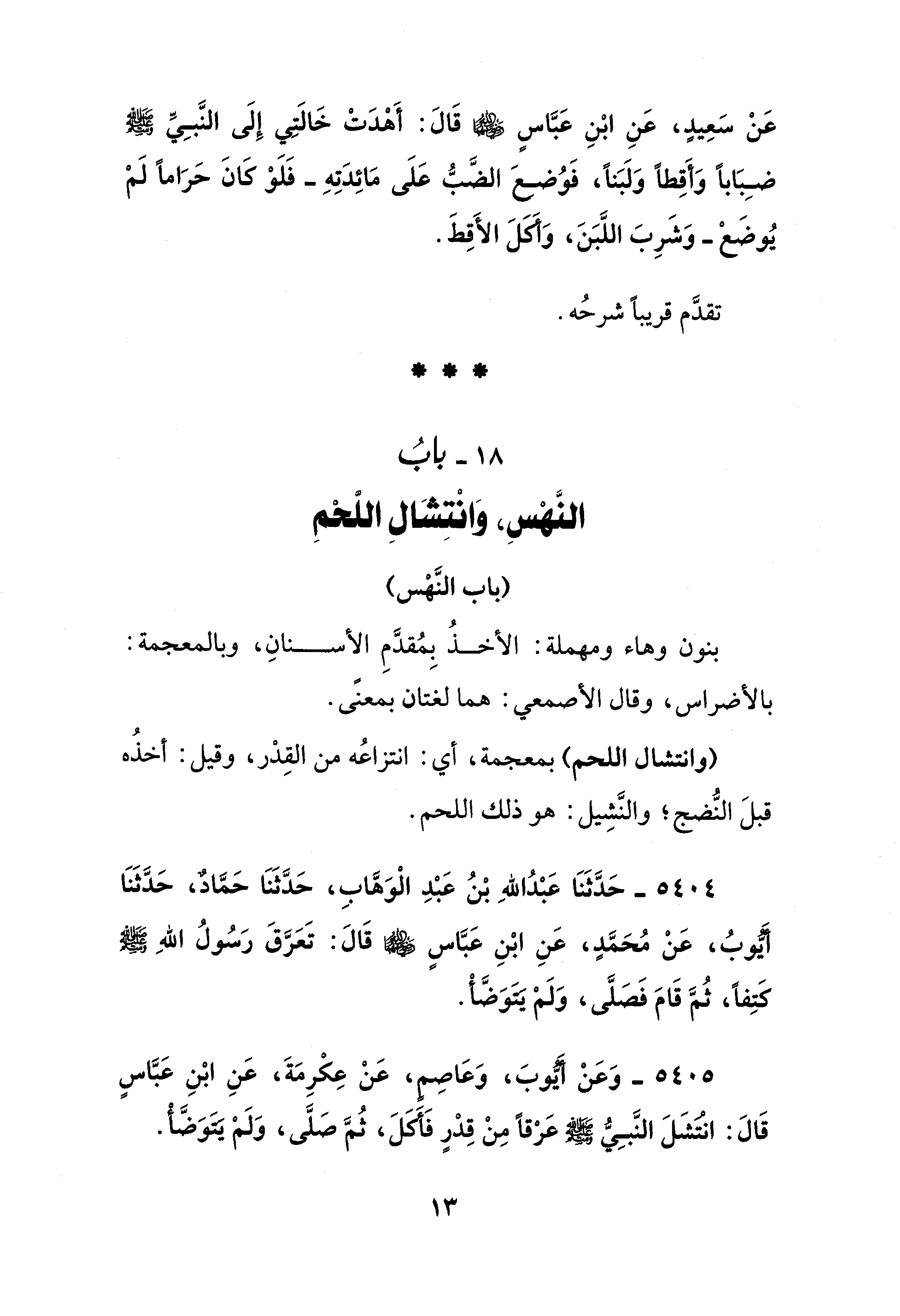 5404 - حَدَّثَنَا عَبْدُ اللهِ بْنُ عَبْدِ الْوَهَّابِ، حَدَّثَنَا حَمَّادٌ، حَدَّثَنَا أيُّوبُ، عَنْ مُحَمَّدٍ، عَنِ ابْنِ عَبَّاسٍ - رضي الله عنهما - قَالَ: تَعَرَّقَ رَسُولُ اللهِ - صلى الله عليه وسلم - كتِفًا، ثُمَّ قَامَ فَصَلَّى، وَلَمْ يتوَضَّأ.