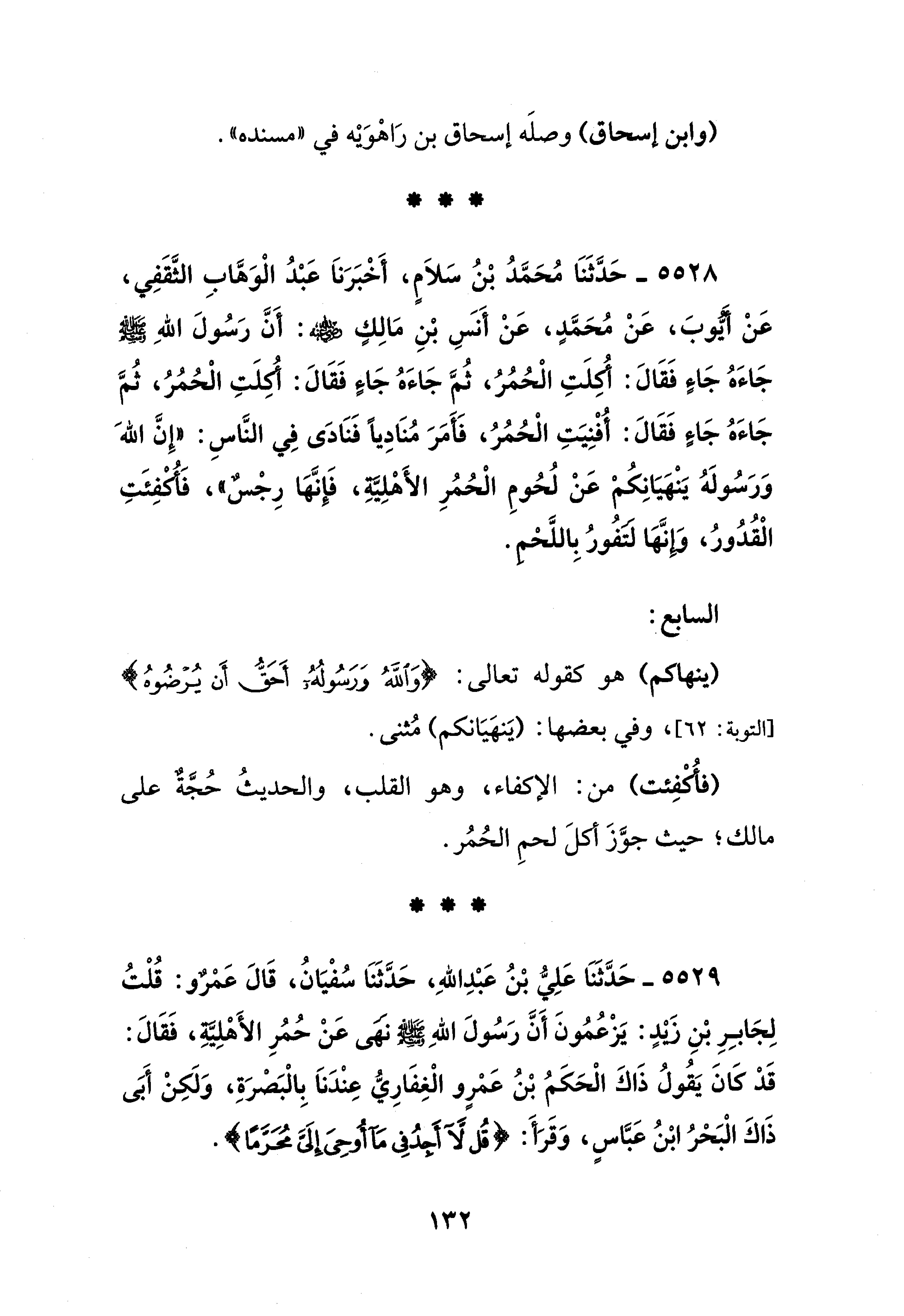 5528 - حَدَّثَنَا مُحَمَّدُ بْنُ سَلاَمٍ، أَخْبَرَنَا عَبْدُ الْوَهَّابِ الثَّقَفِي، عَنْ أَيُّوبَ، عَنْ مُحَمَّدٍ، عَنْ أَنس بْنِ مَالِكٍ - رضي الله عنه -: أَنَّ رَسُولَ اللهِ - صلى الله عليه وسلم - جَاءَهُ جَاءٍ فَقَالَ: أُكِلَتِ الْحُمُرُ، ثُمَّ جَاءَهُ جَاءٍ فَقَالَ: أُكِلَتِ الْحُمُرُ، ثُمَّ جَاءَهُ جَاءٍ فَقَالَ: أُفْنِيَتِ الْحُمُرُ، فَأَمَرَ مُنَادِيًا فَنَادَى فِي النَّاسِ: "إِنَّ اللهَ وَرَسُولَهُ يَنْهَيَانِكُمْ عَنْ لُحُومِ الْحُمُرِ الأَهْلِيَّةِ، فَإِنَّهَا رِجْسٌ"، فَأُكفِئَتِ الْقُدُورُ، وَإِنَّهَا لتفُورُ بِاللَّحْمِ.