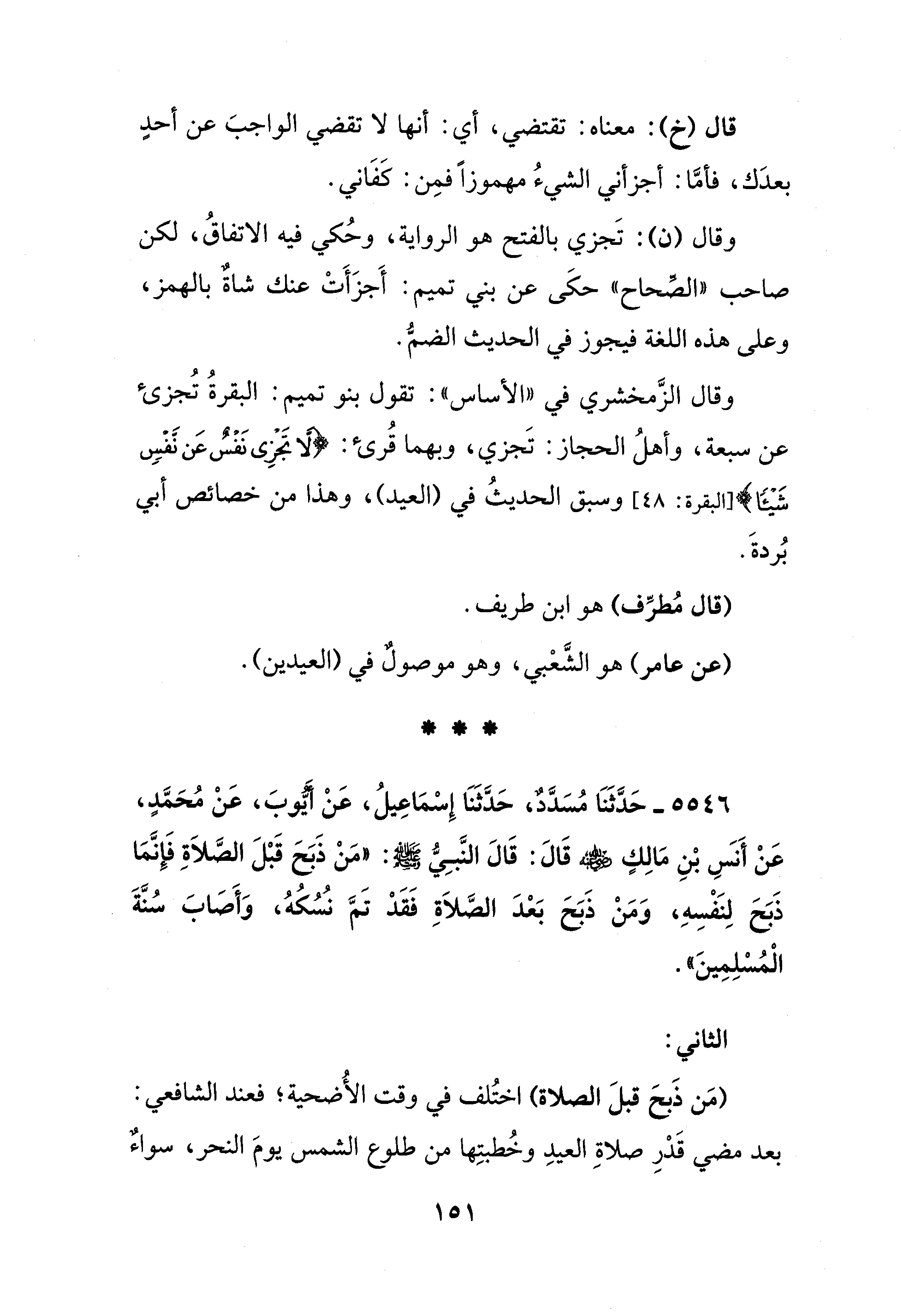 5546 - حَدَّثَنَا مُسَدَّدٌ، حَدَّثَنَا إِسْمَاعِيلُ، عَنْ أيُّوبَ، عَنْ مُحَمَّدٍ، عَنْ أَنس بْنِ مَالِكٍ - رضي الله عنه - قَالَ: قَالَ النَّبِيُّ - صلى الله عليه وسلم -: "مَنْ ذَبَحَ قَبْلَ الصَّلاَةِ فَإِنَّمَا ذَبَحَ لِنَفْسِهِ، وَمَنْ ذَبَحَ بَعْدَ الصَّلاَةِ فَقَدْ تَمَّ نُسُكُهُ، وَأَصَابَ سُنَّةَ الْمُسْلِمِينَ".