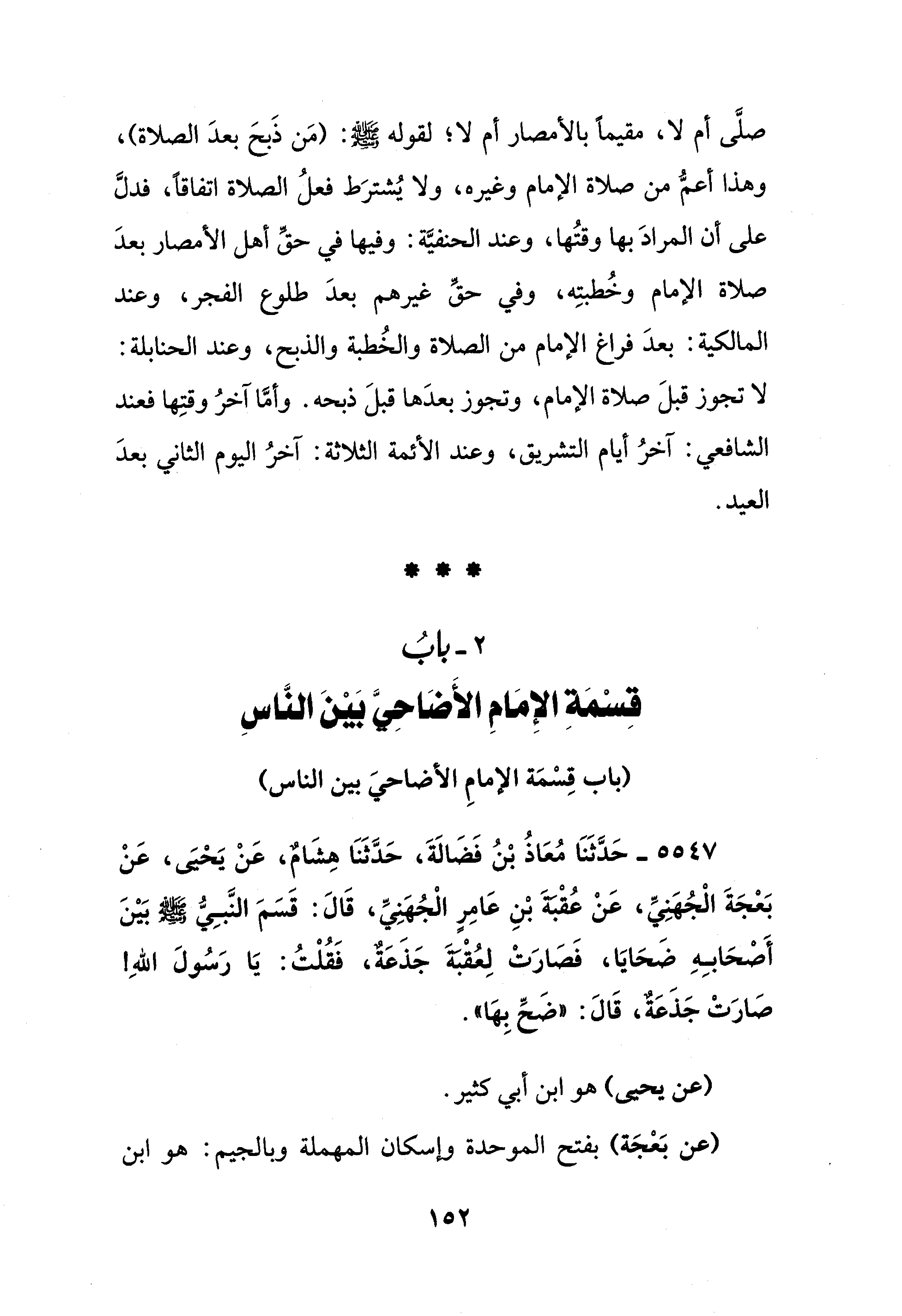 صلَّى أم لا، مقيمًا بالأمصار أم لا؛ لقوله - صلى الله عليه وسلم -: (مَن ذَبحَ بعدَ الصلاة)، وهذا أعمُّ من صلاة الإِمام وغيره، ولا يُشترَط فعلُ الصلاة اتفاقًا، فدلَّ على أن المرادَ بها وقتُها، وعند الحنفيَّة: وفيها في حقِّ أهل الأمصار بعدَ صلاة الإِمام وخُطبتِه، وفي حقِّ غيرهم بعدَ طلوع الفجر، وعند المالكية: بعدَ فراغ الإِمام من الصلاة والخُطبة والذبح، وعند الحنابلة: لا تجوز قبلَ صلاة الإِمام، وتجوز بعدَها قبلَ ذبحه. وأمَّا آخرُ وقتِها فعند الشافعي: آخرُ أيام التشريق، وعند الأئمة الثلاثة: آخرُ اليوم الثاني بعدَ العيد.
