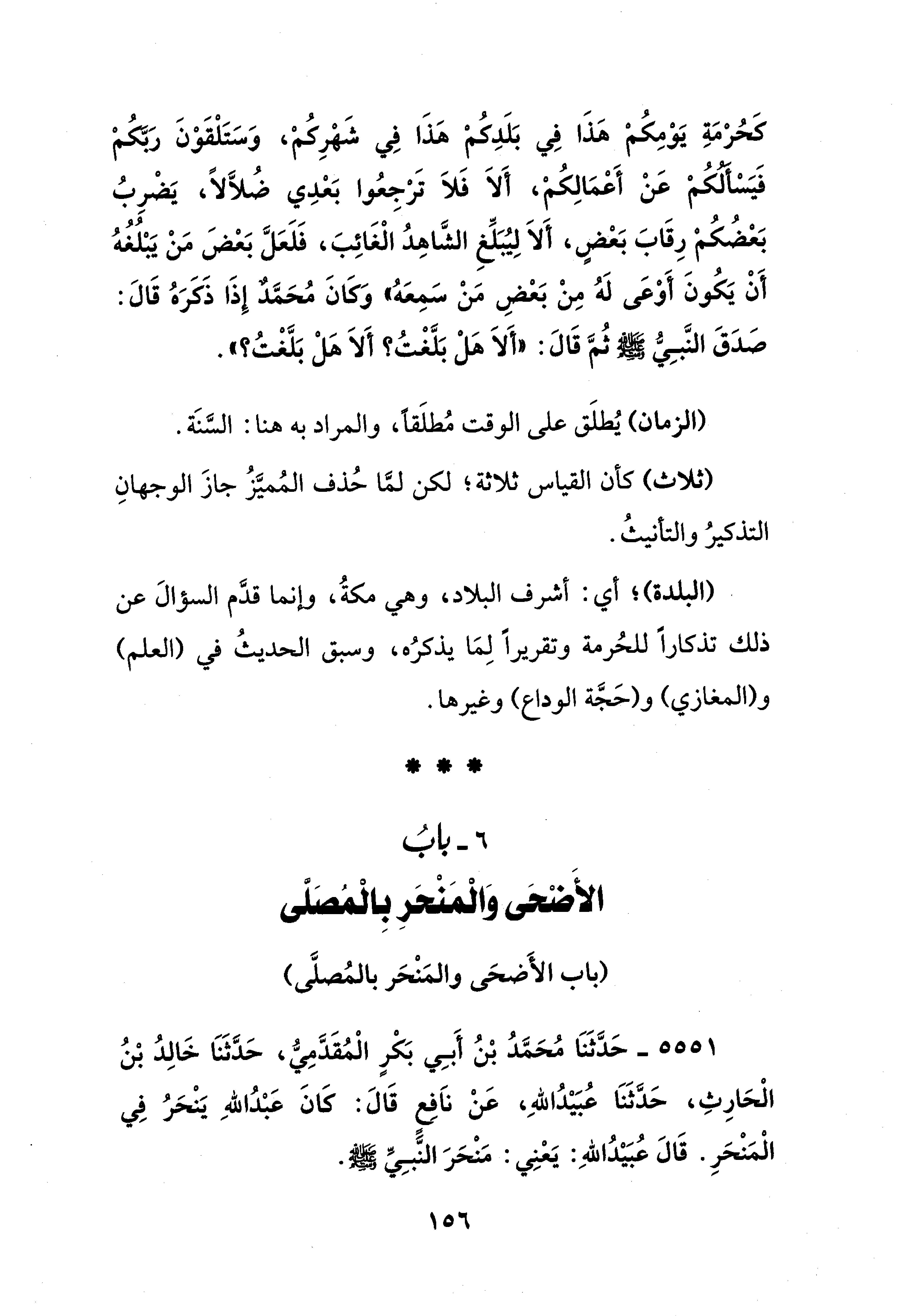 5551 - حَدَّثَنَا مُحَمَّدُ بْنُ أَبِي بَكْرٍ الْمُقَدَّمِيُّ، حَدَّثَنَا خَالِدُ بْنُ الْحَارِثِ، حَدَّثَنَا عُبَيْدُ اللهِ، عَنْ نَافِعٍ قَالَ: كانَ عَبْدُ اللهِ يَنْحَرُ في الْمَنْحَرِ. قَالَ عُبَيْدُ اللهِ: يَعْنِي: مَنْحَرَ النَّبِيِّ - صلى الله عليه وسلم -.