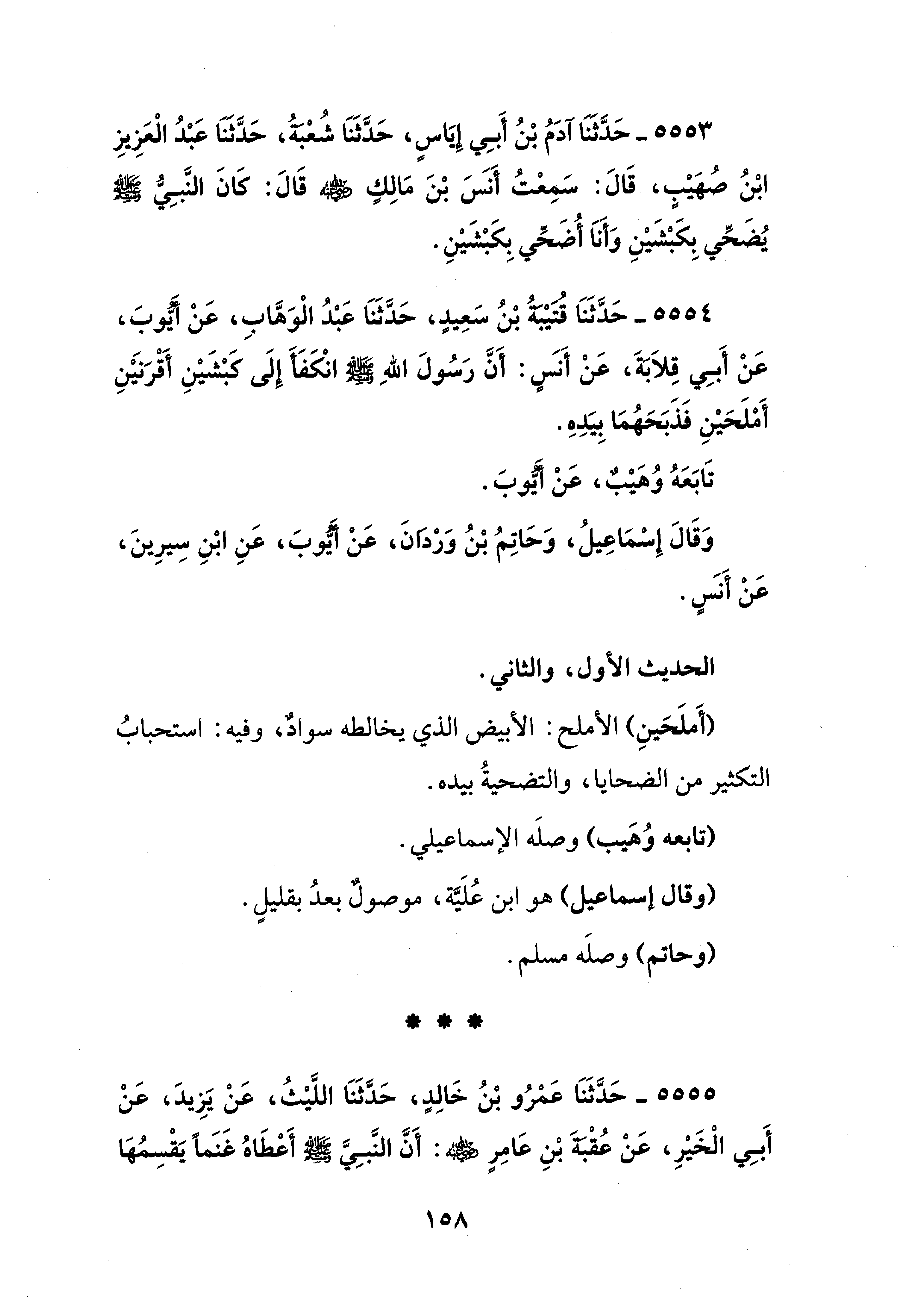 5553 - حَدَّثَنَا آَدَمُ بْنُ أَبِي إِيَاسٍ، حَدَّثَنَا شُعْبَةُ، حَدَّثَنَا عَبْدُ الْعَزِيزِ بْنُ صُهَيْبٍ، قَالَ: سَمِعْتُ أَنس بْنَ مَالِكٍ - رضي الله عنه - قَالَ: كَانَ النَّبِي - صلى الله عليه وسلم - يُضَحِّي بِكَبْشَيْنِ وَأَنَا أُضَحِّي بِكَبْشَيْنِ.