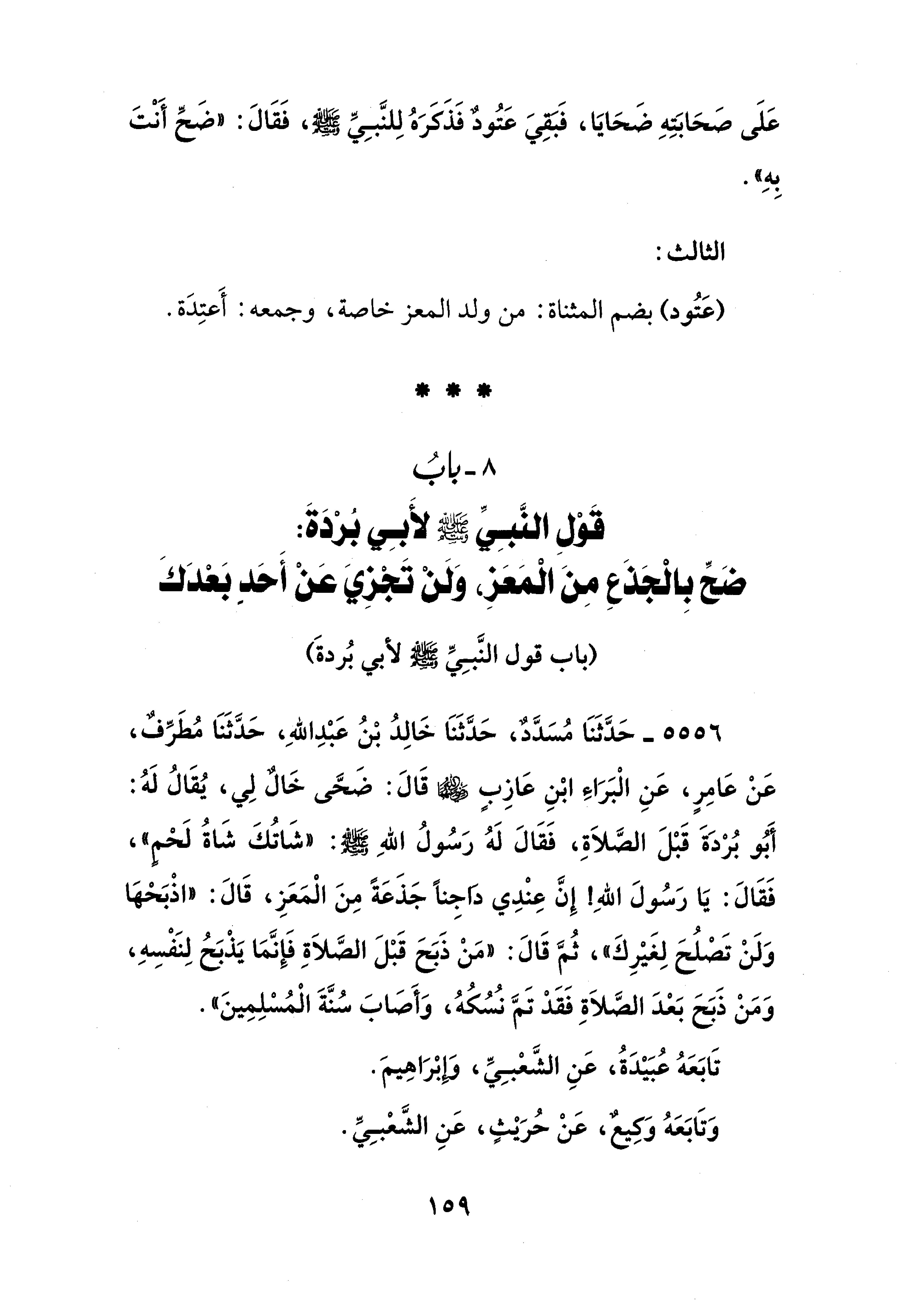 8 - بابُ قَوْل النَّبِيِّ - صلى الله عليه وسلم - لأَبِي بُرْدَةَ: ضَحِّ بِالْجَذَعِ مِنَ الْمَعَزِ، وَلَنْ تَجْزِيَ عَنْ أَحَدٍ بَعْدَكَ
