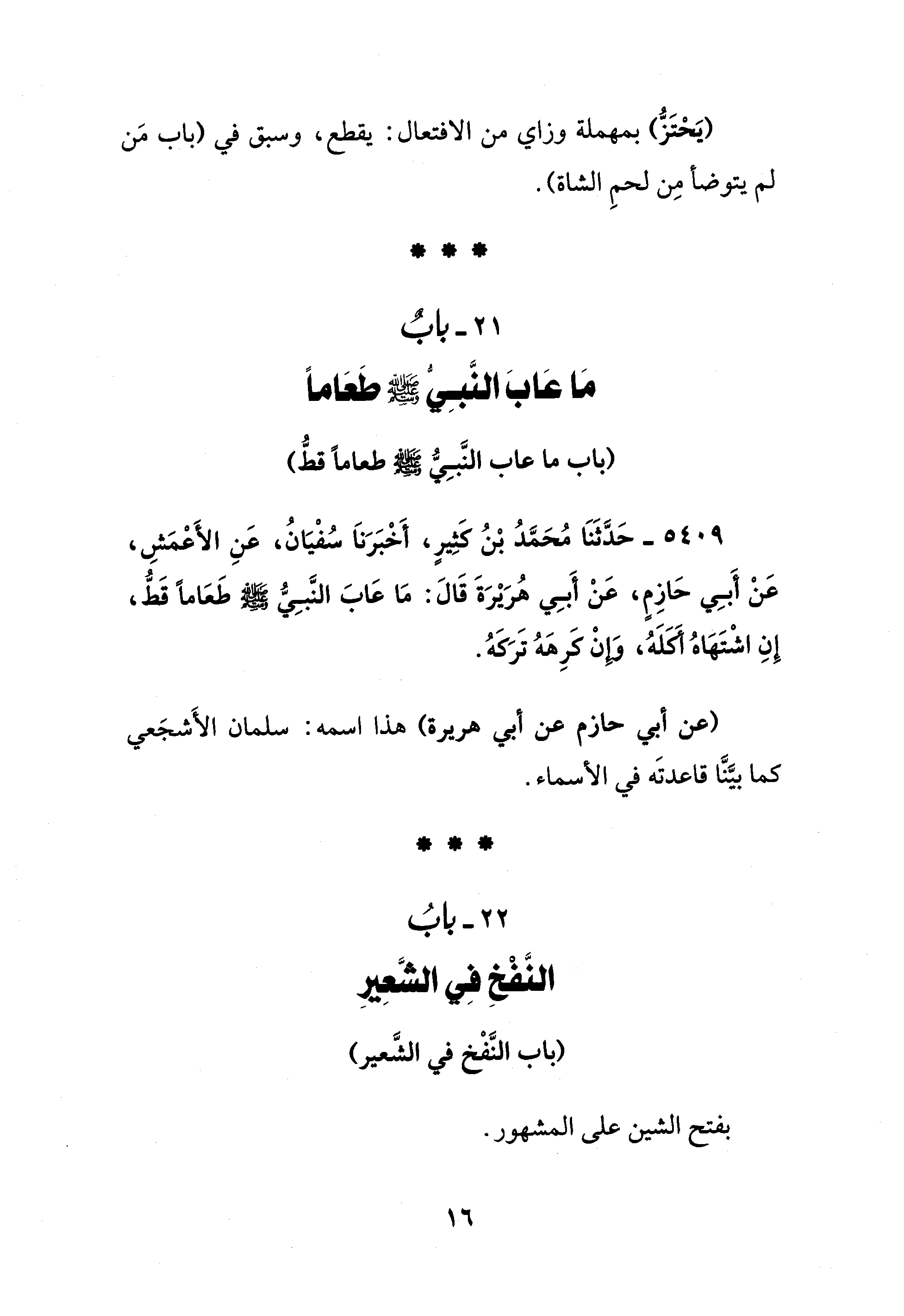 5409 - حَدَّثَنَا مُحَمَّدُ بْنُ كثِيرٍ، أَخْبَرَنَا سُفْيَانُ، عَنِ الأَعْمَشِ، عَنْ أَبِي حَازِمٍ، عَنْ أَبِي هُرَيْرَةَ قَالَ: مَا عَابَ النَّبِيُّ - صلى الله عليه وسلم - طَعَامًا قَطُّ، إِنِ اشْتَهَاهُ أَكَلَهُ، وَإِنْ كَرِهَهُ تَرَكَهُ.