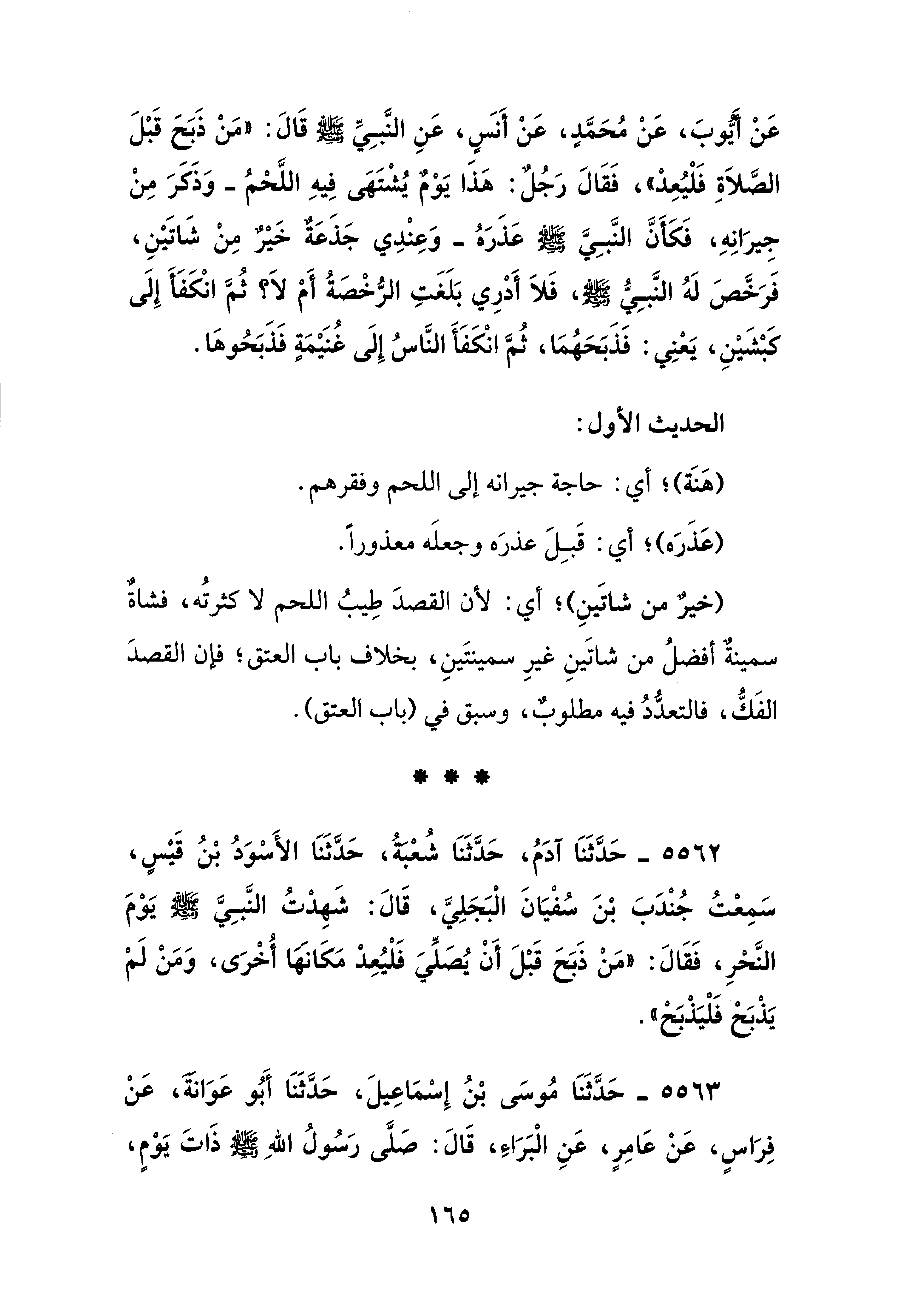5562 - حَدَّثَنَا آدَمُ، حَدَّثَنَا شُعْبَةُ، حَدَّثَنَا الأَسْوَدُ بْنُ قَيْسٍ، سَمِعْتُ جُنْدَبَ بْنَ سُفْيَانَ الْبَجَلِيَّ، قَالَ: شَهِدْتُ النَّبِيَّ - صلى الله عليه وسلم - يَوْمَ النَّحْرِ، فَقَالَ: "مَنْ ذَبَحَ قَبْلَ أَنْ يُصَلِّيَ فَلْيُعِدْ مَكَانَهَا أُخْرَى، وَمَنْ لَمْ يَذْبَحْ فَلْيَذْبَحْ".