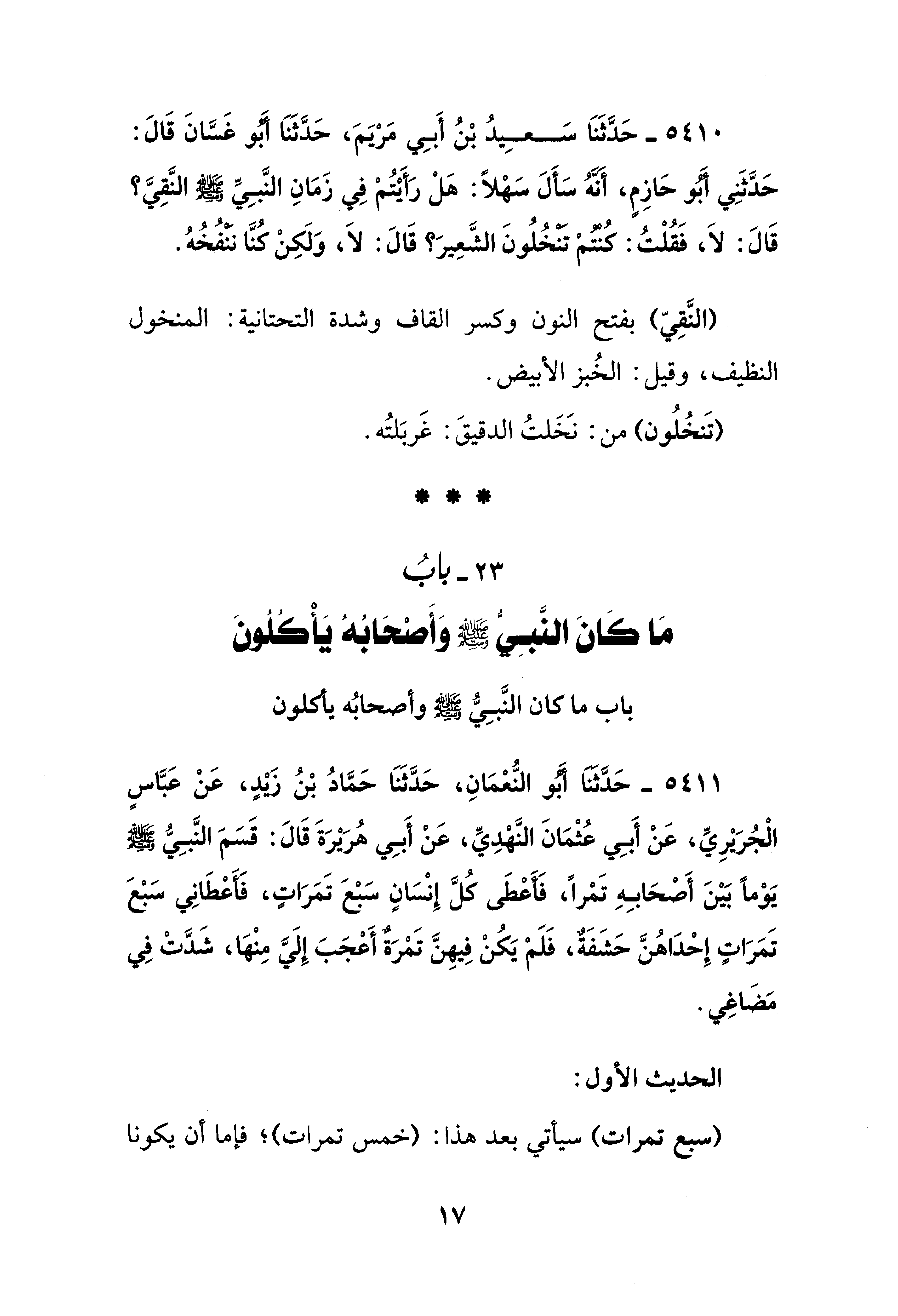 5410 - حَدَّثَنَا سَعِيدُ بْنُ أَبِي مَرْيَمَ، حَدَّثَنَا أَبُو غَسَّانَ قَالَ: حَدَّثَنِي أَبُو حَازِمٍ، أبو سَألَ سَهْلًا: هَلْ رَأَيْتُمْ فِي زَمَانِ النَّبِيِّ - صلى الله عليه وسلم - النَّقِيَّ؟ قَالَ: لَا، فَقُلْتُ: كنتمْ تنخُلُونَ الشَّعِيرَ؟ قَالَ: لَا، وَلَكِنْ كُنَّا ننفُخُهُ.