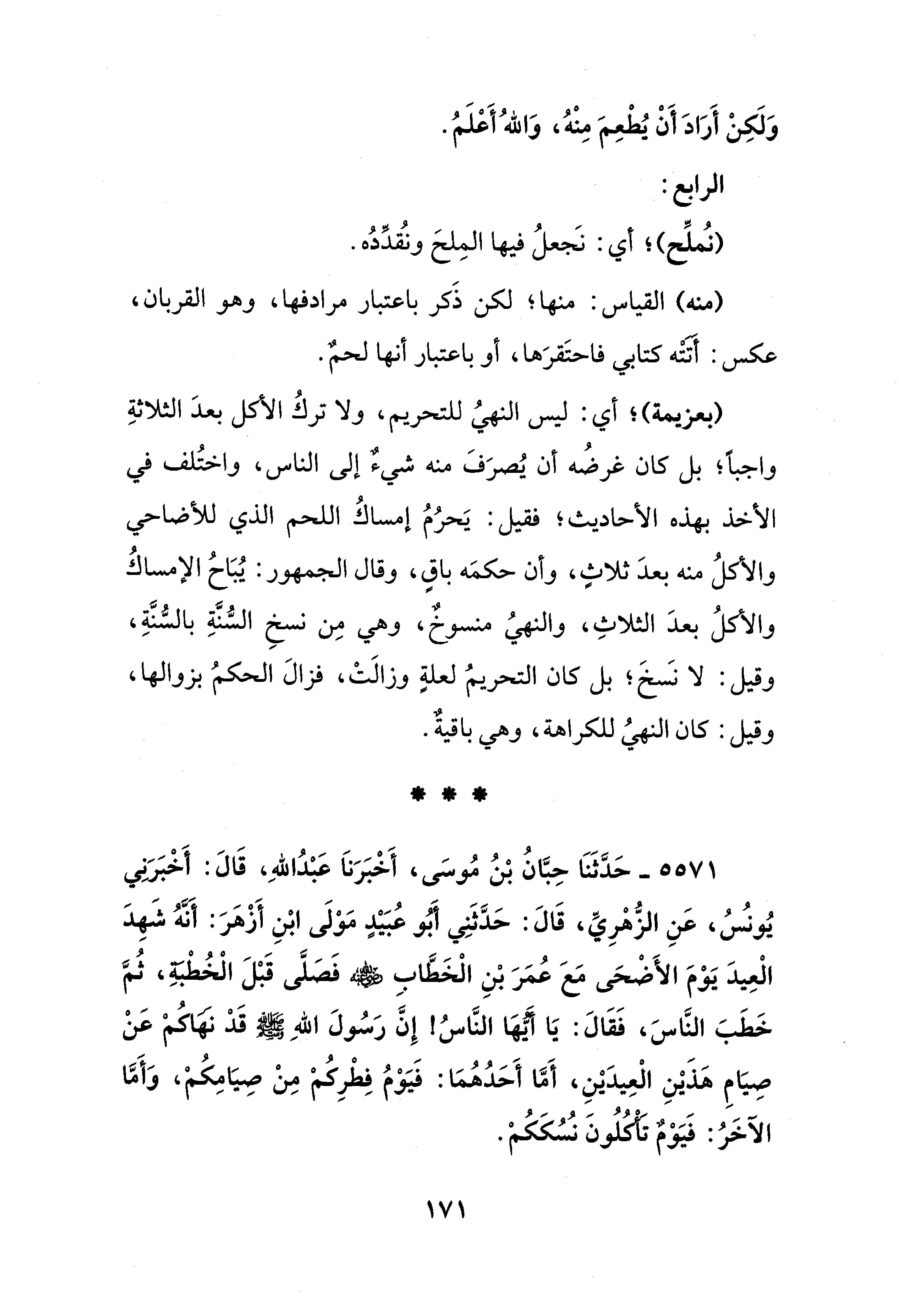 (بعزيمة)؛ أي: ليس النهيُ للتحريم، ولا تركُ الأكل بعدَ الثلاثةِ واجبًا؛ بل كان غرضُه أن يُصرَفَ منه شيءٌ إلى الناس، واختُلف في الأخذ بهذه الأحاديث؛ فقيل: يَحرُمُ إمساكُ اللحم الذي للأضاحي والأكلُ منه بعدَ ثلاثٍ، وأن حكمَه باقٍ، وقال الجمهور: يُبَاحُ الإمساكُ والأكلُ بعدَ الثلاثِ، والنهيُ منسوخٌ، وهي مِن نسخِ السُّنَّةِ بالسُّنَّةِ، وقيل: لا نسَخَ؛ بل كان التحريمُ لعلةٍ وزالَتْ، فزالَ الحكمُ بزوالها، وقيل: كان النهيُ للكراهة، وهي باقيةٌ.