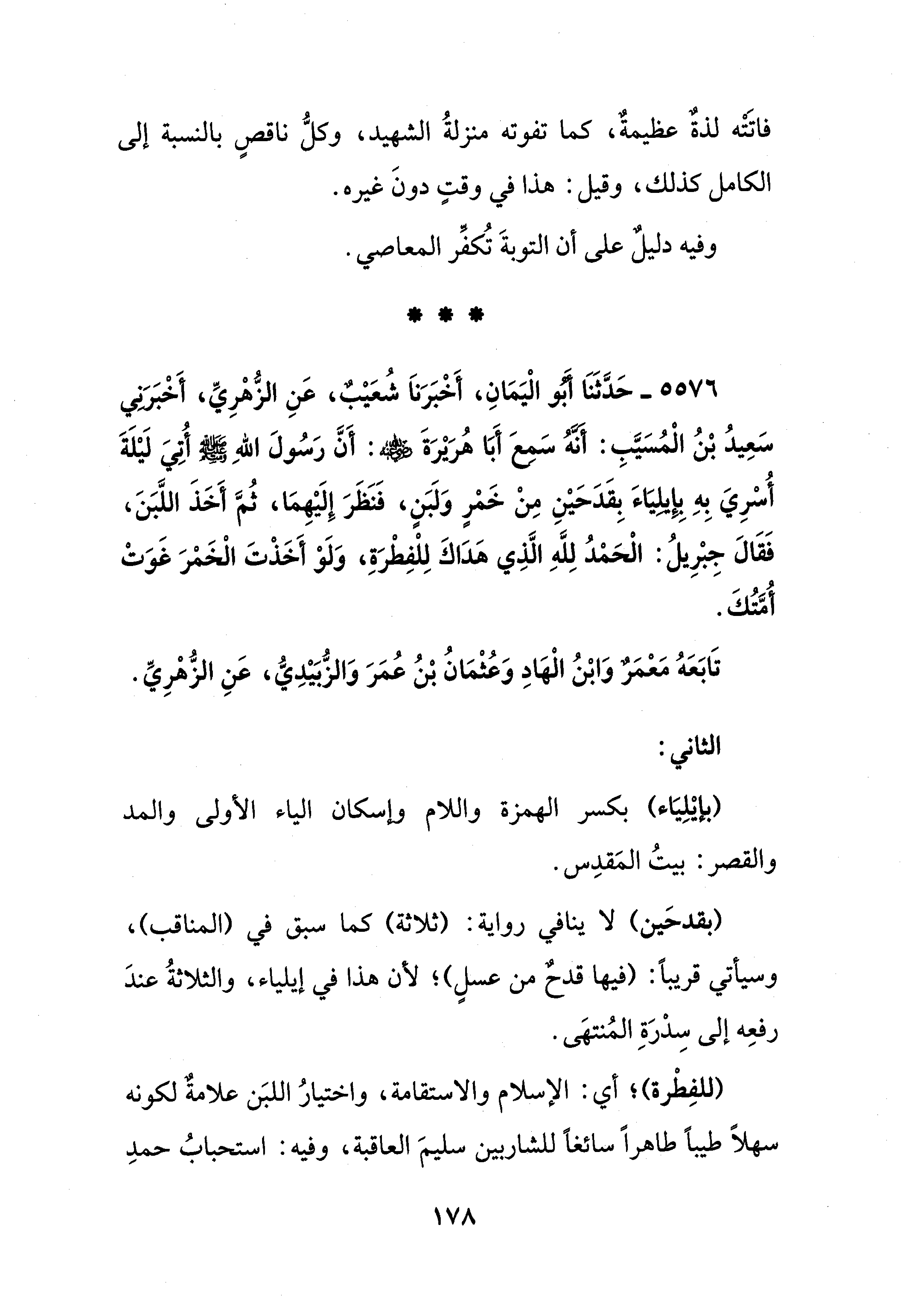 5576 - حَدَّثَنَا أَبُو الْيَمَانِ، أَخْبَرَنَا شُعَيْبٌ، عَنِ الزُّهْرِيِّ، أَخْبَرَنِي سَعِيدُ بْنُ الْمُسَيَّبِ: أَنَّهُ سَمِعَ أَبَا هُرَيْرَةَ - رضي الله عنه -: أَنَّ رَسُولَ اللهِ - صلى الله عليه وسلم - أُتِيَ لَيْلَةَ أُسْرِيَ بِهِ بإِيلِيَاءَ بِقَدَحَيْنِ مِنْ خَمْرٍ وَلَبَنٍ، فَنَظَرَ إِلَيْهِمَا، ثُمَّ أَخَذَ اللَّبَنَ، فَقَالَ جِبْرِيلُ: الْحَمْدُ لِلَّهِ الَّذِي هَدَاكَ لِلْفِطْرَةِ، وَلَوْ أَخَذْتَ الْخَمْرَ غَوَتْ أُمَّتُكَ.