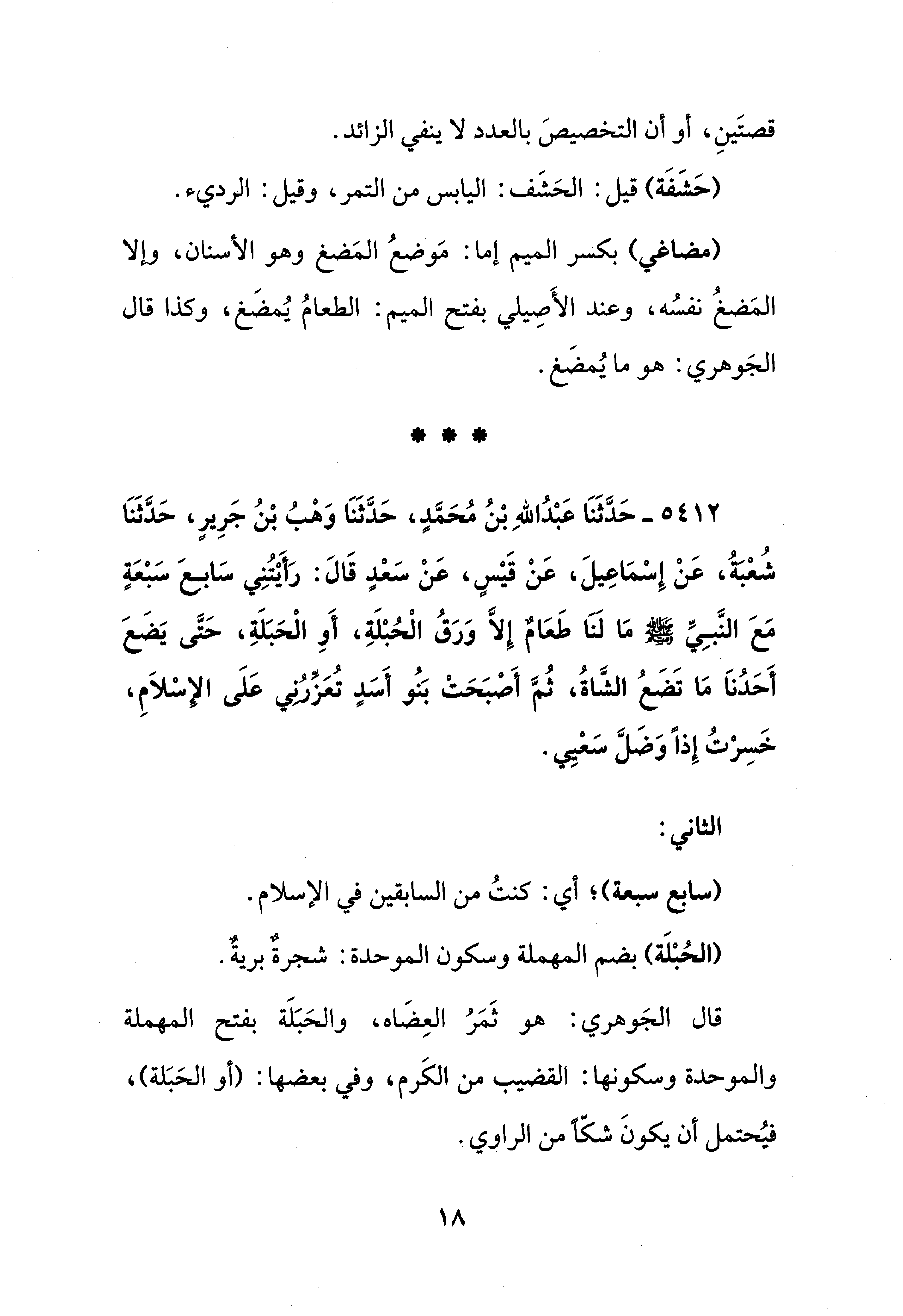 5412 - حَدَّثَنَا عَبْدُ اللهِ بْنُ مُحَمَّدٍ، حَدَّثَنَا وَهْبُ بْنُ جَرِيرٍ، حَدَّثَنَا شُعْبَةُ، عَنْ إِسْمَاعِيلَ، عَنْ قَيْسٍ، عَنْ سَعْدٍ قَالَ: رَأَيْتُنِي سَابعَ سَبْعَةٍ مَعَ النَّبِيِّ - صلى الله عليه وسلم - مَا لَنَا طَعَامٌ إِلَّا وَرَقُ الْحُبْلَةِ، أَوِ الْحَبَلَةِ، حَتَّى يَضَعَ أَحَدُنَا مَا تَضَعُ الشَّاةُ، ثُمَّ أَصْبَحَتْ بَنُو أَسَدٍ تُعَزِّرُني عَلَى الإسْلاَمِ، خَسِرْتُ إِذًا وَضَلَّ سَعْيِي.