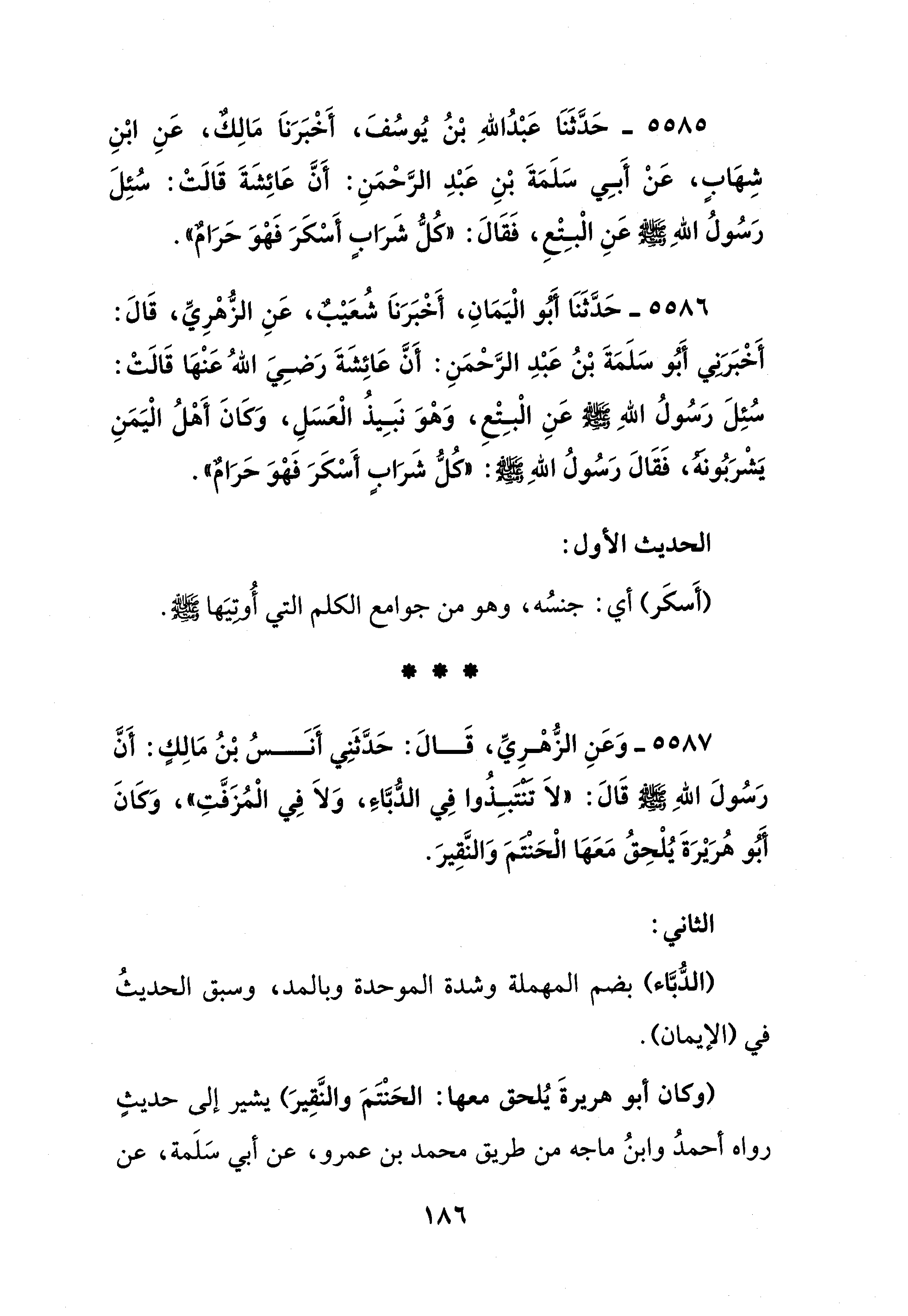 5586 - حَدَّثَنَا أَبُو الْيَمَانِ، أَخْبَرَنَا شُعَيْبٌ، عَنِ الزُّهْرِيِّ، قَالَ: أَخْبَرَنِي أَبُو سَلَمَةَ بْنُ عَبْدِ الرَّحْمَنِ: أَنَّ عَائِشَةَ رَضِيَ اللهُ عَنْهَا قَالَتْ: سُئِلَ رَسُولُ اللهِ - صلى الله عليه وسلم - عَنِ الْبِتْعِ، وَهْوَ نبَيذُ الْعَسَلِ، وَكَانَ أَهْلُ الْيَمَنِ يَشْرَبُونَهُ، فَقَالَ رَسُولُ الله - صلى الله عليه وسلم -: "كُلُّ شَرَابٍ أَسْكَرَ فَهْوَ حَرَامٌ".