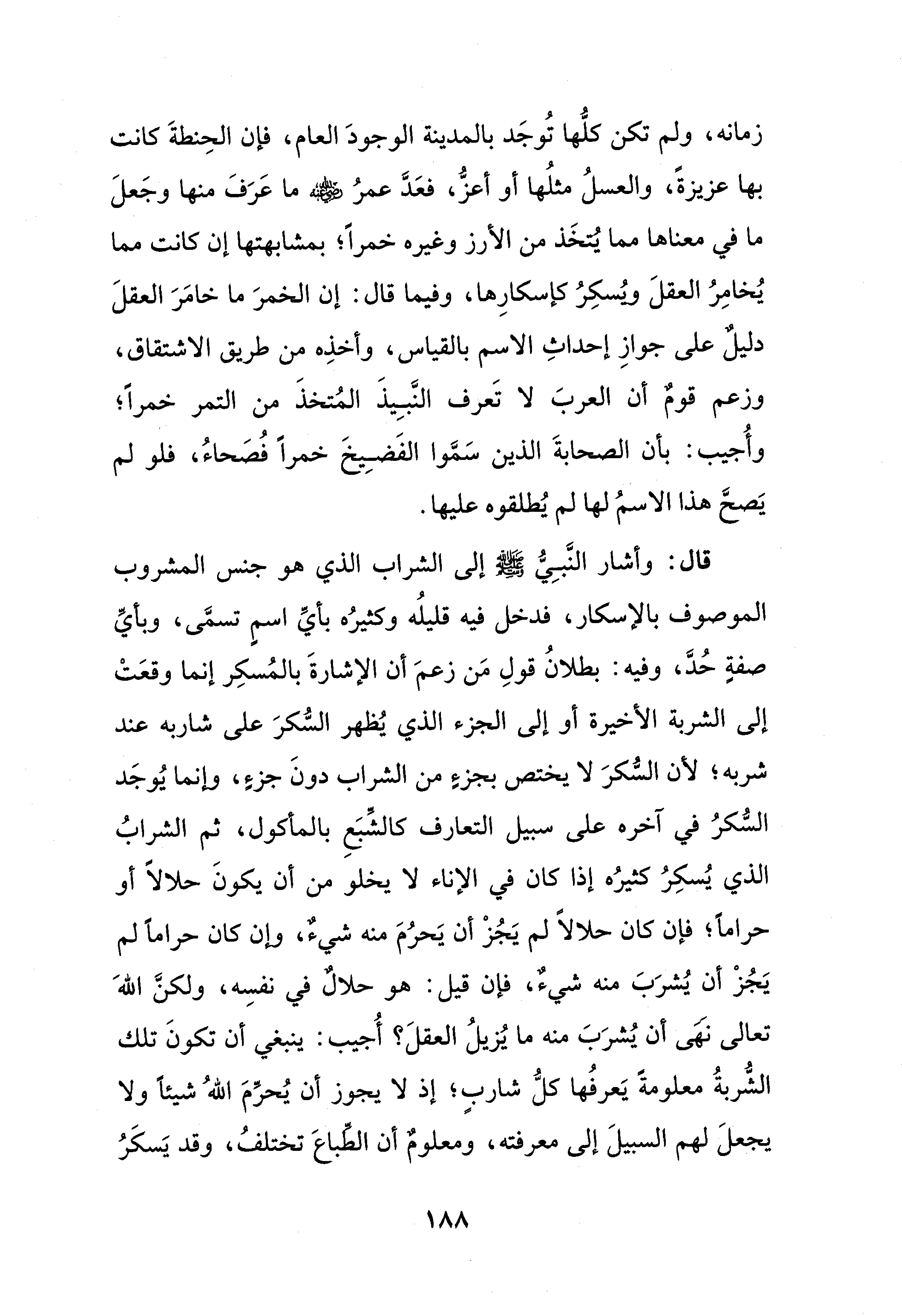 قال: وأشار النَّبِيُّ - صلى الله عليه وسلم - إلى الشراب الذي هو جنس المشروب الموصوف بالإسكار، فدخل فيه قليلُه وكثيرُه بأيِّ اسمٍ تسمَّى، وبأيِّ صفةٍ حُدَّ، وفيه: بطلانُ قولِ مَن زعمَ أن الإشارةَ بالمُسكِر إنما وقعَتْ إلى الشربة الأخيرة أو إلى الجزء الذي يُظهر السُّكرَ على شاربه عند شربه؛ لأن السُّكرَ لا يختص بجزءٍ من الشراب دونَ جزءٍ، وإنما يُوجَد السُّكرُ في آخره على سبيل التعارف كالشِّبَعِ بالمأكول، ثم الشرابُ الذي يُسكِرُ كثيرُه إذا كان في الإناء لا يخلو من أن يكونَ حلالًا أو حرامًا، فإن كان حلالًا لم يَجُزْ أن يَحرُمَ منه شيءٌ، وإن كان حرامًا لم يَجُزْ أن يُشرَبَ منه شيءٌ، فإن قيل: هو حلالٌ في نفسِه، ولكنَّ الله تعالى نَهَى أن يُشرَبَ منه ما يُزيلُ العقلَ؟ أُجيب: ينبغي أن تكونَ تلك الشُّربةُ معلومةً يَعرفُها كلُّ شاربٍ، إذ لا يجوز أن يُحرِّمَ اللهُ شيئًا ولا يجعلَ لهم السبيلَ إلى معرفته، ومعلومٌ أن الطِّباعَ تختلفُ، وقد يَسكَرُ