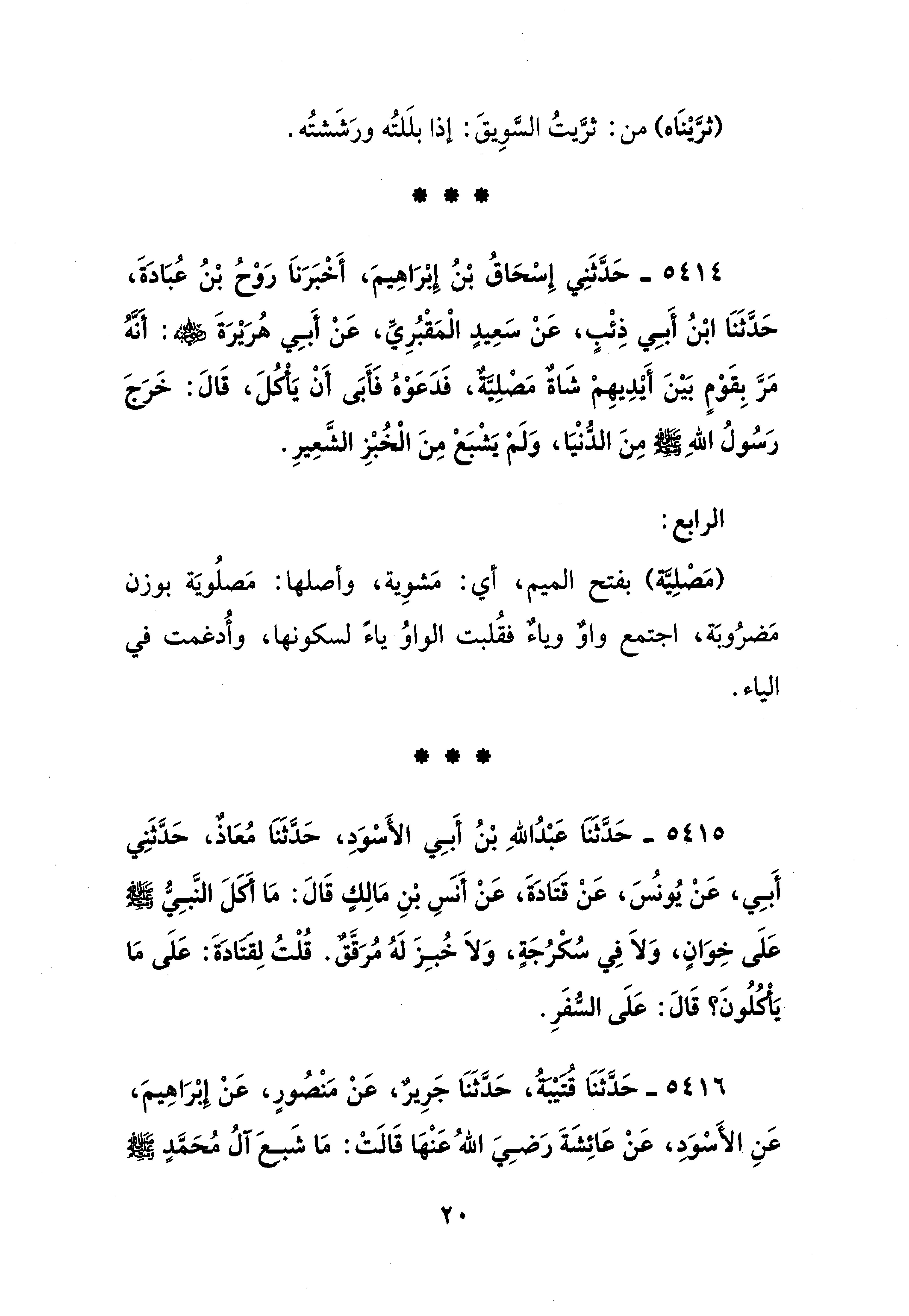 5414 - حَدَّثَنِي إِسْحَاقُ بْنُ إِبْرَاهِيمَ، أَخْبَرَنَا رَوْحُ بْنُ عُبَادَةَ، حَدَّثَنَا ابْنُ أَبِي ذِئْبٍ، عَنْ سَعِيدٍ الْمَقْبُرِيِّ، عَنْ أَبِي هُرَيْرَةَ - رضي الله عنه -: أَنَّهُ مَرَّ بِقَوْمٍ بَيْنَ أَيْدِيهِمْ شَاةٌ مَصْلِيَّةٌ، فَدَعَوْهُ فَأبَى أَنْ يَأْكَلَ، قَالَ: خَرَجَ رَسُول اللهِ - صلى الله عليه وسلم - مِنَ الدُّنْيَا، وَلَمْ يَشْبَعْ مِنَ الْخُبْزِ الشَّعِيرِ.