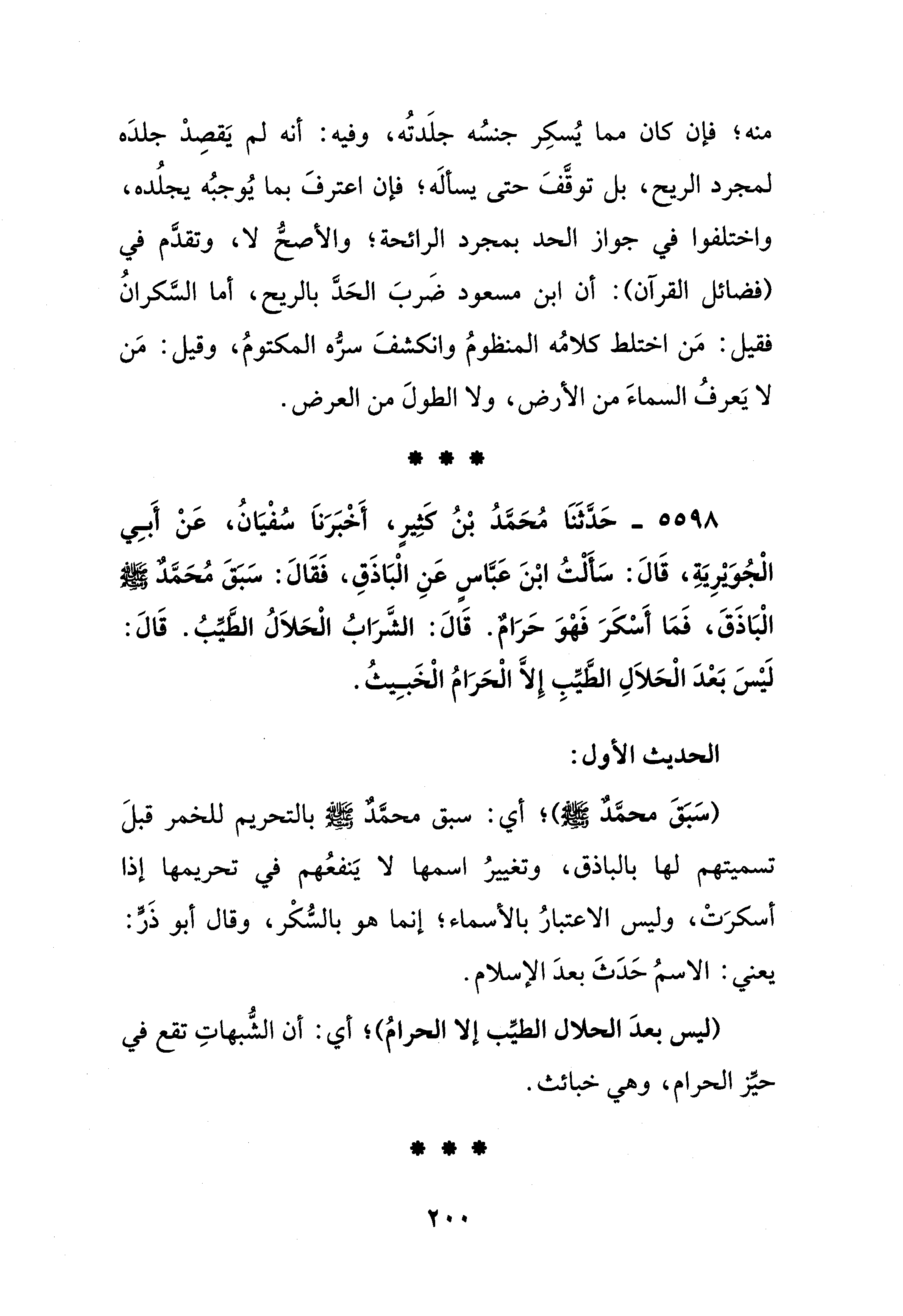 5598 - حَدَّثَنَا مُحَمَّدُ بْنُ كَثِيرٍ، أَخْبَرَنَا سُفْيَانُ، عَنْ أَبِي الْجُويرِيَةِ، قَالَ: سَأَلْتُ ابْنَ عَبَّاسٍ عَنِ الْبَاذَقِ، فَقَالَ: سَبق مُحَمَّدٌ - صلى الله عليه وسلم - الْبَاذَقَ، فَمَا أَسْكَرَ فَهْوَ حَرَامٌ. قَالَ: الشَّرَابُ الْحَلاَلُ الطَّيِّبُ. قَالَ: لَيسَ بَعْدَ الْحَلاَلِ الطَّيِّبِ إِلَّا الْحَرَامُ الْخَبِيثُ.