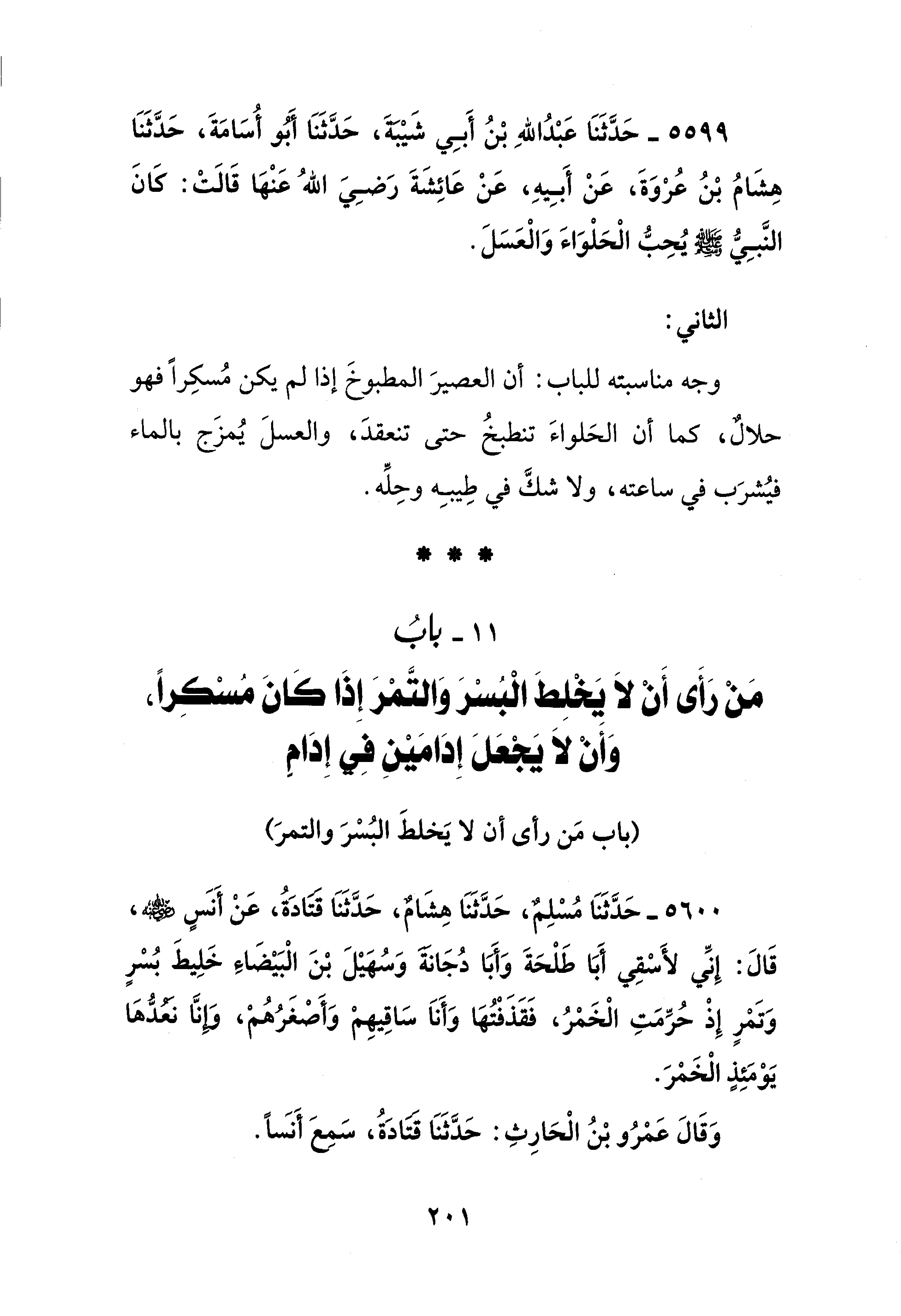 5599 - حَدَّثَنَا عَبْدُ اللهِ بْنُ أَبِي شَيْبْةَ، حَدَّثَنَا أبُو أُسَامَةَ، حَدَّثَنَا هِشَامُ بْنُ عُرْوَةَ، عَنْ أَبِيهِ، عَنْ عَائِشَةَ رَضِيَ اللهُ عَنْهَا قَالَتْ: كَانَ النَّبِيُّ - صلى الله عليه وسلم - يُحِبُّ الْحَلْوَاءَ وَالْعَسَلَ.