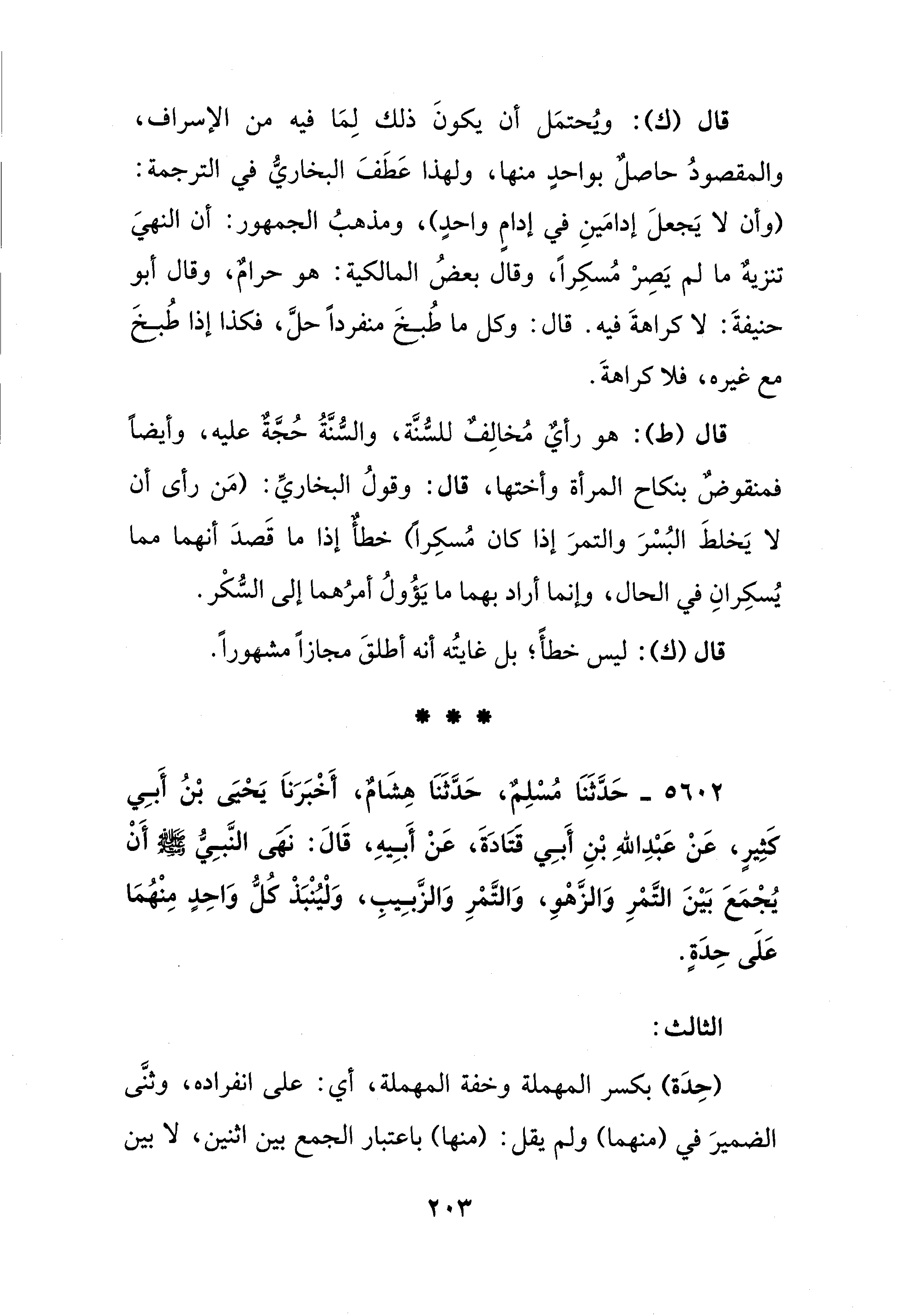 5602 - حَدَّثَنَا مُسْلِمٌ، حَدَّثَنَا هِشَامٌ، أَخْبَرَنَا يَحْيَى بْنُ أَبِي كَثِيرٍ، عَنْ عَبْدِ اللهِ بْنِ أَبِي قتادَةَ، عَنْ أَبِيهِ، قَالَ: نهى النَّبِيُّ - صلى الله عليه وسلم - أَنْ يُجْمَعَ بَيْنَ التَّمْرِ وَالزَّهْوِ، وَالتَّمْرِ وَالزَّبِيبِ، وَلْيُنْبَذْ كُلُّ وَاحِدٍ مِنْهُمَا عَلَى حِدَةٍ.