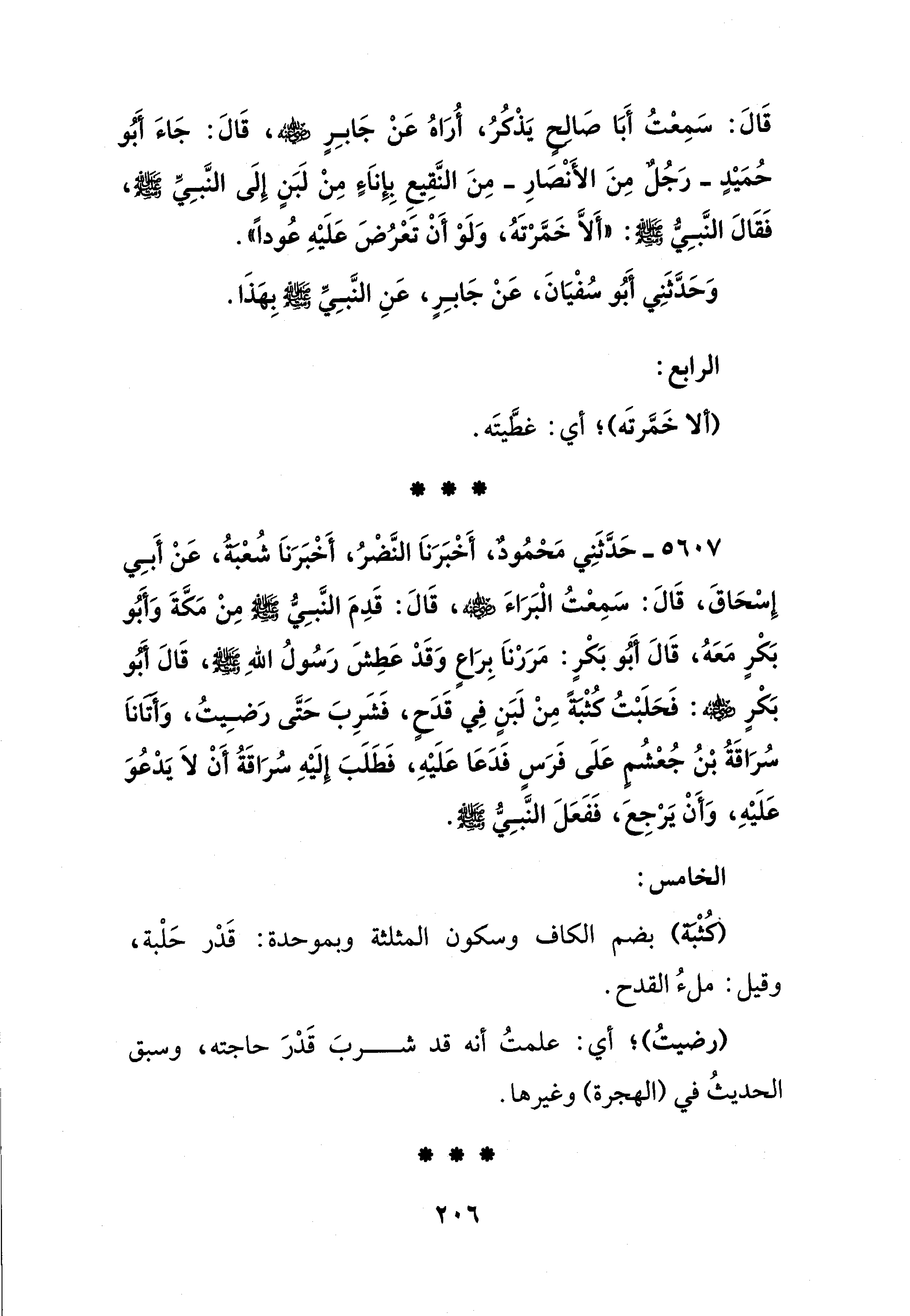 5607 - حَدَّثَنِي مَحْمُودٌ, أَخْبَرَنَا النَّضْرُ، أَخْبَرَنَا شُعْبَةُ، عَنْ أَبِي إِسْحَاقَ، قَالَ: سَمِعْتُ الْبَرَاءَ - رضي الله عنه -، قَالَ: قَدِمَ النَّبِيُّ - صلى الله عليه وسلم - مِنْ مَكَّةَ وَأبَو بَكْرٍ مَعَهُ، قَالَ أَبُو بَكْرٍ: مَرَرْنَا بِرَاعٍ وَقَدْ عَطِشَ رَسُولُ اللهِ - صلى الله عليه وسلم -، قَالَ أبو بَكْرٍ - رضي الله عنه -: فَحَلَبْتُ كُثْبَةً مِنْ لَبَنٍ في قَدَحٍ، فَشَرِبَ حَتَّى رَضِيتُ، وَأتانَا سُرَاقَةُ بْنُ جُعْشُم عَلَى فَرَسٍ فَدَعَا عَلَيْهِ، فَطَلَبَ إِلَيْهِ سُرَاقَةُ أَنْ لَا يَدْعُوَ عَلَيْهِ، وَأَنْ يَرْجِعَ، فَفَعَلَ النَّبِي - صلى الله عليه وسلم -.