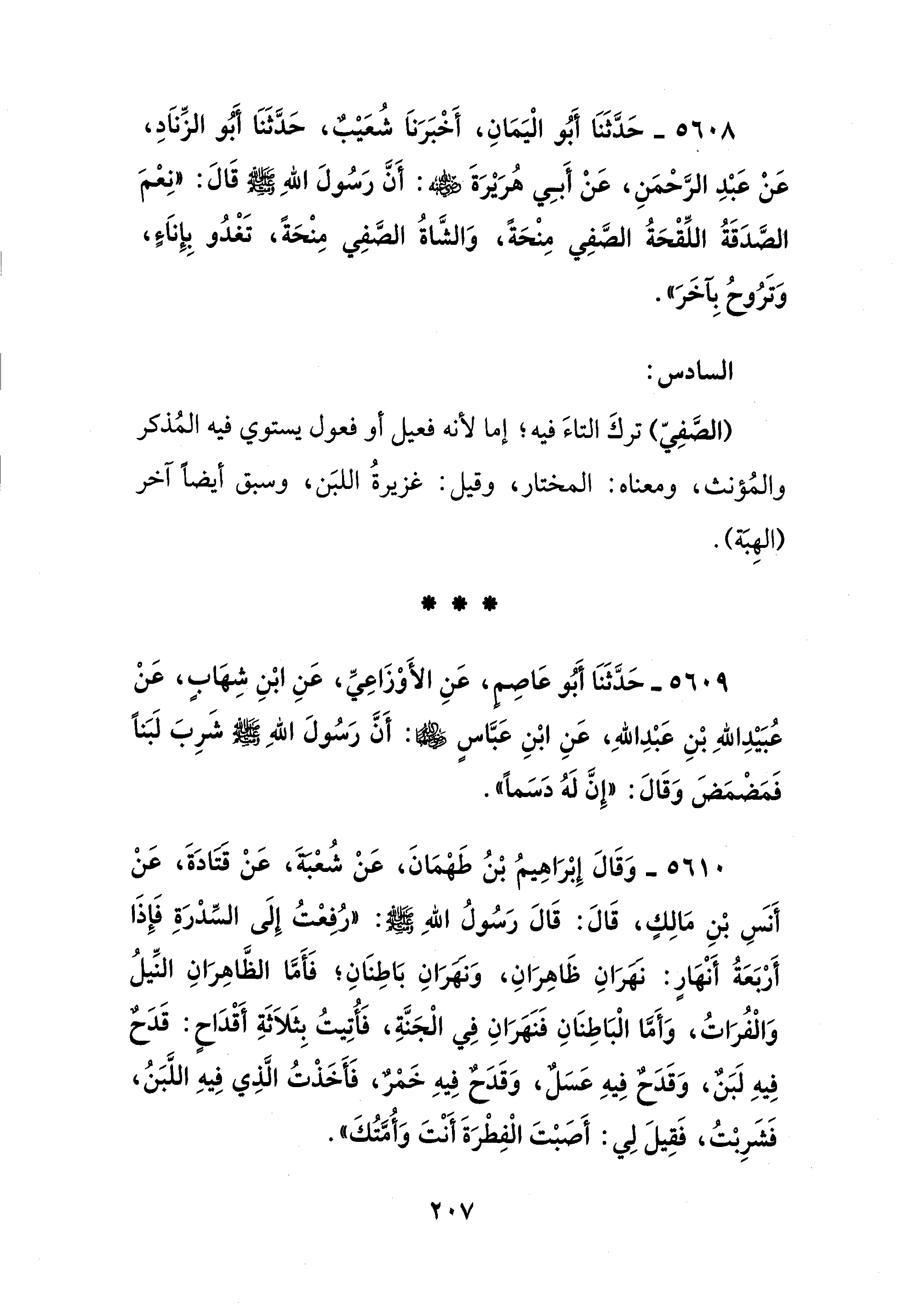 5608 - حَدَّثَنَا أَبُو الْيَمَانِ، أَخْبَرَنَا شُعَيْبٌ، حَدَّثَنَا أبو الزِّنَادِ، عَنْ عَبْدِ الرَّحْمَنِ، عَنْ أَبِي هُرَيْرَةَ - رضي الله عنه -: أَنَّ رَسُولَ اللهِ - صلى الله عليه وسلم - قَالَ: "نِعْمَ الصَّدَقَةُ اللِّقْحَةُ الصَّفِي مِنْحَةً، وَالشَّاةُ الصَّفِي مِنْحَةً، تَغْدُو بِإِنَاءٍ، وَتَرُوحُ بِآخَرَ".