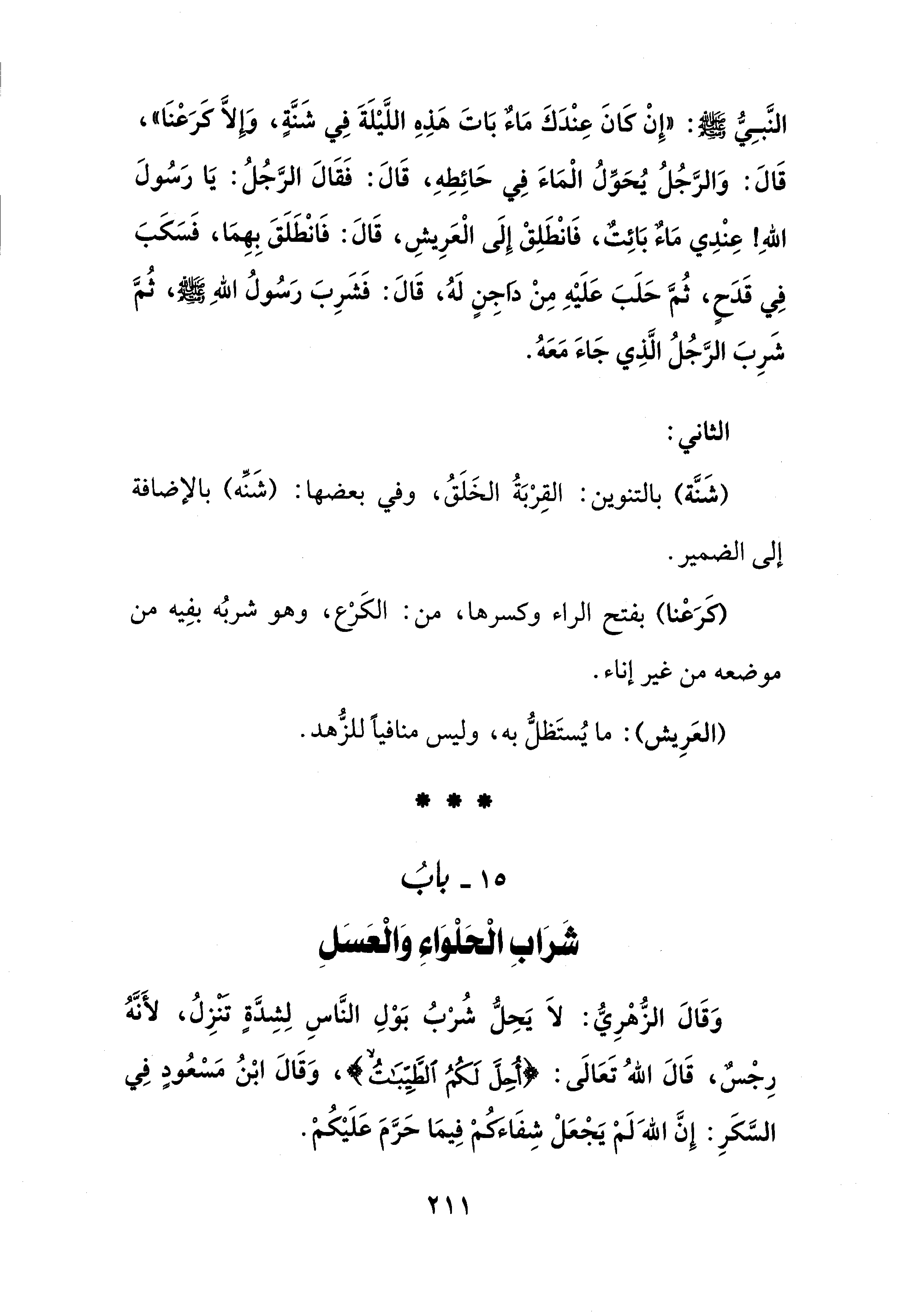 النَّبِي - صلى الله عليه وسلم -: "إِنْ كَانَ عِنْدَكَ مَاءٌ بَاتَ هَذِهِ اللَّيلَةَ في شَنَّةٍ، وَإِلَّا كَرَعْنَا"، قَالَ: وَالرَّجُلُ يُحَوِّلُ الْمَاءَ في حَائِطِهِ، قَالَ: فَقَالَ الرَّجُلُ: يَا رَسُولَ اللهِ! عِنْدِي مَاءٌ بَائِتٌ، فَانْطَلِقْ إِلَى الْعَرِيشِ، قَالَ: فَانْطَلَقَ بِهِمَا، فَسَكَبَ في قَدَحٍ، ثُمَّ حَلَبَ عَلَيْهِ مِنْ داجِنٍ لَهُ، قَالَ: فَشَرِبَ رَسُولُ اللهِ - صلى الله عليه وسلم -، ثُمَّ شَرِبَ الرَّجُلُ الَّذِي جَاءَ مَعَهُ.