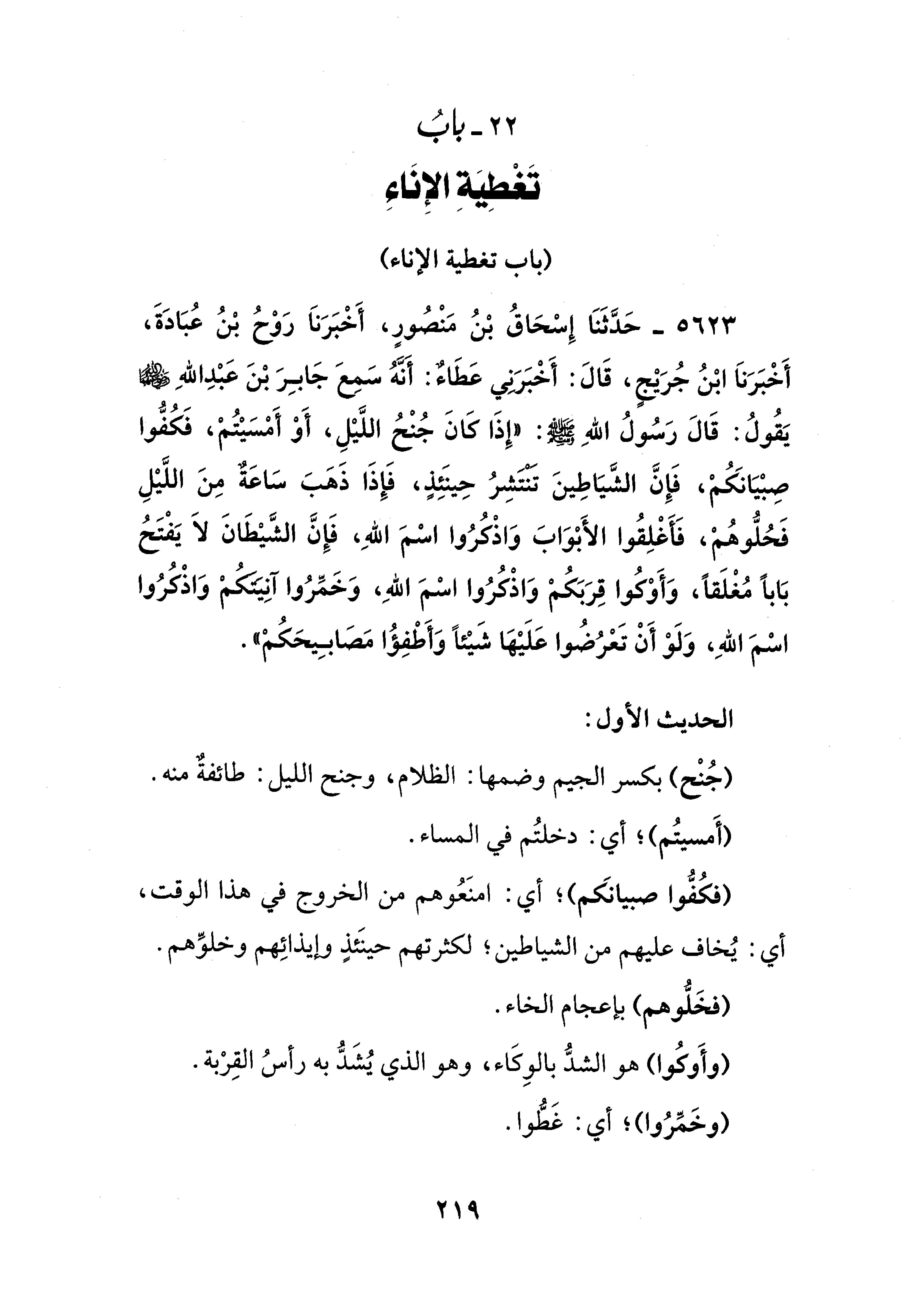 5623 - حَدَّثَنَا إِسْحَاقُ بْنُ مَنْصُورٍ، أَخْبَرَنَا رَوْحُ بْنُ عُبَادَةَ، أَخْبَرَنَا ابْنُ جُرَيْجٍ، قَالَ: أَخْبَرَنِي عَطَاءٌ: أَنَّهُ سَمِعَ جَابِرَ بْنَ عَبْدِ اللهِ - رضي الله عنهما - يَقُولُ: قَالَ رَسُولُ اللهِ - صلى الله عليه وسلم -: "إِذَا كَانَ جُنْحُ اللَّيْلِ، أَوْ أَمْسَيْتُمْ، فَكُفُّوا صِبْيَانَكُمْ، فَإِنَّ الشَّيَاطِينَ تنتَشِرُ حِينَئِذٍ، فَإِذَا ذَهَبَ سَاعَةٌ مِنَ اللَّيْلِ فَحُلُّوهُمْ، فَأَغْلِقُوا الأَبْوَابَ وَاذْكُرُوا اسْمَ اللهِ، فَإِنَّ الشَّيْطَانَ لَا يَفْتَحُ بَابًا مُغْلَقًا، وَأَوْكوا قِرَبَكُمْ وَاذْكُرُوا اسْمَ اللهِ، وَخَمِّرُوا آنِيتكُمْ وَاذْكرُوا اسْمَ اللهِ، وَلَوْ أَنْ تَعْرُضُوا عَلَيْهَا شَيْئًا وَأَطْفِؤُا مَصَابِيحَكُمْ".