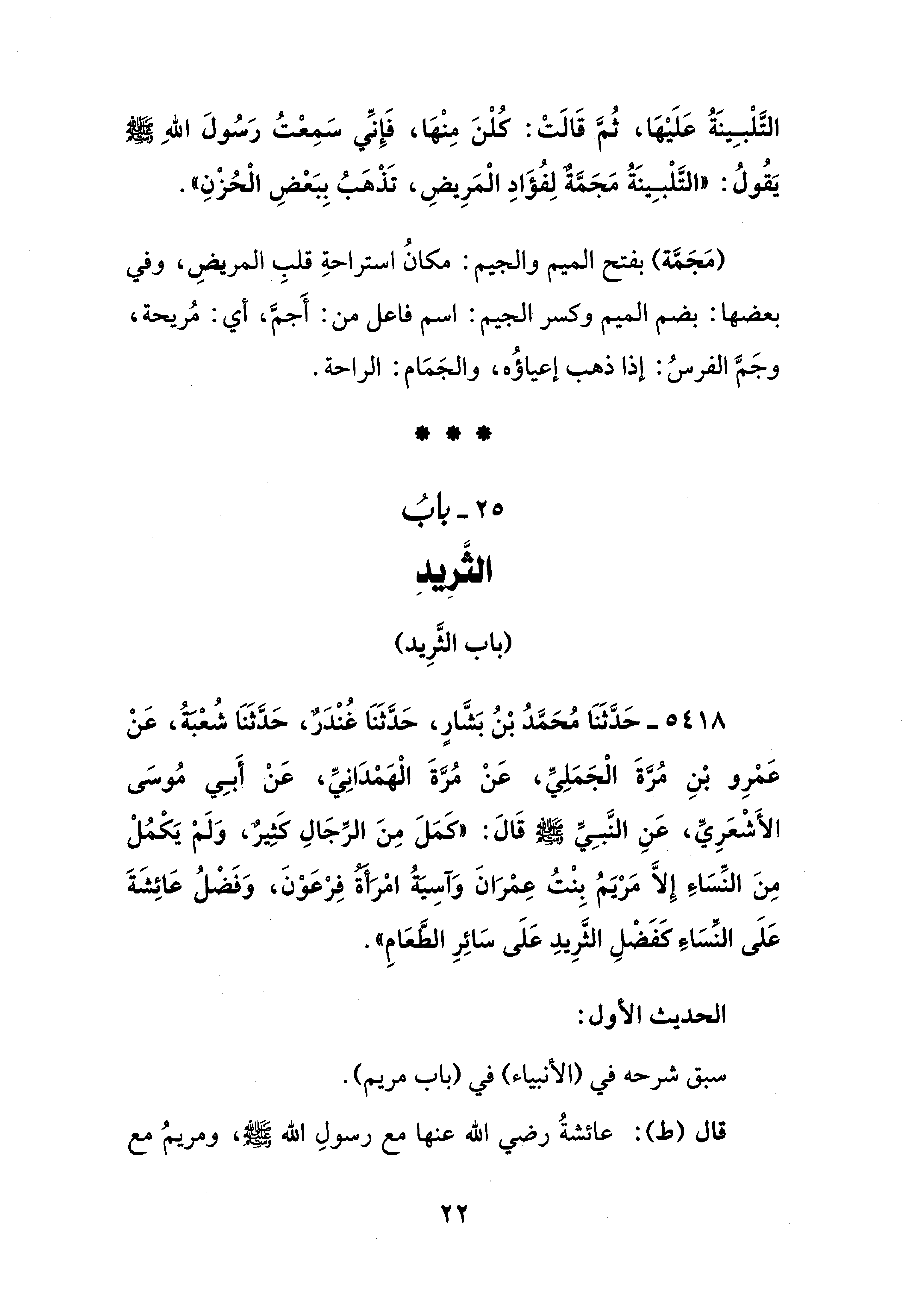 5418 - حَدَّثَنَا مُحَمَّدُ بْنُ بَشَّارٍ، حَدَّثَنَا غُنْدَرٌ، حَدَّثَنَا شُعْبةُ، عَنْ عَمْرِو بْنِ مُرَّةَ الْجَمَلِيِّ، عَنْ مُرَّةَ الْهَمْدَانِيِّ، عَنْ أَبِي مُوسَى الأَشْعَرِيِّ، عَنِ النَّبِيِّ - صلى الله عليه وسلم - قَالَ: "كَمَلَ مِنَ الرِّجَالِ كثِيرٌ، وَلَمْ يَكْمُلْ مِنَ النِّسَاءِ إِلَّا مَرْيَمُ بِنْتُ عِمْرَانَ وَآسِيةُ امْرَأةٌ فِرْعَوْنَ، وَفَضْلُ عَائِشَةَ عَلَى النِّسَاءَ كَفَضْلِ الثَّرِيدِ عَلَى سَائِرِ الطَّعَامِ".
