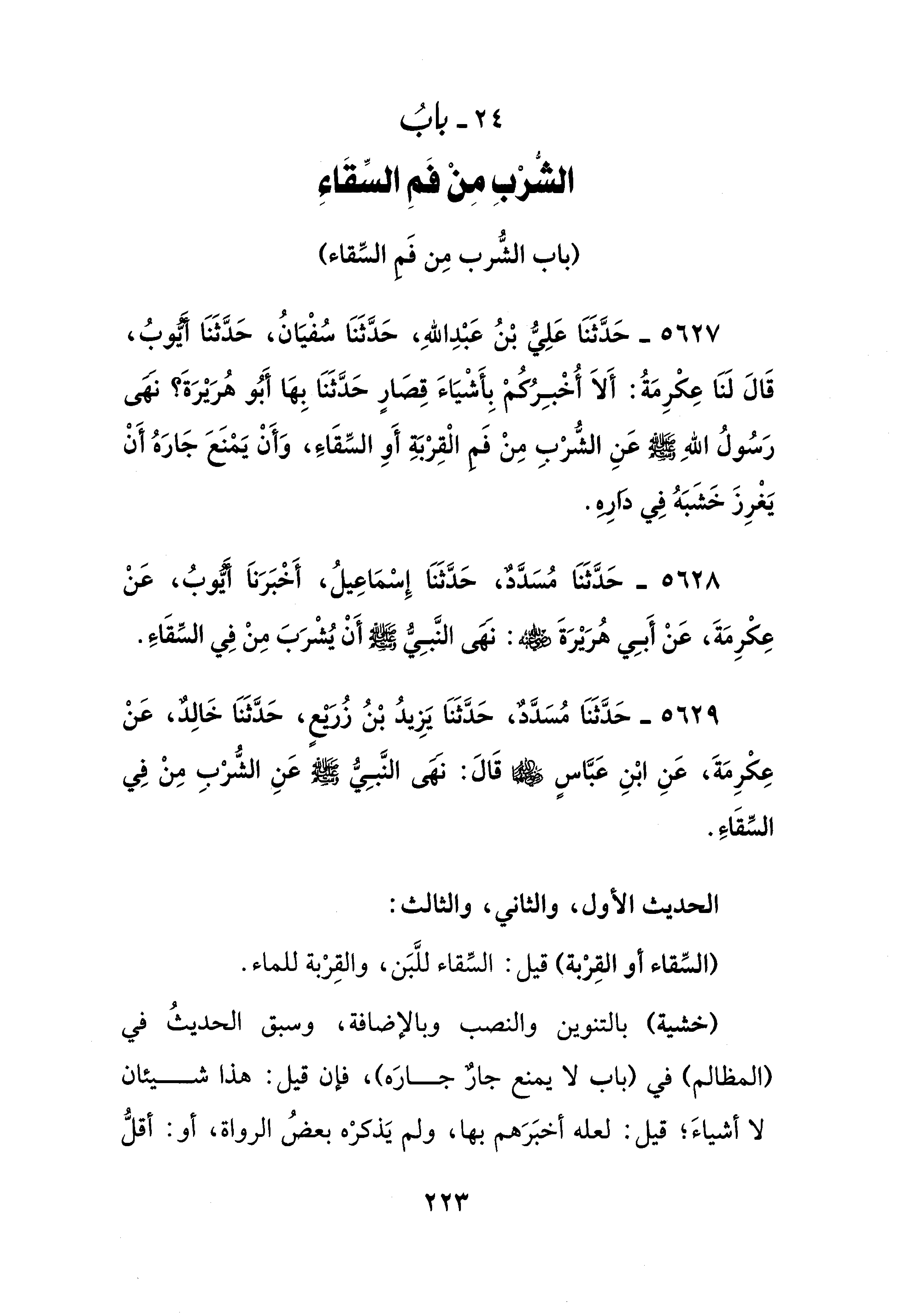 5627 - حَدَّثَنَا عَلِيُّ بْنُ عَبْدِ اللهِ، حَدَّثَنَا سُفْيَانُ، حَدَّثَنَا أيوبُ، قَالَ لَنَا عِكْرِمَةُ: أَلاَ أُخْبِرُكُمْ بِأَشْيَاءَ قِصَارٍ حَدَّثَنَا بِهَا أَبُو هُرَيْرَةَ؟ نهى رَسُولُ اللهِ - صلى الله عليه وسلم - عَنِ الشُّرْبِ مِنْ فَم الْقِرْبَةِ أَوِ السِّقَاءِ، وَأَنْ يَمْنَعَ جَارَهُ أَنْ يَغْرِزَ خَشَبَهُ في دارِه.