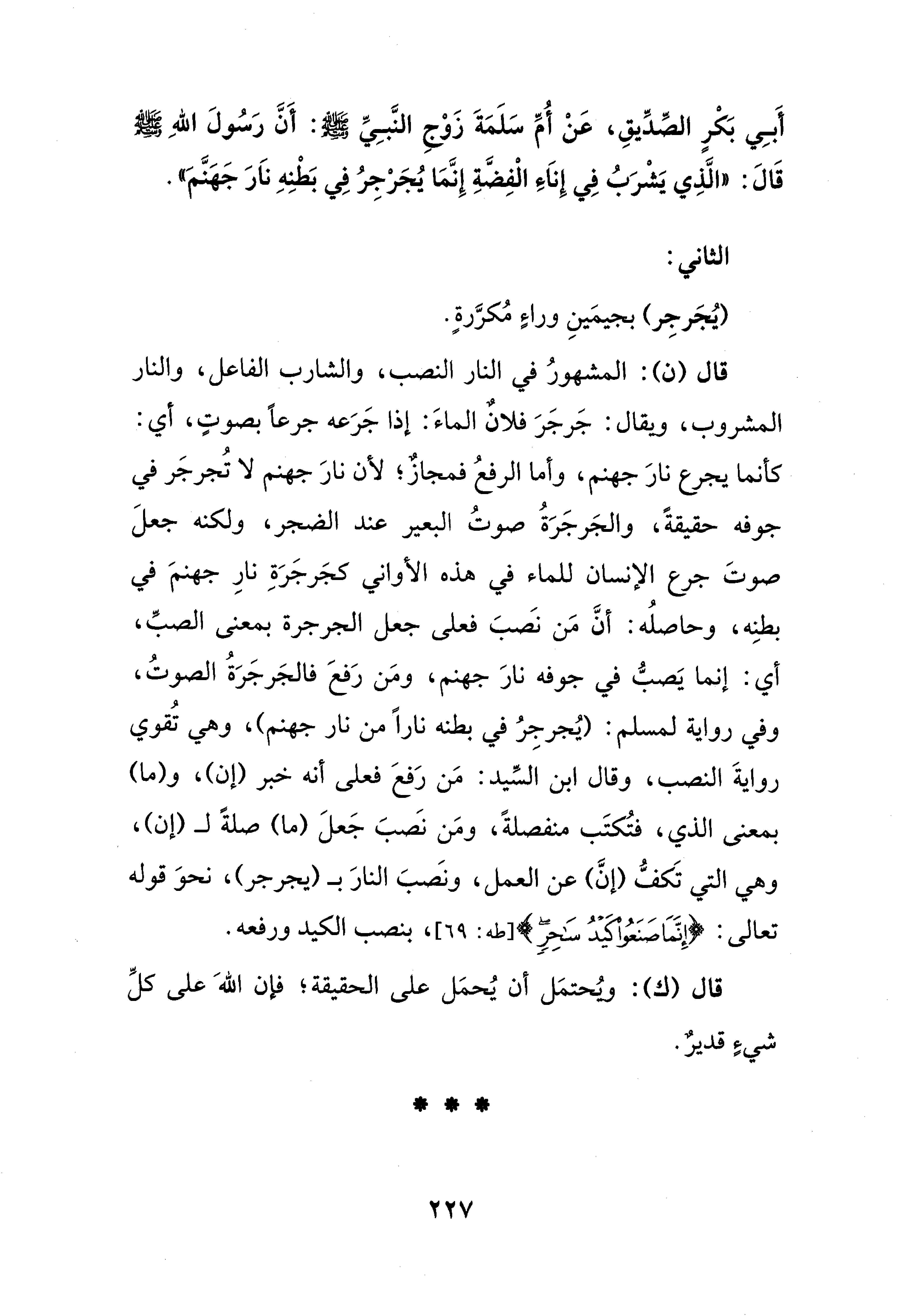 قال (ن): المشهورُ في النار النصب، والشارب الفاعل، والنار المشروب، ويقال: جَرجَرَ فلانٌ الماءَ: إذا جَرَعه جرعًا بصوتٍ، أي: كأنما يجرع نارَ جهنم، وأما الرفعُ فمجازٌ؛ لأن نارَ جهنم لا تجرجَر في جوفه حقيقةً، والجَرجَرَةُ صوتُ البعير عند الضمير، ولكنه جعلَ صوتَ جرع الإنسان للماء في هذه الأواني كجَرجَرَةِ نارِ جهنمَ في بطنِه، وحاصلُه: أنَّ مَن نَصبَ فعلى جعل الجرجرة بمعنى الصبِّ، أي: إنما يَصبُّ في جوفه نارَ جهنم، ومَن رَفعَ فالجَرجَرَةُ الصوتُ، وفي رواية لمسلم: (يُجرجِرُ في بطنه نارًا من نار جهنم)، وهي تقوي روايةَ النصب، وقال ابن السّيد: مَن رَفعَ فعلى أنه خبر (إن)، و (ما) بمعنى الذي، فتُكتَب منفصلةً، ومَن نَصبَ جَعلَ (ما) صلةً لـ (إن)، وهي التي تَكفُّ (إنَّ) عن العمل، ونَصبَ النارَ بـ (يجرجر)، نحوَ قوله تعالى: {إِنَّمَا صَنَعُوا كَيْدُ سَاحِرٍ} [طه: 69] , بنصب الكيد ورفعه.