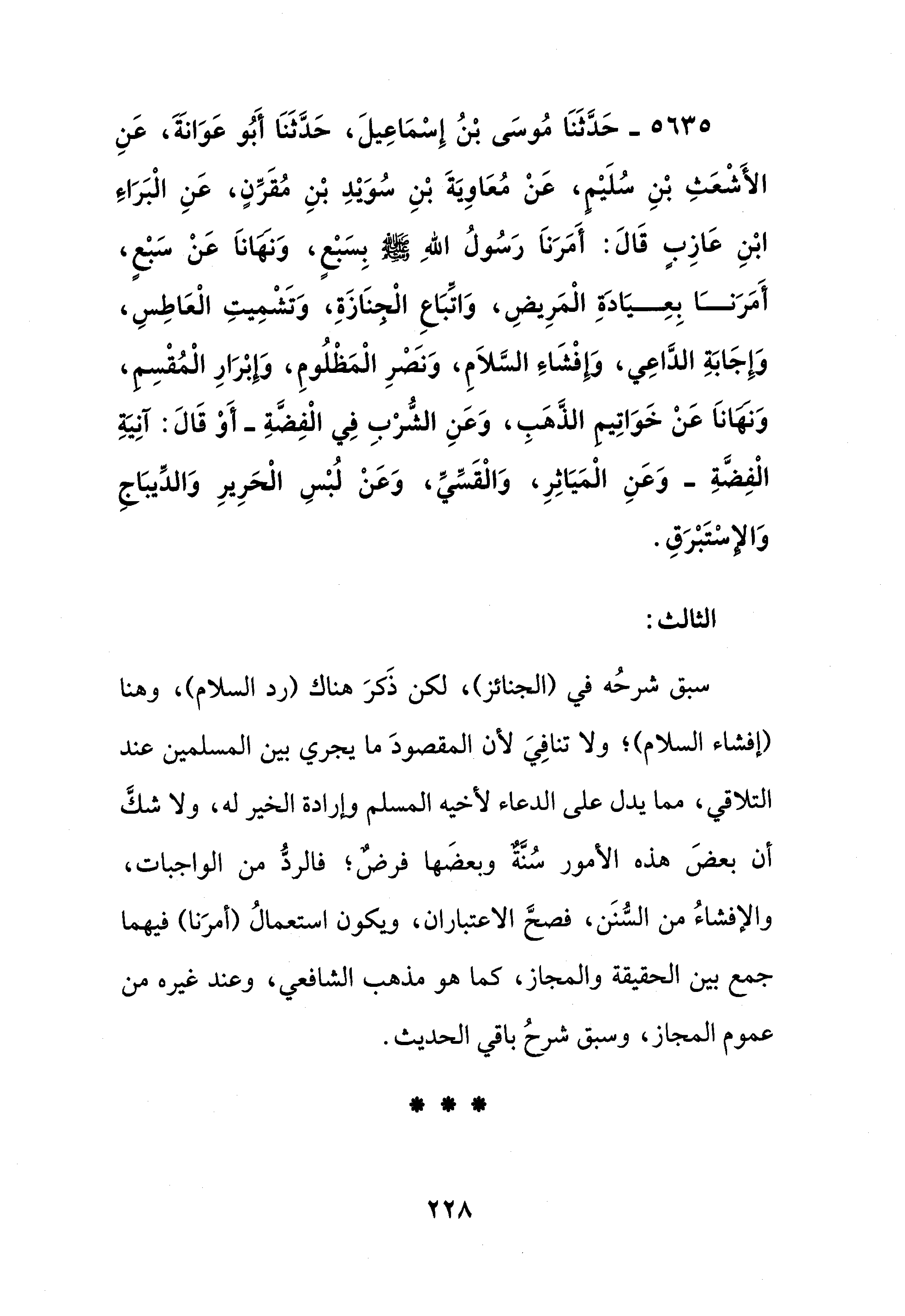 5635 - حَدَّثَنَا مُوسَى بْنُ إِسْمَاعِيلَ، حَدَّثَنَا أَبُو عَوَانة، عَنِ الأَشْعَثِ بْنِ سُلَيْمٍ، عَنْ مُعَاوِيَةَ بْنِ سُوَيْدِ بْنِ مُقَرِّنٍ، عَنِ الْبَرَاءِ بْنِ عَازِبٍ قَالَ: أَمَرَنَا رَسُولُ اللهِ - صلى الله عليه وسلم - بِسَبْعٍ، وَنهانَا عَنْ سَبْعٍ، أَمَرَنَا بِعِيَادَةِ الْمَرِيضِ، وَاتِّبَاعِ الْجنَازَةِ، وَتَشْمِيتِ الْعَاطِسِ، وَإِجَابَةِ الدَّاعِي، وَإِفْشَاءِ السَّلاَمِ، وَنَصْرِ الْمَظْلُومِ، وَإِبْرَارِ الْمُقْسِم، وَنهانَا عَنْ خَوَاتِيم الذَّهَبِ، وَعَنِ الشُّرْبِ في الْفِضَّةِ -أَوْ قَالَ: آنِيةِ الْفِضَّةِ- وَعَنِ الْمَيَاثِرِ، وَالْقَسِّيِّ، وَعَنْ لُبْسِ الْحَرِيرِ وَالدِّيبَاجِ وَالإسْتَبْرَقِ.