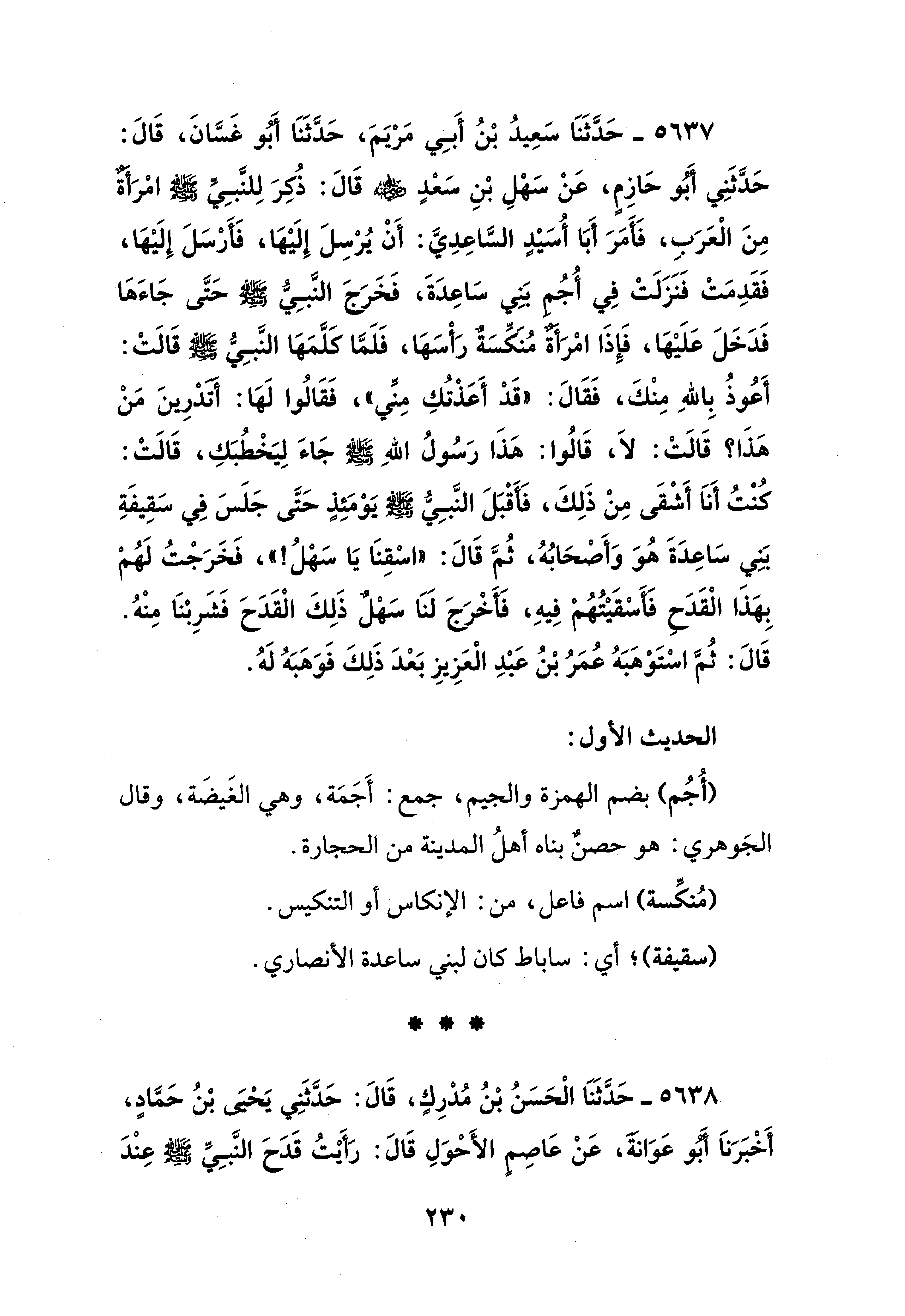 5637 - حَدَّثَنَا سَعِيدُ بْنُ أَبِي مَرْيَمَ، حَدَّثَنَا أَبُو غَسَّانَ، قَالَ: حَدَّثَنِي أَبو حَازِمٍ، عَنْ سَهْلِ بْنِ سَعْدٍ - رضي الله عنه - قَالَ: ذُكِرَ لِلنَّبِيِّ - صلى الله عليه وسلم - امْرَأةٌ مِنَ الْعَرَبِ، فَأَمَرَ أَبَا أُسَيْدٍ السَّاعِدِيَّ: أَنْ يُرْسِلَ إِلَيْهَا، فَأَرْسَلَ إِلَيْهَا، فَقَدِمَتْ فَنَزَلَتْ في أُجُمِ بَنِي سَاعِدَةَ، فَخَرَجَ النَّبِيُّ - صلى الله عليه وسلم - حَتَّى جَاءَهَا فَدَخَلَ عَلَيْهَا، فَإِذَا امْرَأةٌ مُنَكِّسَةٌ رَأْسَهَا، فَلَمَّا كلَّمَهَا النَّبِي - صلى الله عليه وسلم - قَالَتْ: أَعُوذُ باللهِ مِنْكَ، فَقَالَ: "قَدْ أَعَذْتُكِ مِنِّي"، فَقَالُوا لَهَا: أتدْرِينَ مَنْ هَذَا؟ قَالَتْ: لَا، قَالُوا: هَذَا رَسُولُ اللهِ - صلى الله عليه وسلم - جَاءَ لِيَخْطُبَكِ، قَالَتْ: كُنْتُ أَنَا أَشْقَى مِنْ ذَلِكَ، فَأَقْبَلَ النَّبِيُّ - صلى الله عليه وسلم - يَوْمَئِذٍ حَتَّى جَلَسَ في سَقِيفَةِ بَنِي سَاعِدَةَ هُوَ وَأَصْحَابُهُ، ثُمَّ قَالَ: "اسْقِنَا يَا سَهْلُ! "، فَخَرَجْتُ لَهُمْ بِهَذَا الْقَدَحِ فَأَسْقَيْتُهُمْ فِيهِ، فَأَخْرَجَ لَنَا سَهْلٌ ذَلِكَ الْقَدَحَ فَشَرِبْنَا مِنْهُ. قَالَ: ثُمَّ اسْتَوْهَبَهُ عُمَرُ بْنُ عَبْدِ الْعَزِيزِ بَعْدَ ذَلِكَ فَوَهَبَهُ لَهُ.