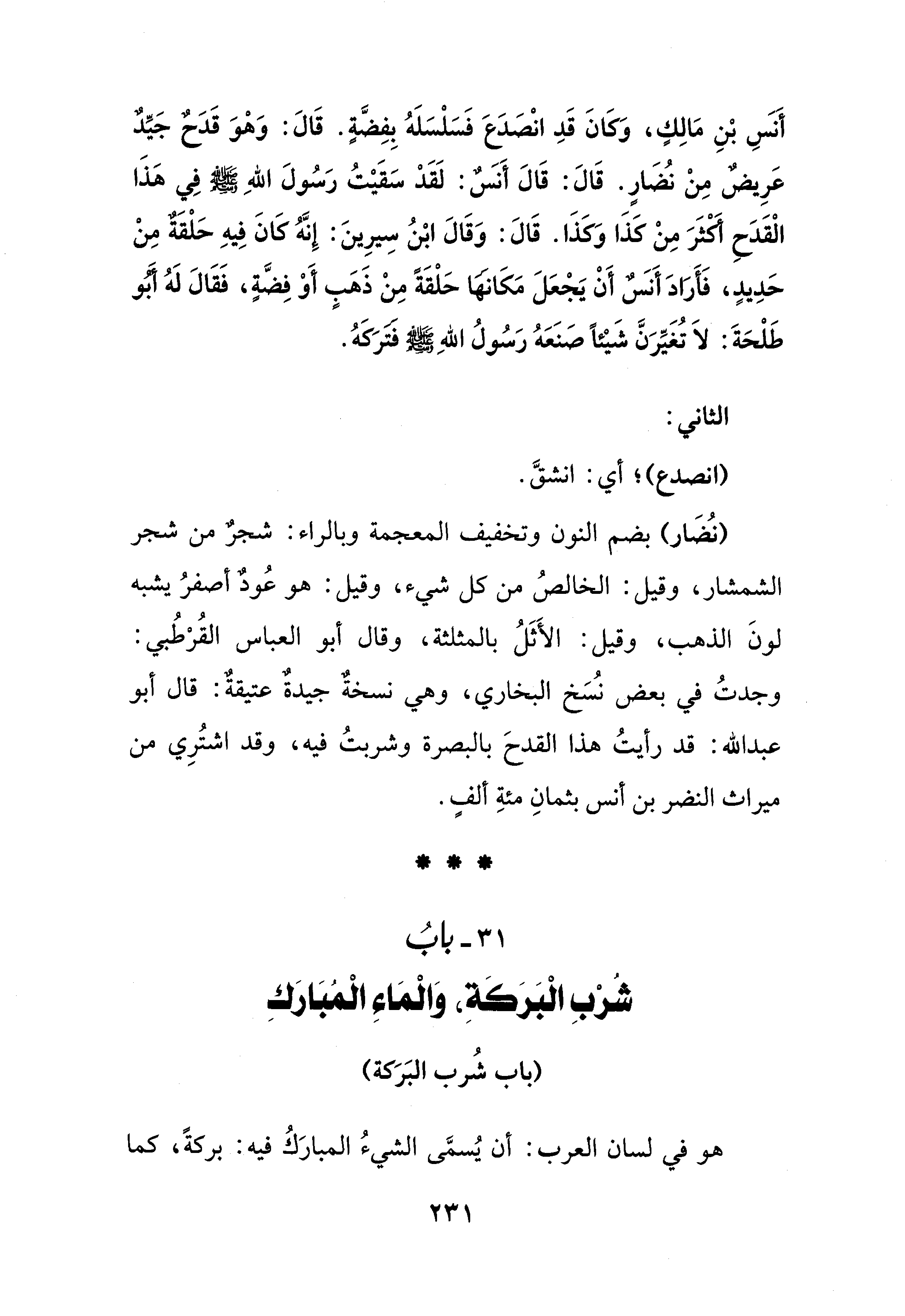 أَنس بْنِ مَالِكٍ، وَكَانَ قَدِ انْصَدَع فَسَلْسَلَهُ بِفِضَّةٍ. قَالَ: وَهْوَ قَدَحٌ جَيِّدٌ عَرِيضٌ مِنْ نُضَارٍ. قَالَ: قَالَ أَنسٌ: لَقَدْ سَقَيْتُ رَسُولَ اللهِ - صلى الله عليه وسلم - في هَذَا الْقَدَحِ أكثَرَ مِنْ كَذَا وَكَذَا. قَالَ: وَقَالَ ابْنُ سِيرِينَ: إِنَّهُ كَانَ فِيهِ حَلْقَةٌ مِنْ حَدِيدٍ، فَأَرَادَ أَنسٌ أَنْ يَجْعَلَ مَكَانها حَلْقَةً مِنْ ذَهَبٍ أَوْ فِضَّةٍ، فَقَالَ لَهُ أبو طَلْحَةَ: لَا تُغَيِّرَنَّ شَيْئًا صنَعَهُ رَسُولُ اللهِ - صلى الله عليه وسلم - فترَكَهُ.