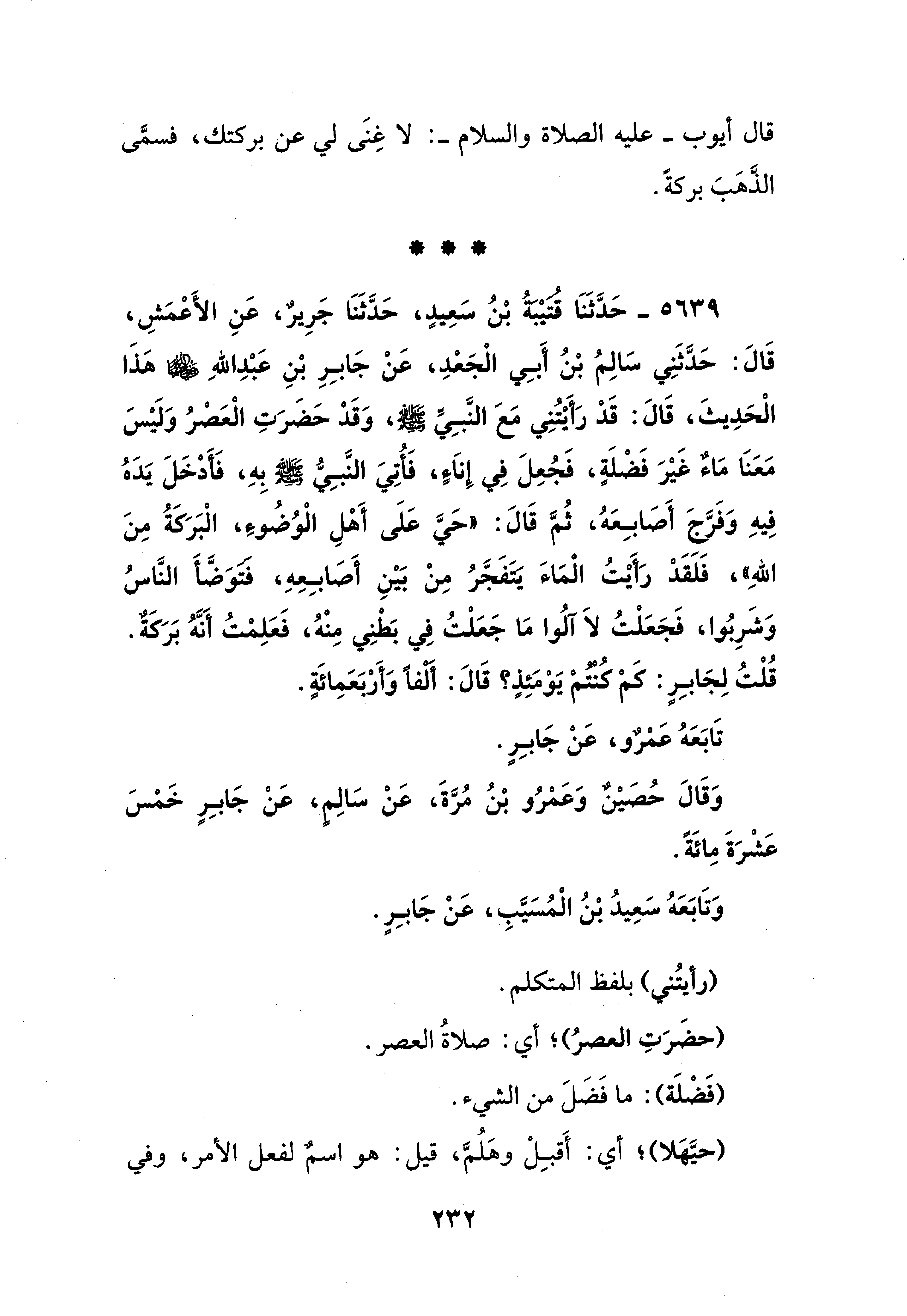 5639 - حَدثَنَا قتيْبةُ بْنُ سَعِيدٍ، حَدَّثَنَا جَرِيرٌ، عَنِ الأَعْمَشِ، قَالَ: حَدَّثَنِي سَالِمُ بْنُ أَبِي الْجَعْدِ، عَنْ جَابِرِ بْنِ عَبْدِ اللهِ - رضي الله عنهما - هَذَا الْحَدِيثَ، قَالَ: قَدْ رَأَيْتُنِي مَعَ النَّبِي - صلى الله عليه وسلم -، وَقَدْ حَضَرَتِ الْعَصْرُ وَلَيْسَ مَعَنَا مَاءٌ غَيْرَ فَضْلَةٍ، فَجُعِلَ في إِنَاءٍ، فَأُتِيَ النَّبِيُّ - صلى الله عليه وسلم - بِهِ، فَأَدْخَلَ يَدَهُ فِيهِ وَفَرَّجَ أَصَابِعَهُ، ثُمَّ قَالَ: "حَيَّ عَلَى أَهْلِ الْوُضُوءِ، الْبَرَكَةُ مِنَ اللهِ"، فَلَقَدْ رَأَيْتُ الْمَاءَ يتفَجَّرُ مِنْ بَيْنِ أَصابِعِهِ، فتوَضَّأَ النَّاسُ وَشَرِبُوا، فَجَعَلْتُ لَا آلُوا مَا جَعَلْتُ في بَطْنِي مِنْهُ، فَعَلِمْتُ أَنَّهُ بَرَكَةٌ. قُلْتُ لِجَابِرٍ: كَمْ كنتمْ يَوْمَئِذٍ؟ قَالَ: "ألفًا وَأَرْبَعَمِائَةٍ.