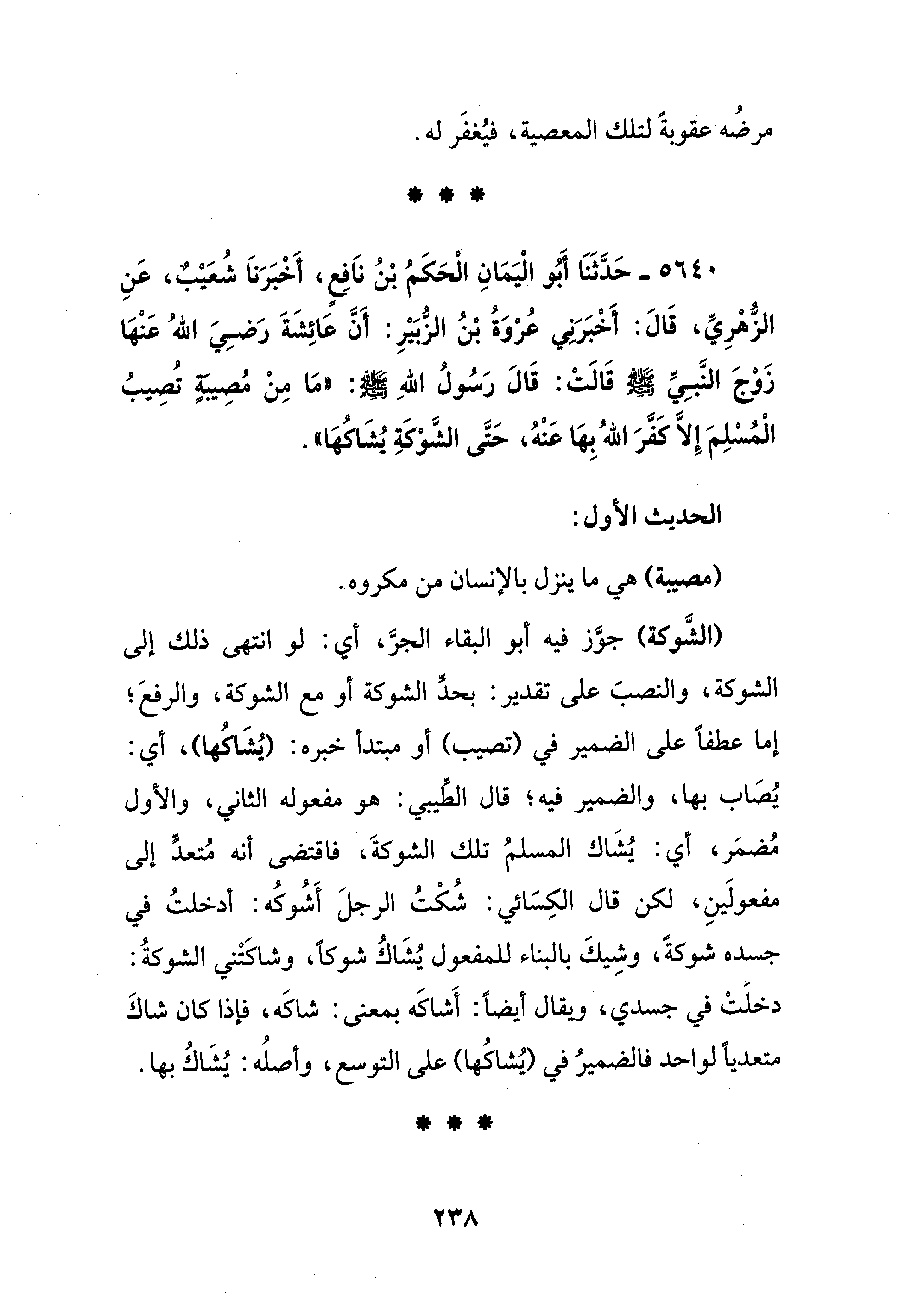 5640 - حَدَّثَنَا أَبُو الْيَمَانِ الْحَكَمُ بْنُ نَافِعٍ، أَخْبَرَنَا شُعَيْبٌ، عَنِ الزُّهْرِيِّ، قَالَ: أَخْبَرَنِي عُرْوَةُ بْنُ الزُّبَيْرِ: أَنَّ عَائِشَةَ رَضِيَ اللهُ عَنْهَا زَوْجَ النَّبِيِّ - صلى الله عليه وسلم - قَالَتْ: قَالَ رَسُولُ اللهِ - صلى الله عليه وسلم -: "مَا مِنْ مُصِيبةٍ تُصِيبُ الْمُسْلِمَ إِلَّا كفَّرَ اللهُ بِهَا عَنْهُ، حَتَّى الشَّوْكَةِ يُشَاكُهَا".